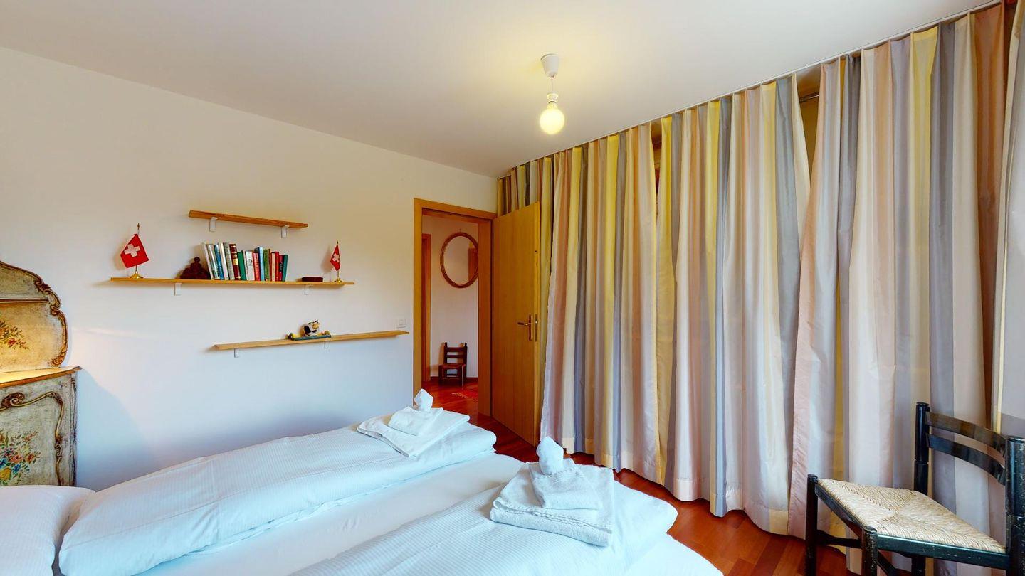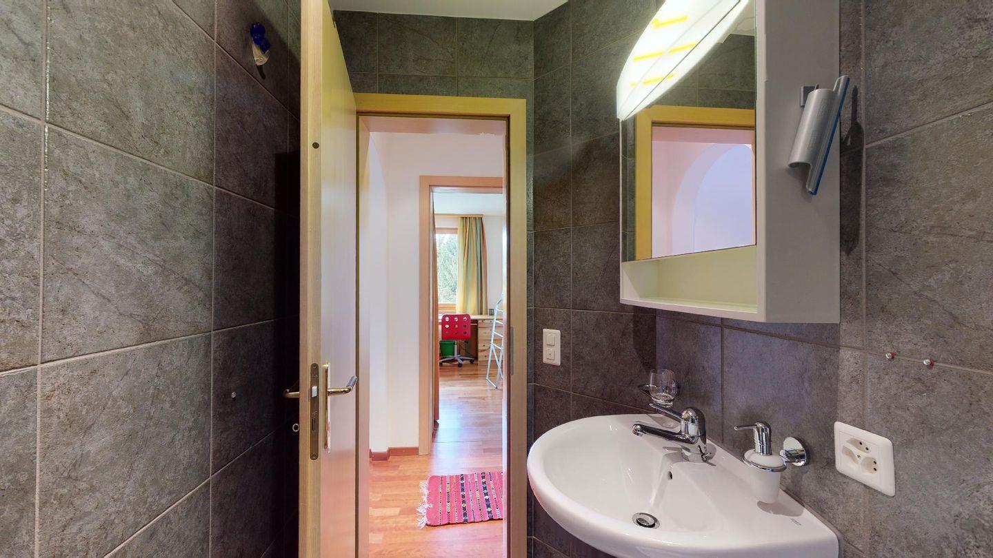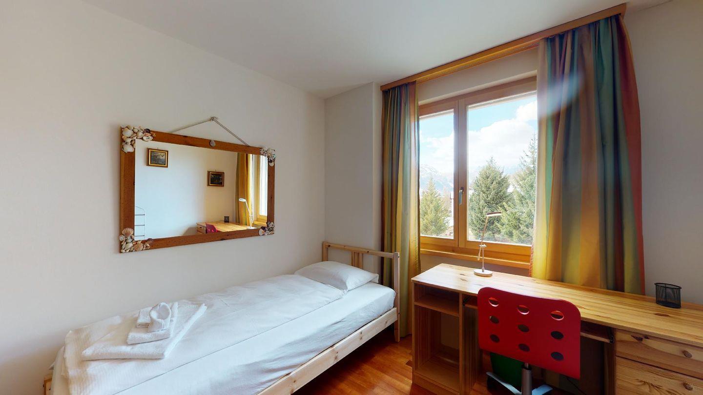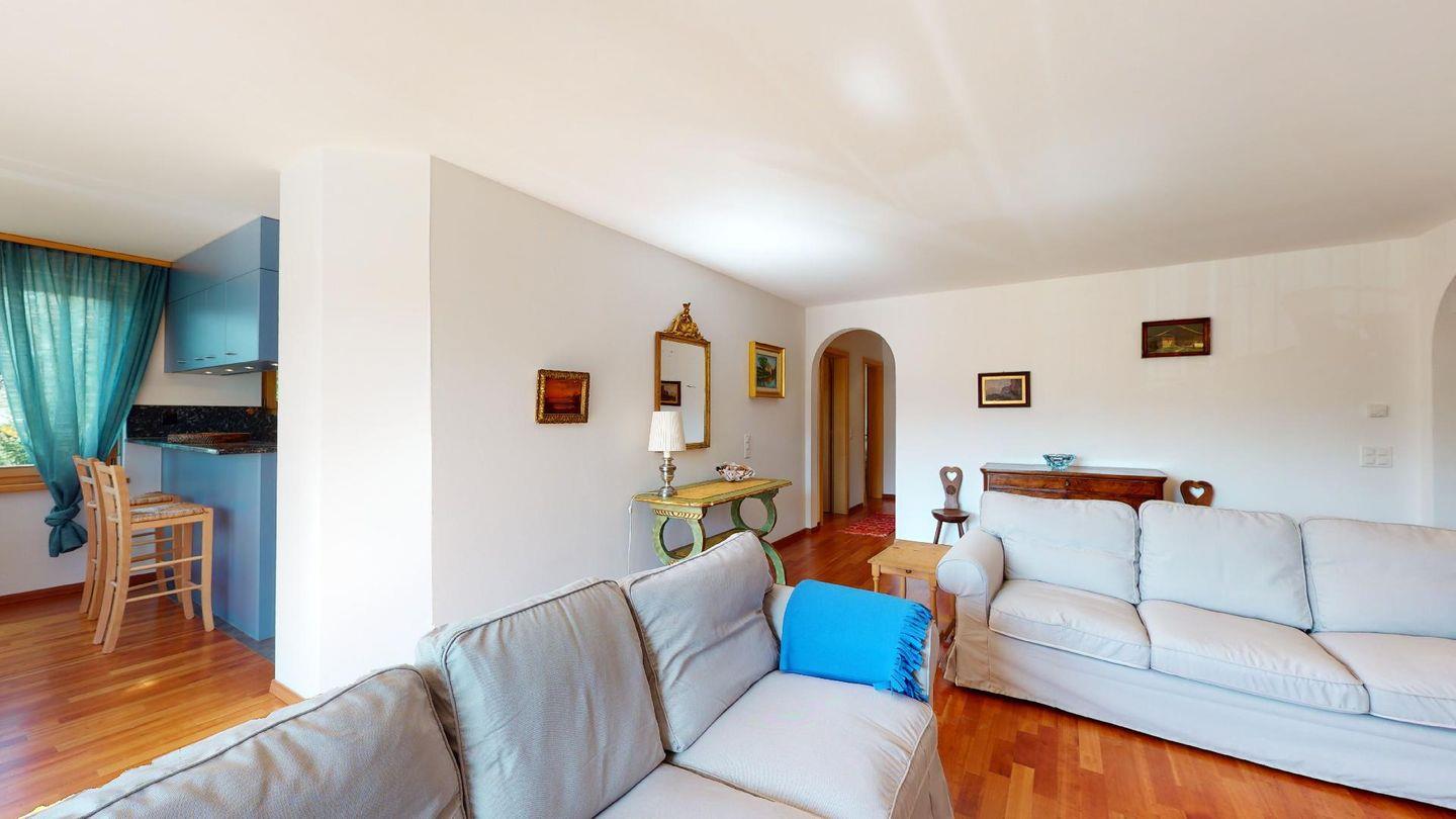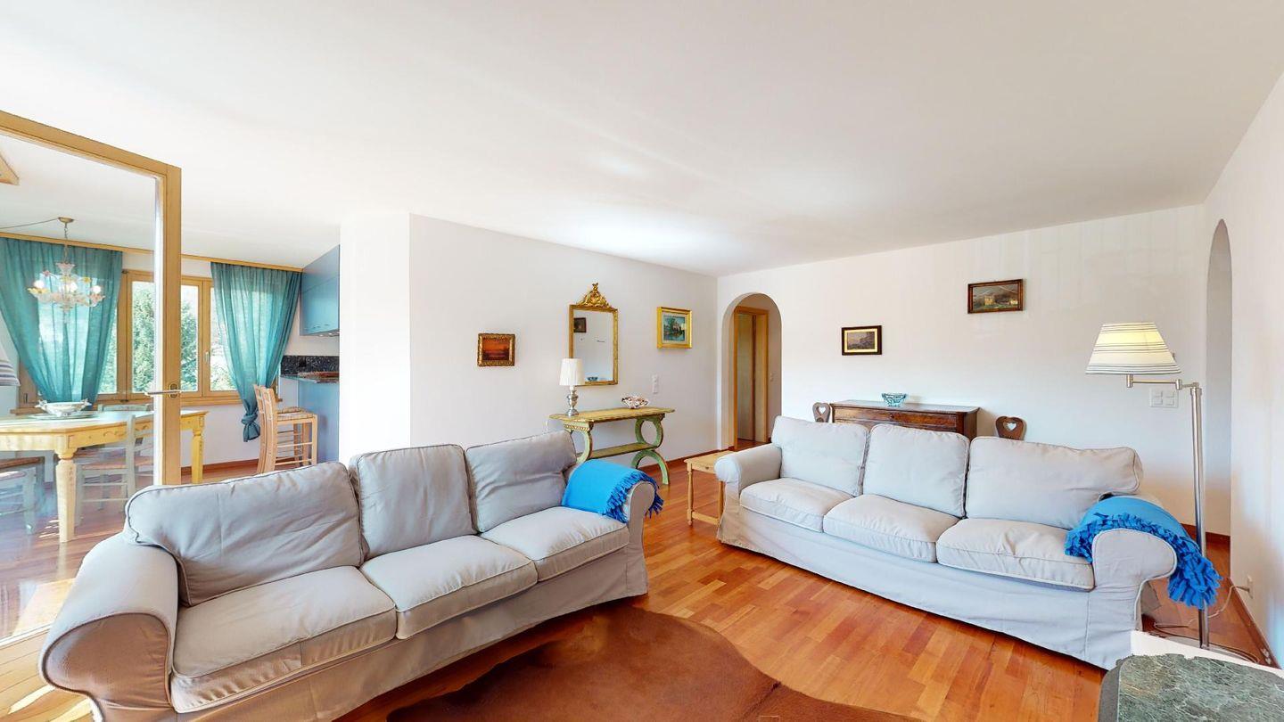 4½-Zimmerwohnung im 1. Stock. Eingang mit Garderobe. Wohnzimmer mit Balkon mit Blick zur Julierkette, Cheminée, TV, Internet und Essecke. Küche zum Wohnzimmer offen, mit Backofen, Herd, Geschirrspüler, Waschmaschine und Tumbler. Ein Doppelschlafzimmer (160cm x 195cm). Ein Doppelschlafzimmer (180cm x 200cm) und ein Einzelzimmer (90cm x 200cm). Ein Badezimmer mit Wanne, Toilette, Lavabo, Bidet und Fenster. Ein Badezimmer mit Dusche, Toilette, Lavabo und Bidet. 2 Parkplätze in der Tiefgarage. Haustiere sind erlaubt. Gemeinsamer Ski- und Veloraum.