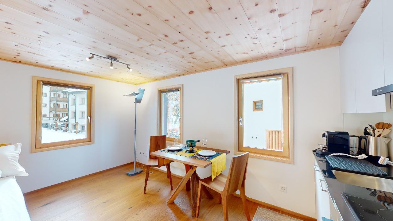 Frisch renoviertes Studio in Pontresina mit alpinem Stil, viel Holz und modernen Materialien. Küche und Schlafbereich im selben Raum, WLAN vorhanden. Gartensitzplatz im Sommer nutzbar. In der Nähe von Sessellift und Dorfzentrum.