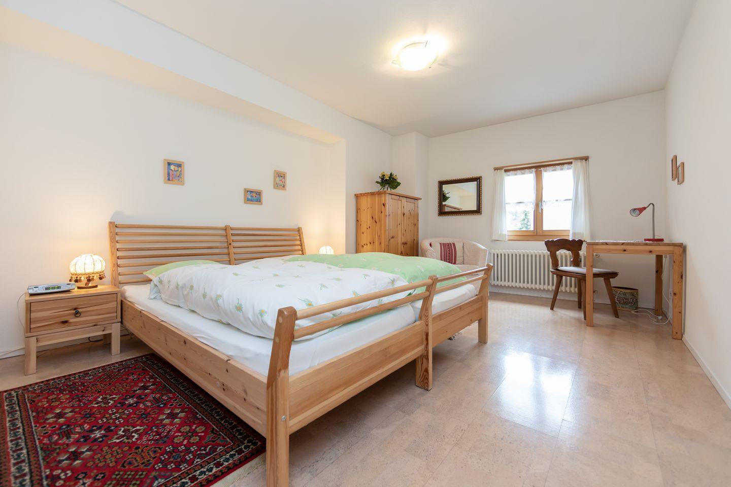 Ein helles Wohnzimmer mit bequemer Sitzgruppe sowie Fernsehecke. Geräumige und moderne Küche mit bester Infrastruktur. Essbereich mit ausreichend Geschirr und Besteck sowie Nespresso Maschine. Doppelschlafzimmer mit genügend Stauraum für Kleider, Wäsche etc. sowie Schreibtisch mit Leselampe. Badezimmer mit Badewanne. Abstellraum für Ski und Sportgeräte im Untergeschoss des Hauses.