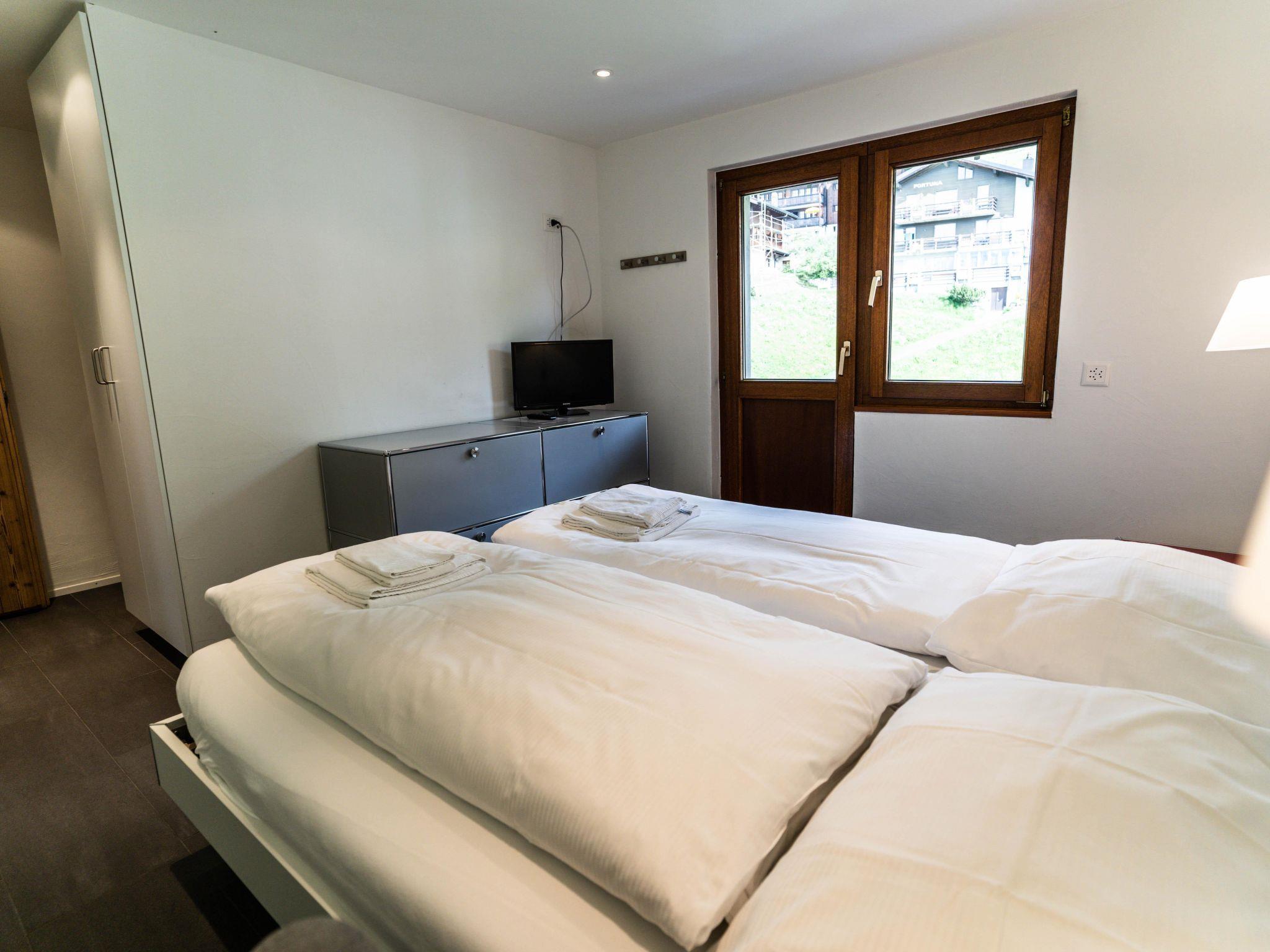 The apartment on the 2nd floor of the Sportina house accommodates 1 to 5 people and combines modern comfort with a cozy atmosphere. It features two bedrooms with double beds, one of which is additionally equipped with its own shower/WC. The living room contains a dining table and a fold-out bed. The main bathroom is equipped with a bathtub and WC. The open kitchen is furnished with a dishwasher and a Nespresso coffee machine. Underfloor heating, TV and free Wi-Fi provide additional comfort. Two balconies facing south and west offer views of the Valais Alps. An elevator, a ski room with a boot dryer and a laundry room in the basement are available.