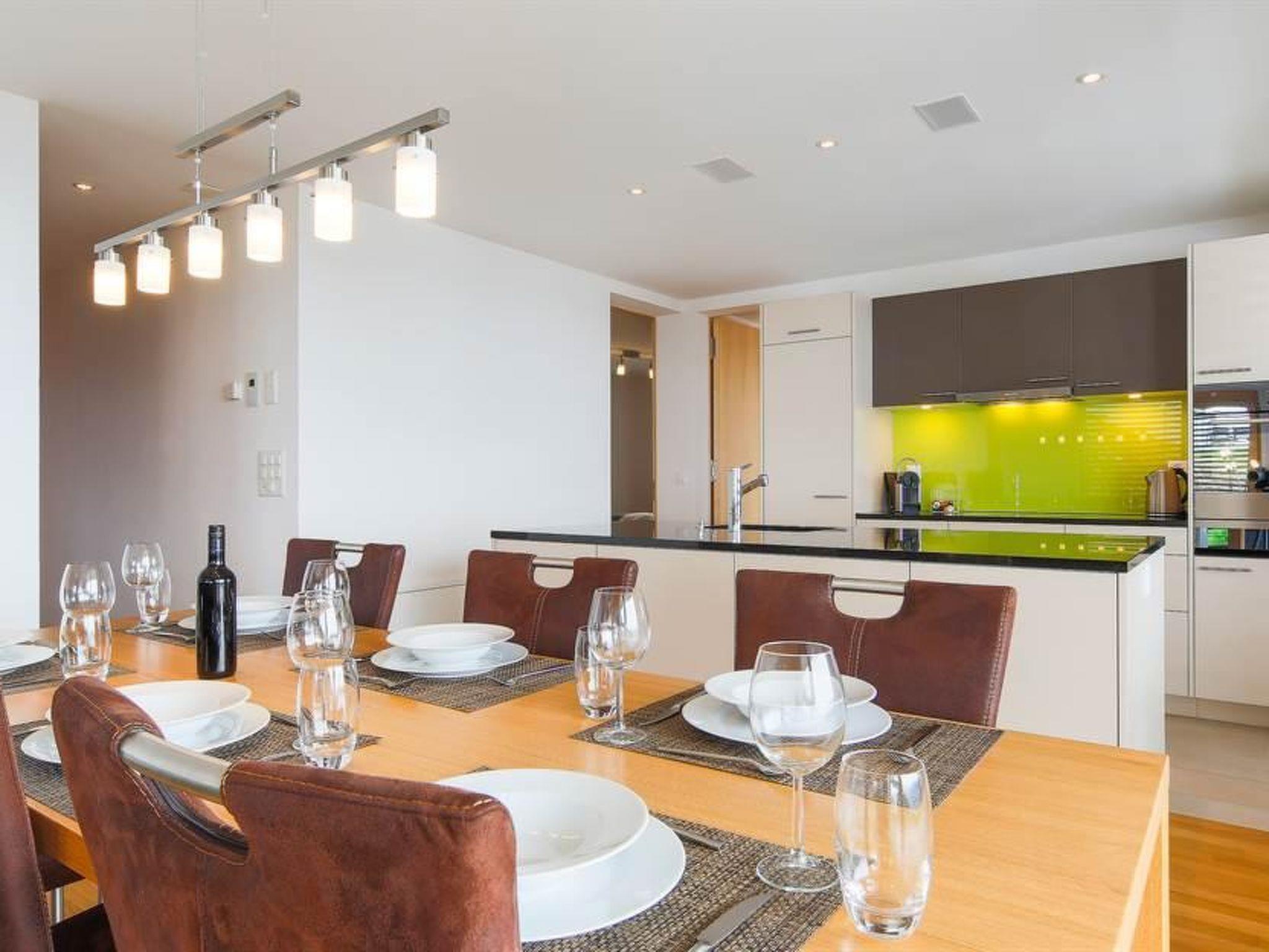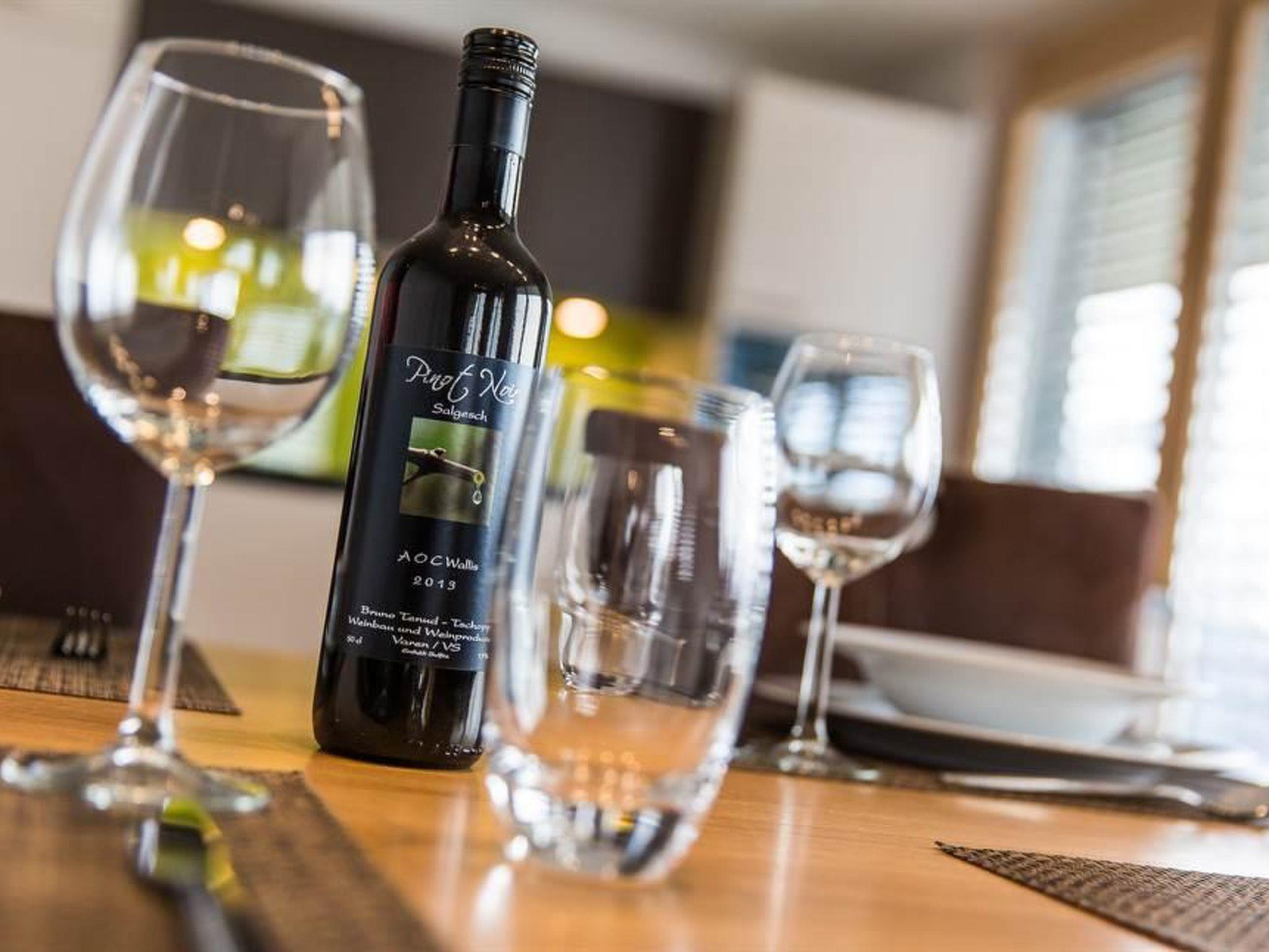 The 4 1/2 room apartment features three bedrooms, two bathrooms and an open living and dining area. One bedroom is equipped with a double bed, while the other two each have two single beds. The bathrooms offer WC/shower as well as WC/bathtub with shower. The open kitchen is luxuriously equipped and adjoins a spacious dining area. In the living area, there is a sofa with pull-out function and a television with satellite connection. The large south-facing terrace with garden furniture offers a view of the surrounding Valais mountains. A shared ski and bike room is available.