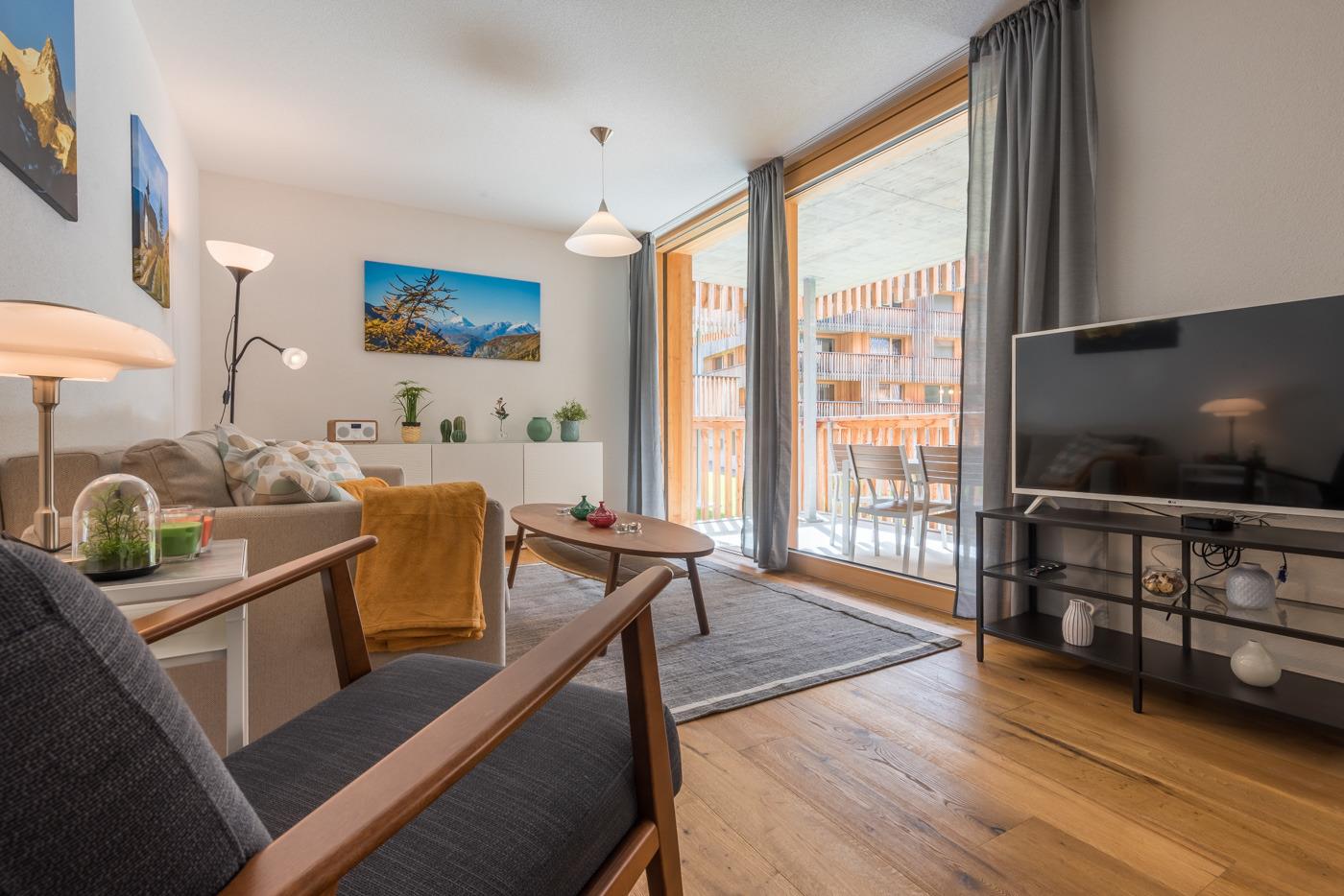 Die modernen Wohnungen sind geschmackvoll, gut und hell eingerichtet, sehr gute Ausstattung. Jeweils Kabel-Flat-TV (Apple-TV) und Radio. Die Küchen sind sehr gut und vollständig ausgestattet mit Einbauhherd (4 Ceranfelder), Backofen, Mikrowelle, Geschirrspüler, Kühl-/Gefrierkombination, Filter-Kaffeemaschine, Nespresso-Kapsel-Kaffeemaschine, Wasserkocher, Toaster, Fondue-Rechaud und Raclette-Gerät. Holzdielenböden im Wohnraum und Schlafzimmern mit Fußbodenheizung. Jedes Bad mit Haartrockner.