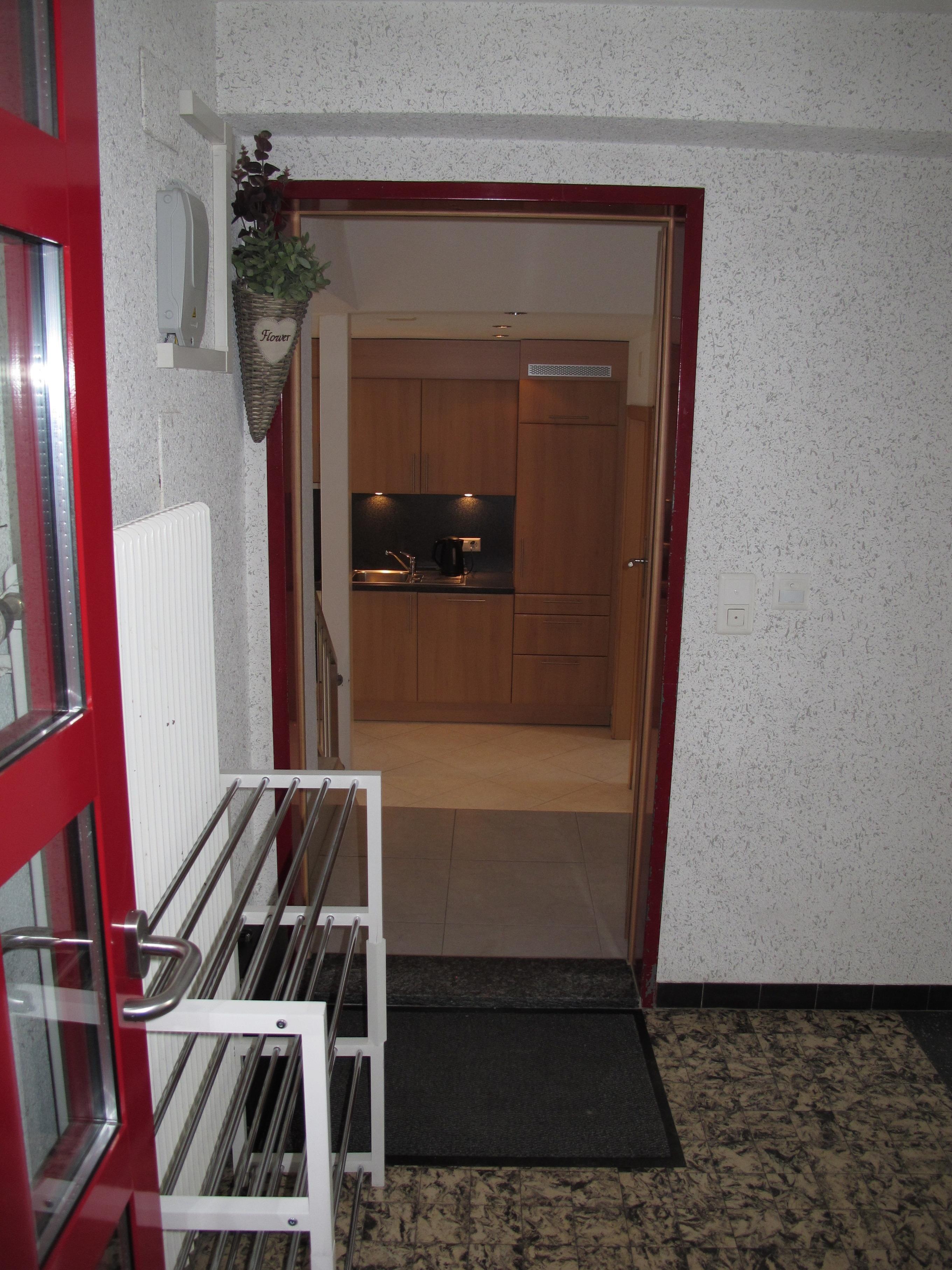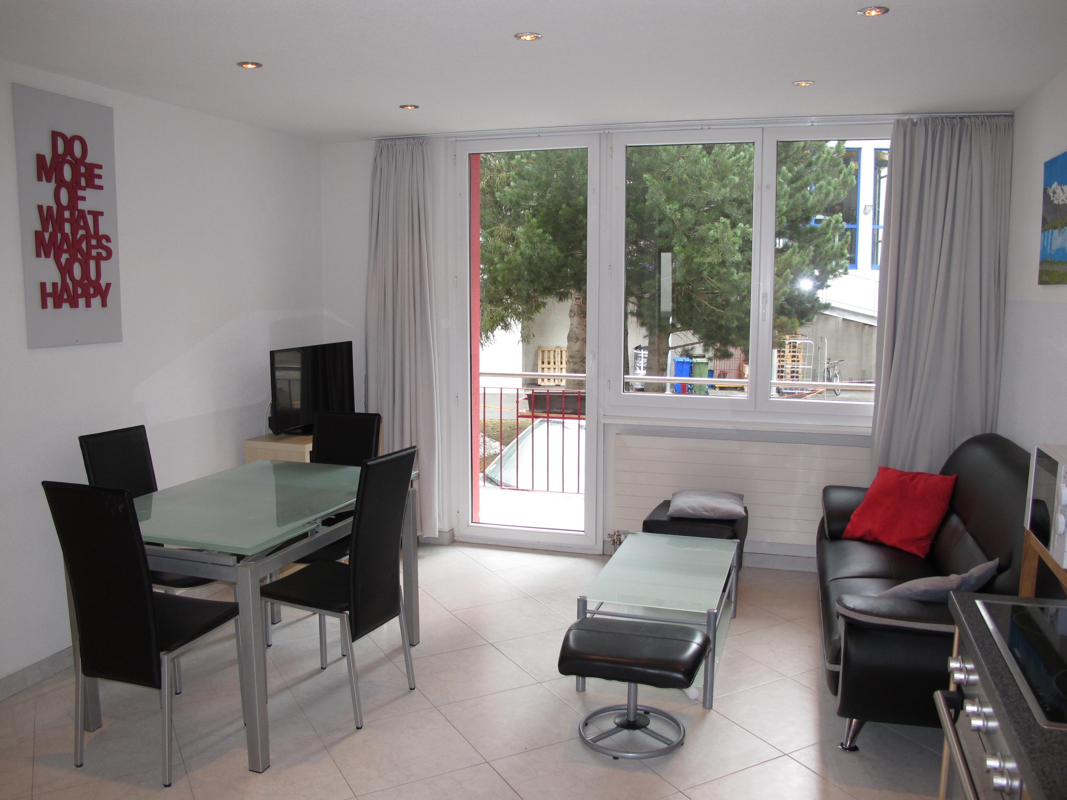 Aufzug direkt zur Etage:Zugang zu Wohnraum über 3 Treppenstufen. Wohnraum mit gemütlicher Ledersitzgruppe, Kabel-TV, Eßplatz und Balkonausgang (Süd). Offene, sehr gut ausgestattete Küchenzeile mit Einbauherd (4 Ceranfelder, Backofen), Geschirrspüler, Mikrowelle, Kühlschrank mit Gefrierfach, Toaster, Wasserkocher, Kaffeemaschine, Nespresso-Kaffeemaschine, Fondue-Rechaud und Raclette-Gerät. gemütliche Doppelzimmer. Große Dusche/WC mit 2 Waschbecken.
