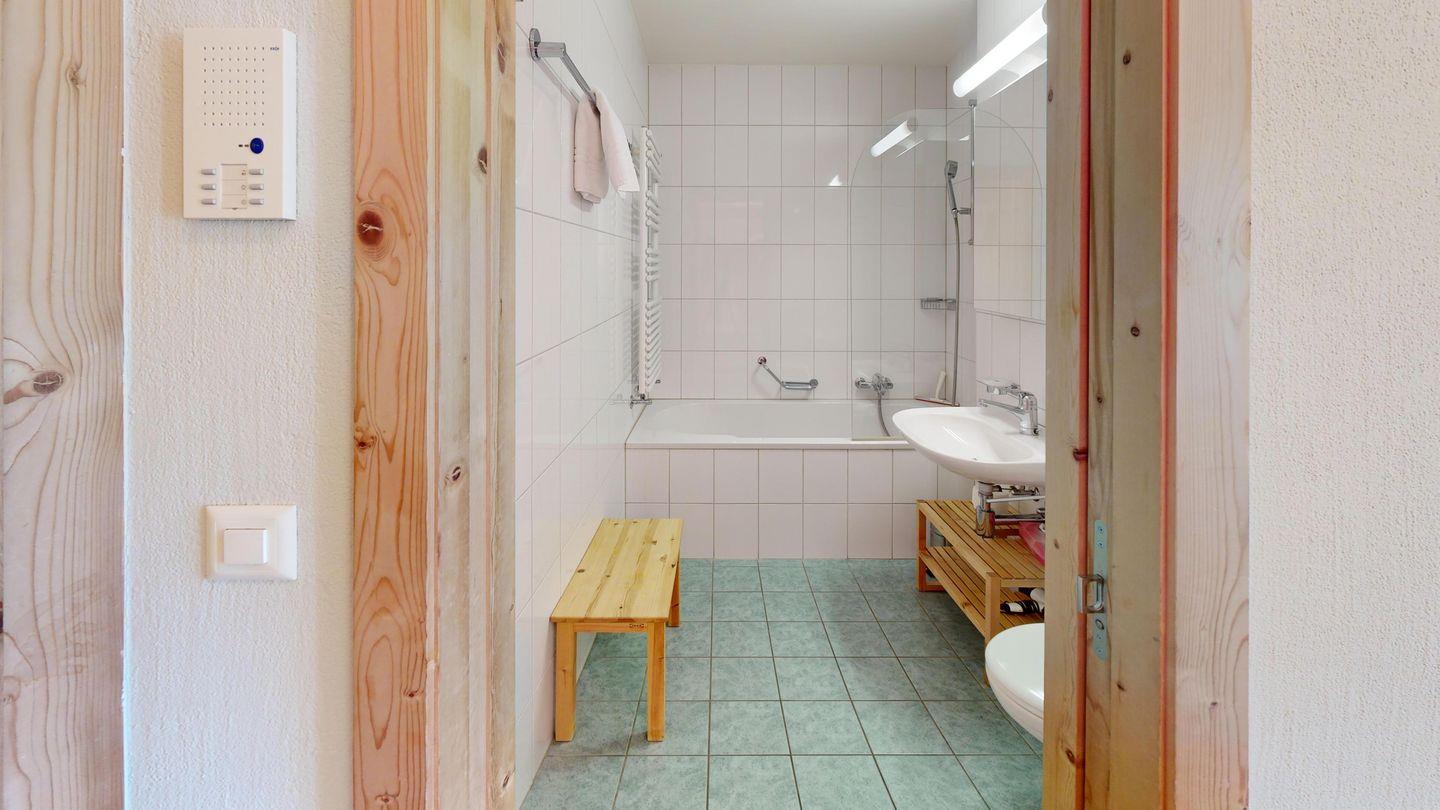 Die 2.5 Zimmerwohnung verfügt über ein Schlafzimmer mit komfortablem Doppelbett und einer hochwertigen Matratze, die für einen erholsamen Schlaf sorgt. Das Badezimmer ist mit einer Badewanne und Duschvorrichtung ausgestattet. Im Wohnzimmer befinden sich ein gemütliches Sofa und ein Fernseher, während die Essecke den Wohnbereich abrundet. Die komplett ausgestattete Küche ist mordern eingerichtet mit hochwertigen Utensilien. Der nach Süden gerichtete Balkon mit freier Sicht auf die Berge rundet die Wohnung ab.