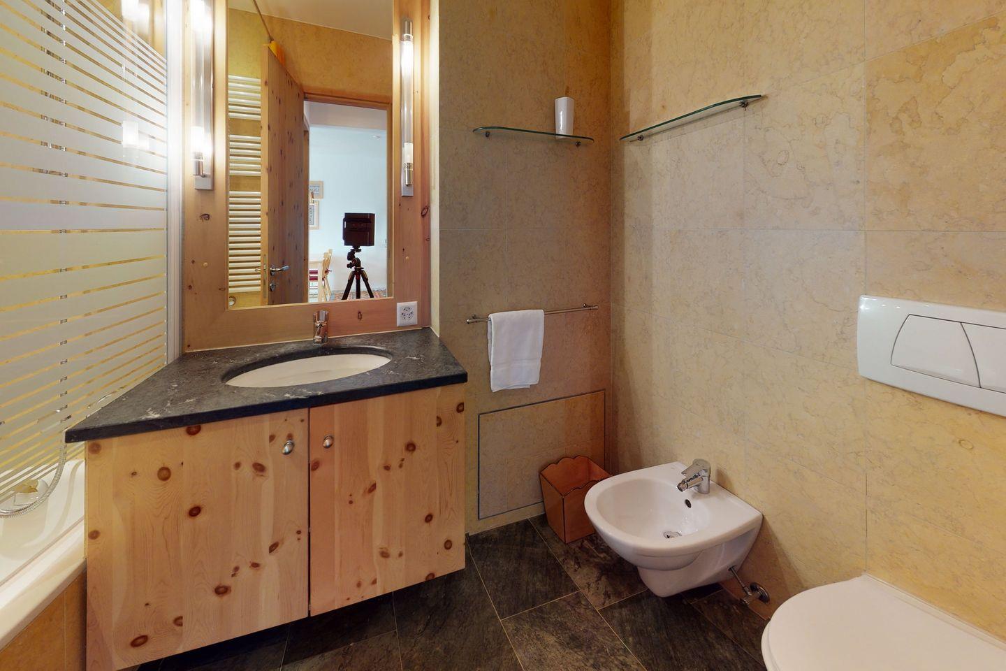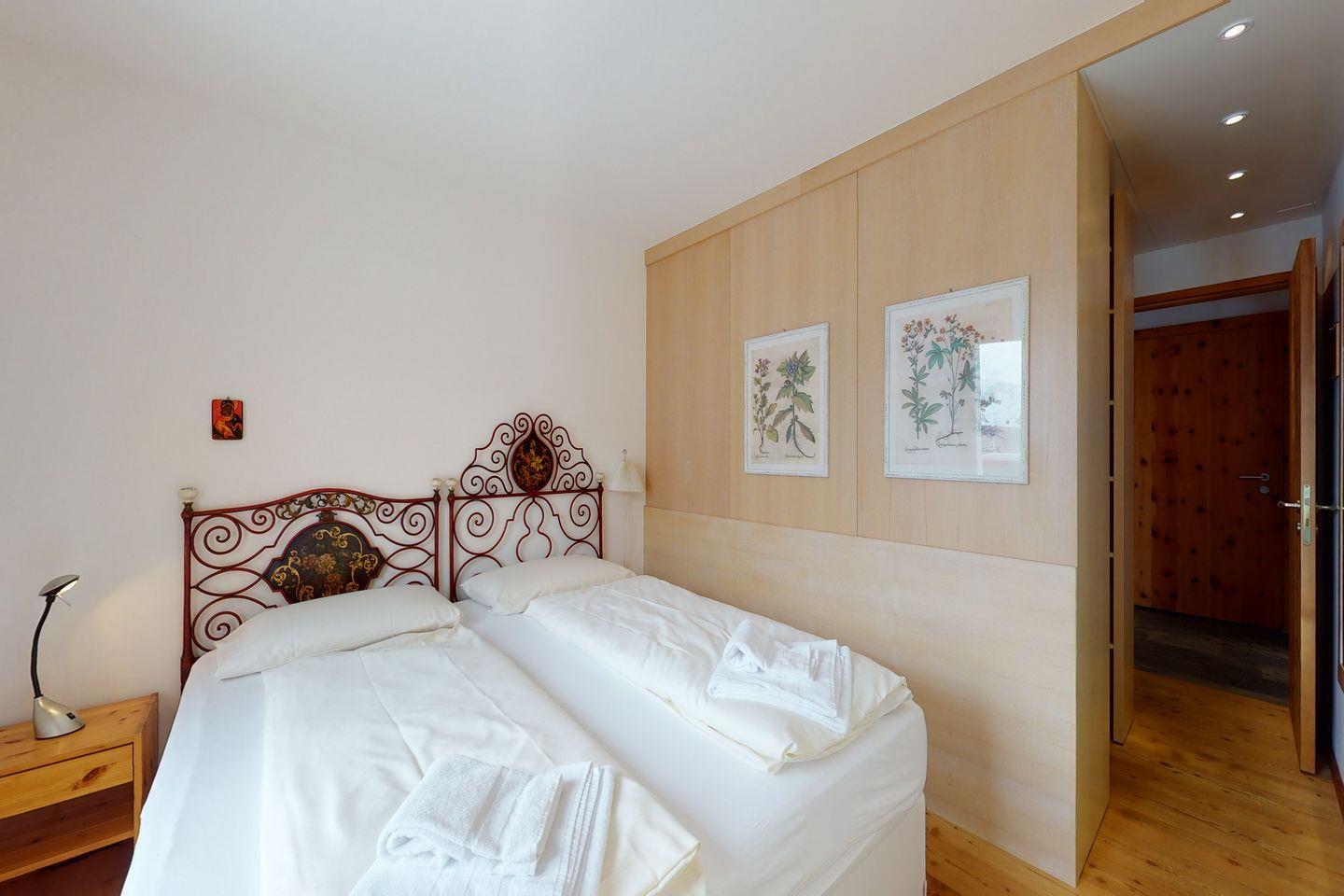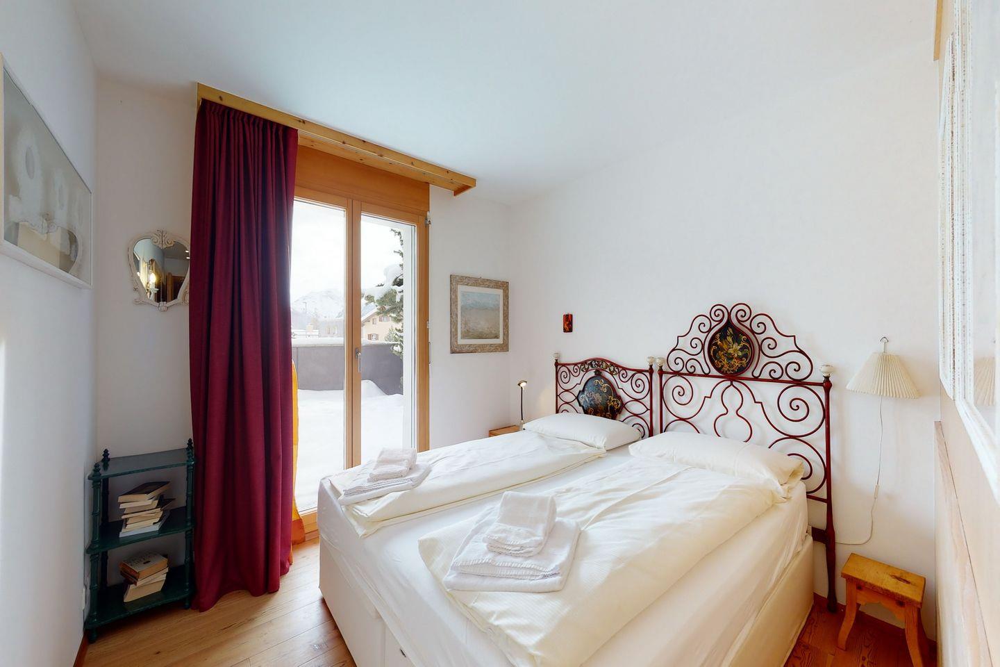 2-Zimmer-Wohnung oberhalb von Samedan, ruhige und sonnige Lage. Schlafzimmer mit Doppelbett und begehbarem Schrank, Wohnzimmer mit offener Küche, Badezimmer mit Badewanne. Terrasse zur alleinigen Nutzung, Garagenparkplatz vorhanden.