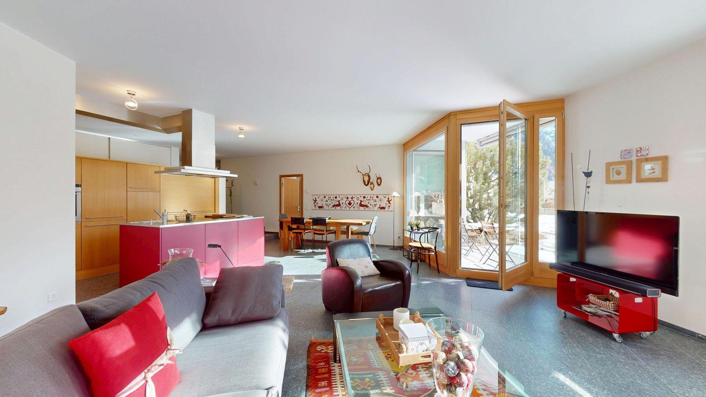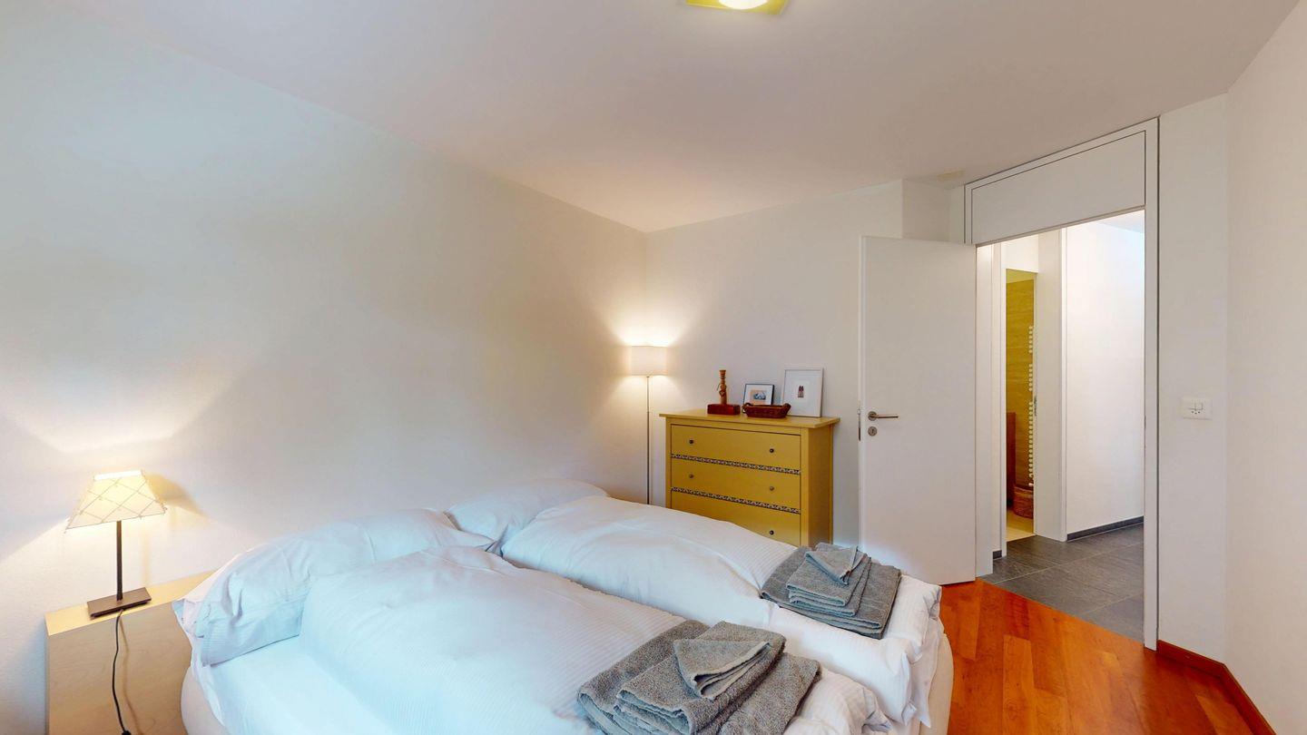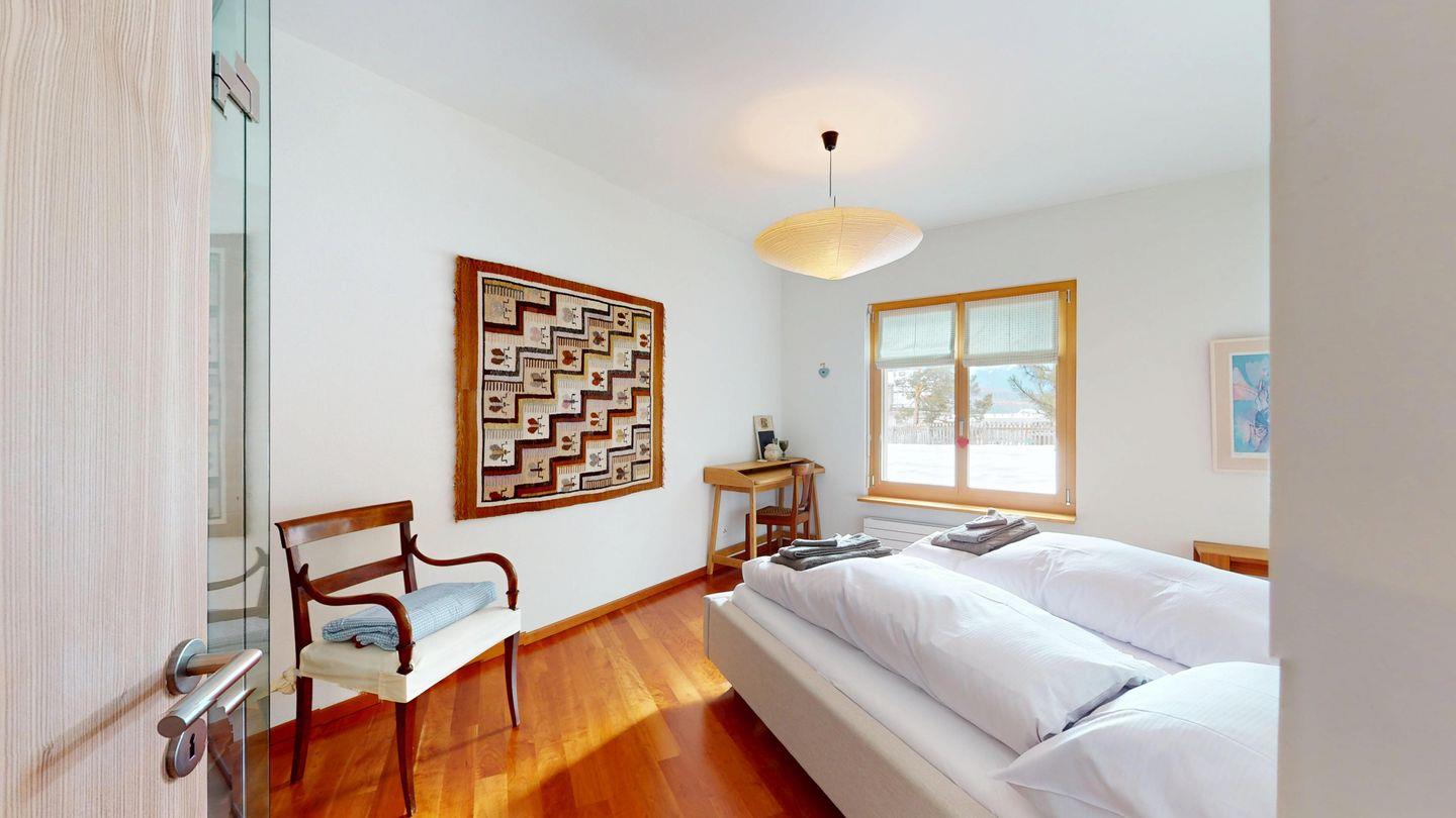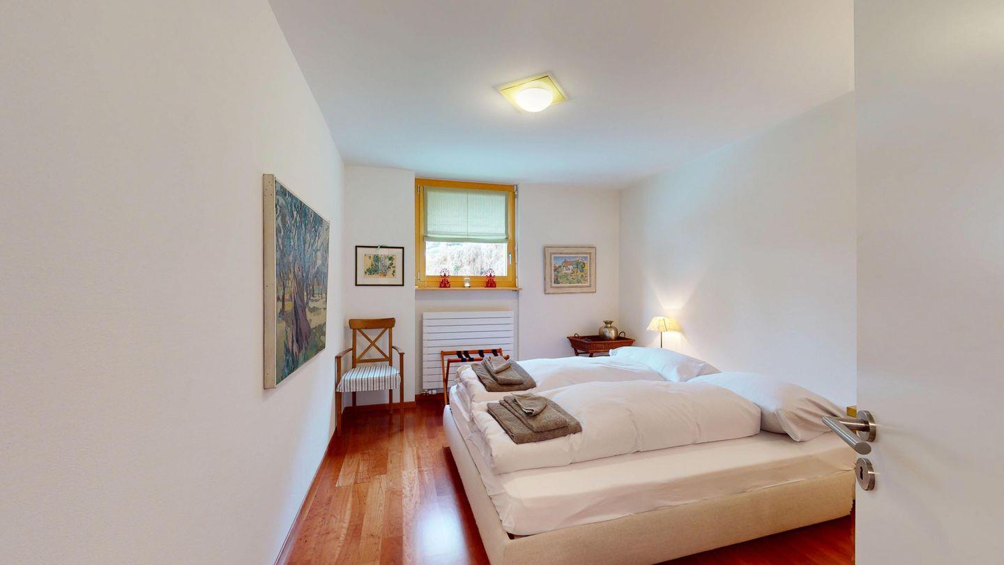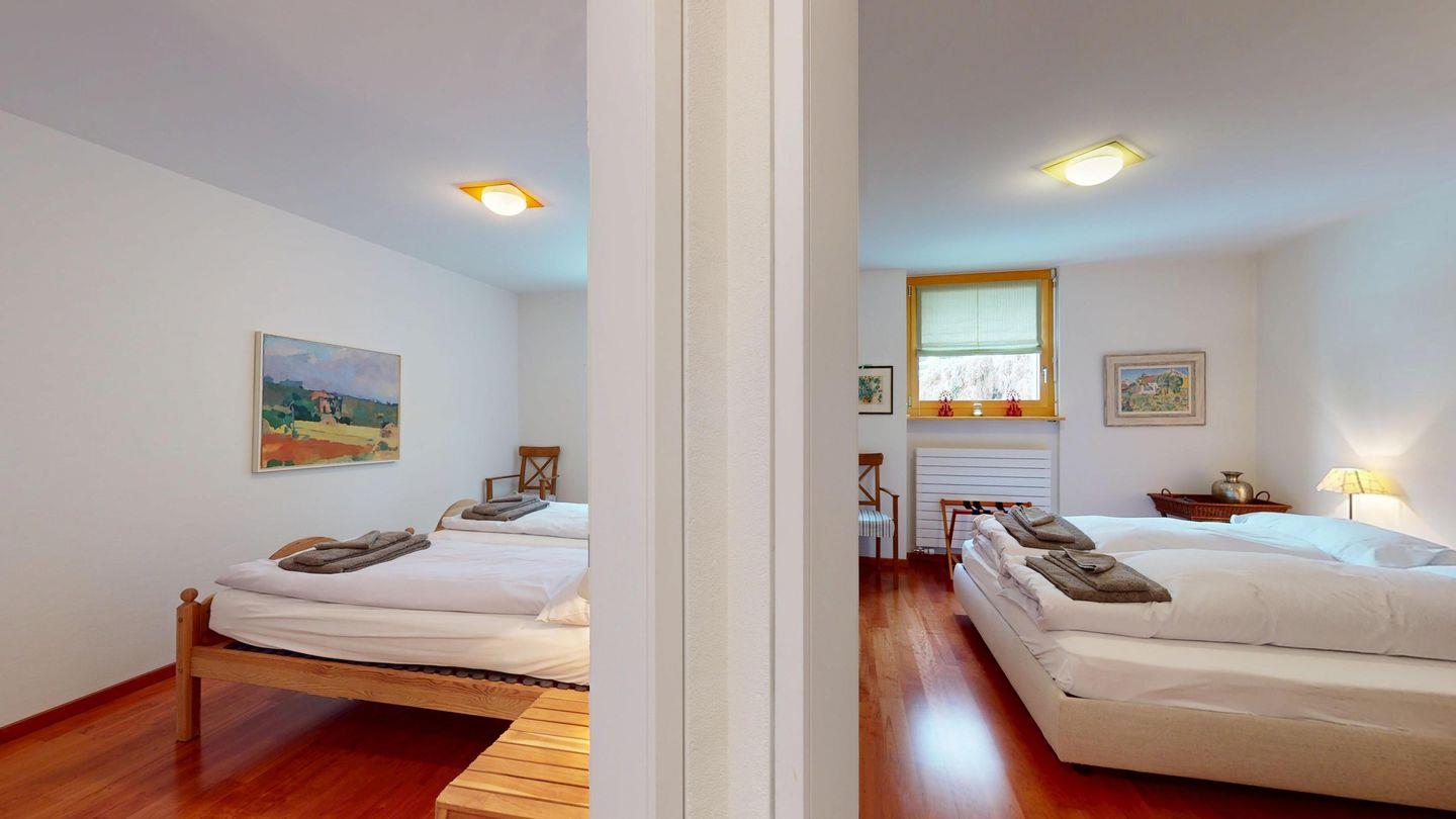 Grosszügige 4½-Zimmerwohnung im Erdgeschoss. Eingang mit Garderobe. Sonniges Wohnzimmer mit Zugang zur Südterrasse, und Essbereich. Offene Küche mit Herd, Backofen und Kühlschrank. Zwei Doppelschlafzimmer, eines davon mit eigenem Badezimmer (Dusche, WC, Lavabo). Ein Schlafzimmer mit zwei Einzelbetten. Ein zweites Badezimmer mit Badewanne, Dusche, Lavabo und WC. Gemeinschaftliche Waschmaschine/Tumbler. Ein Parkpatz. Haustiere sind nicht erlaubt. Nichtraucherwohnung.