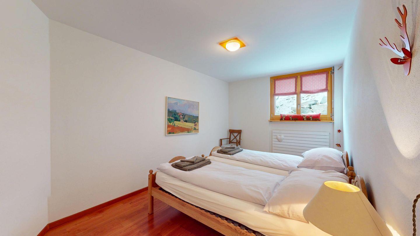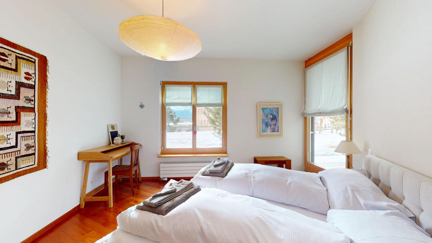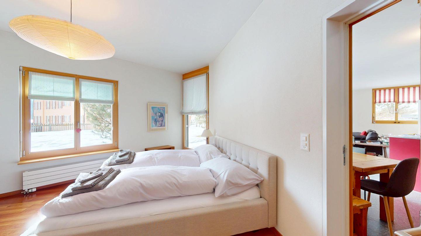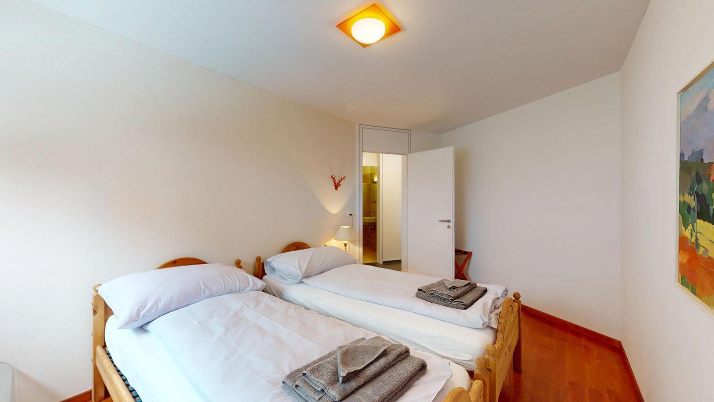 Grosszügige 4½-Zimmerwohnung im Erdgeschoss. Eingang mit Garderobe. Sonniges Wohnzimmer mit Zugang zur Südterrasse, und Essbereich. Offene Küche mit Herd, Backofen und Kühlschrank. Zwei Doppelschlafzimmer, eines davon mit eigenem Badezimmer (Dusche, WC, Lavabo). Ein Schlafzimmer mit zwei Einzelbetten. Ein zweites Badezimmer mit Badewanne, Dusche, Lavabo und WC. Gemeinschaftliche Waschmaschine/Tumbler. Ein Parkpatz. Haustiere sind nicht erlaubt. Nichtraucherwohnung.