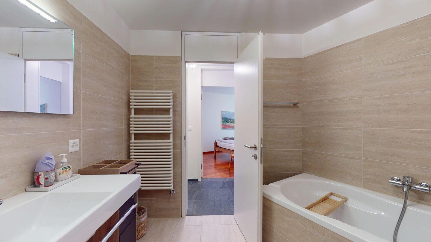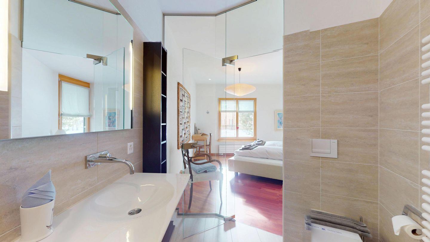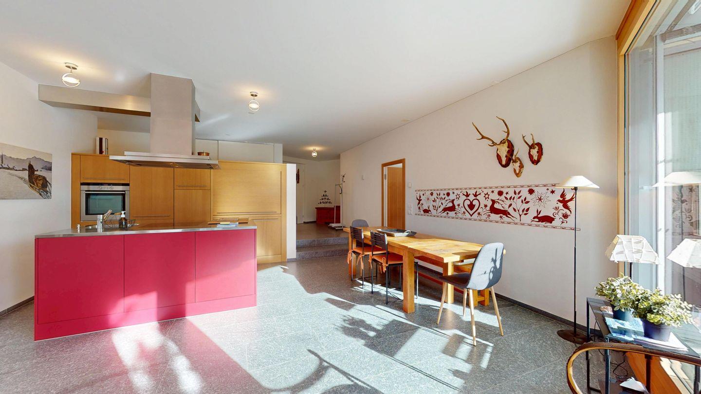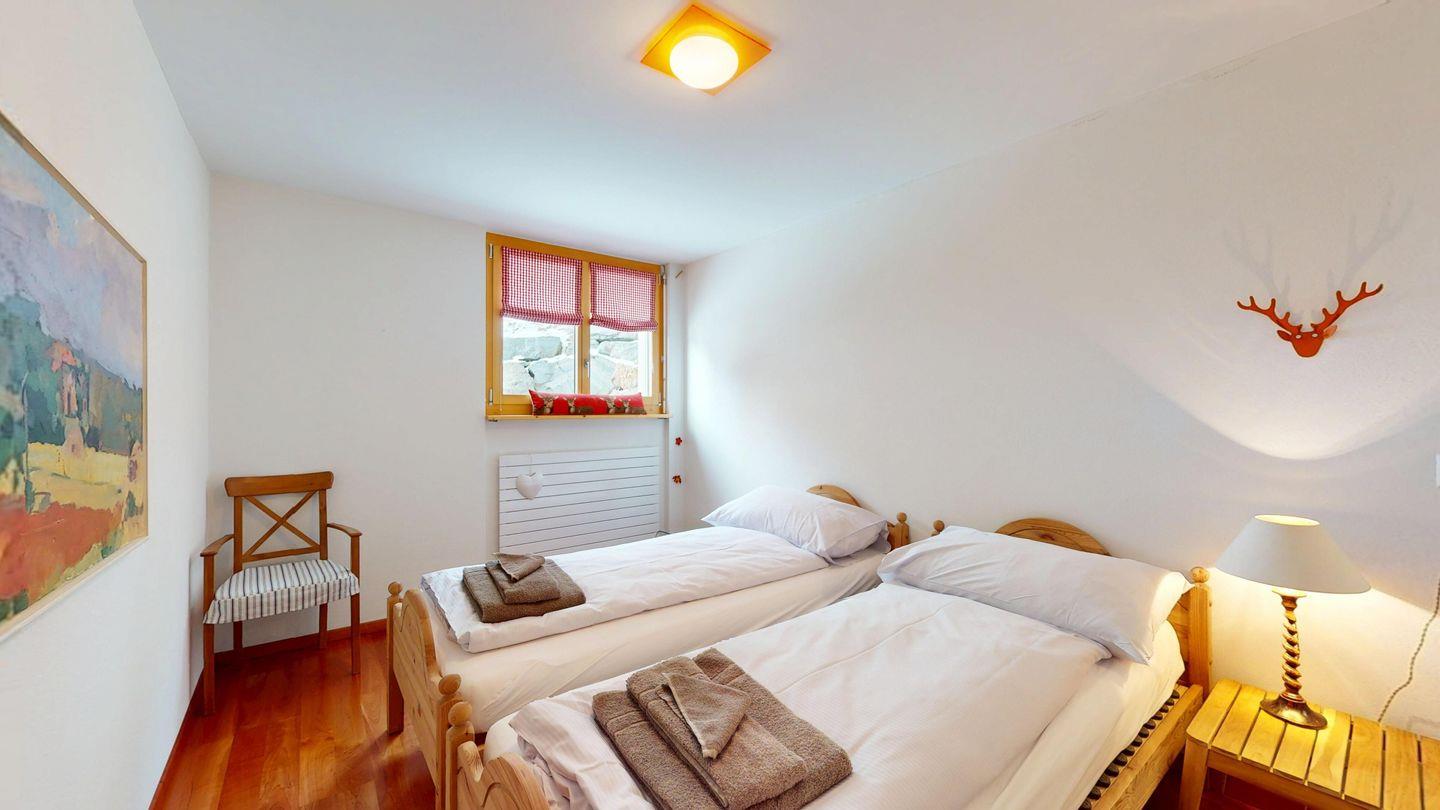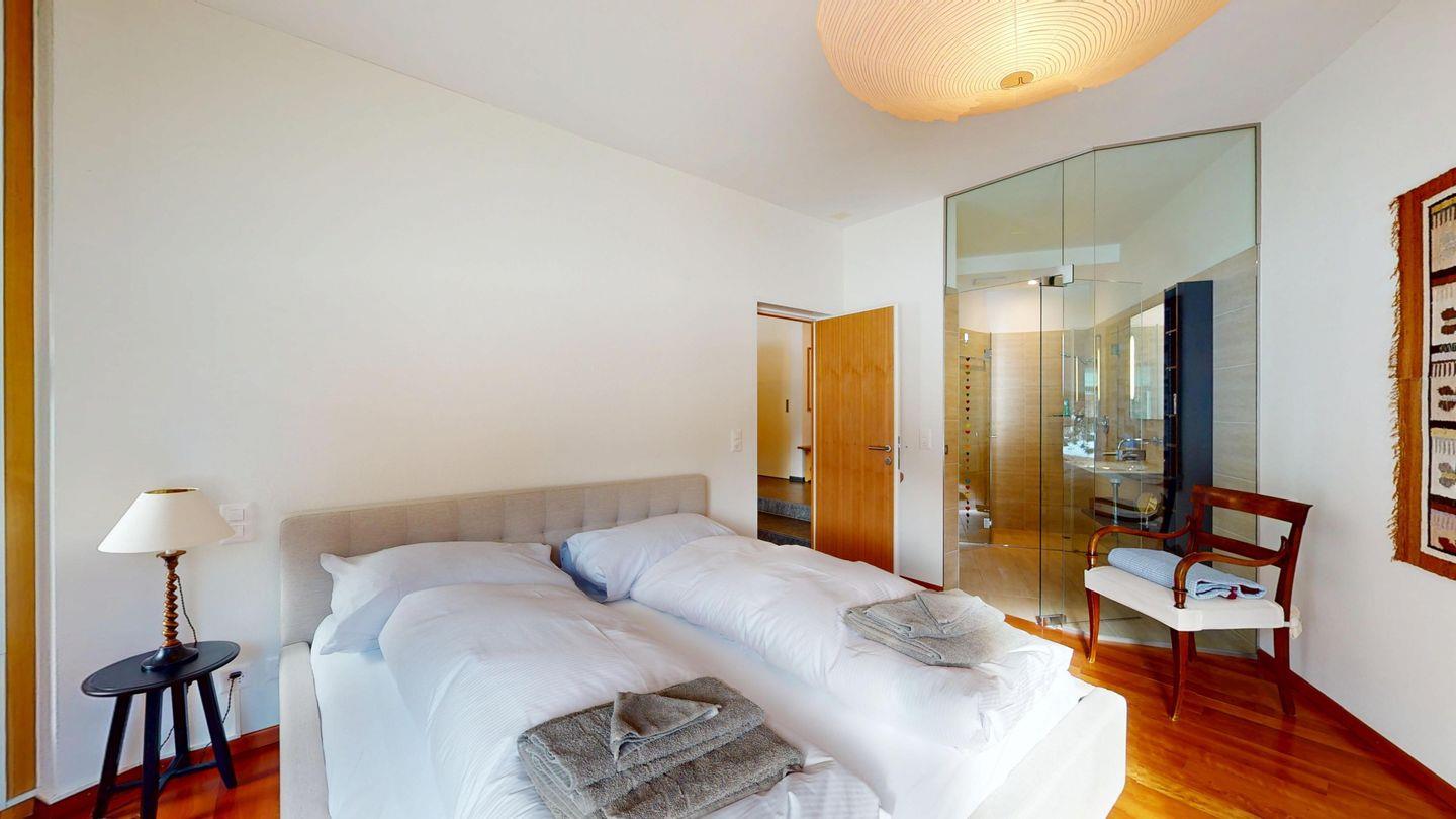 Grosszügige 4½-Zimmerwohnung im Erdgeschoss. Eingang mit Garderobe. Sonniges Wohnzimmer mit Zugang zur Südterrasse, und Essbereich. Offene Küche mit Herd, Backofen und Kühlschrank. Zwei Doppelschlafzimmer, eines davon mit eigenem Badezimmer (Dusche, WC, Lavabo). Ein Schlafzimmer mit zwei Einzelbetten. Ein zweites Badezimmer mit Badewanne, Dusche, Lavabo und WC. Gemeinschaftliche Waschmaschine/Tumbler. Ein Parkpatz. Haustiere sind nicht erlaubt. Nichtraucherwohnung.