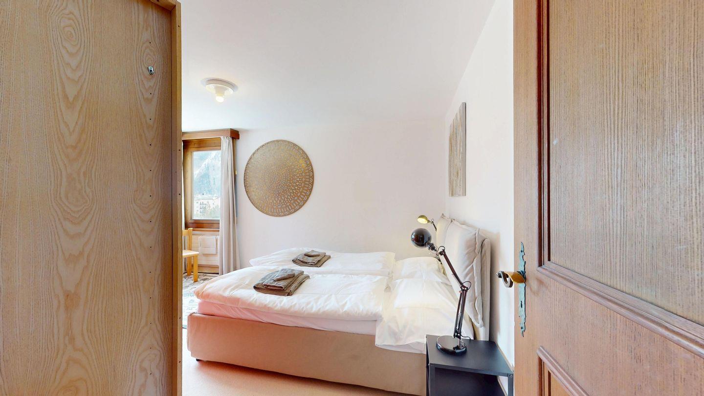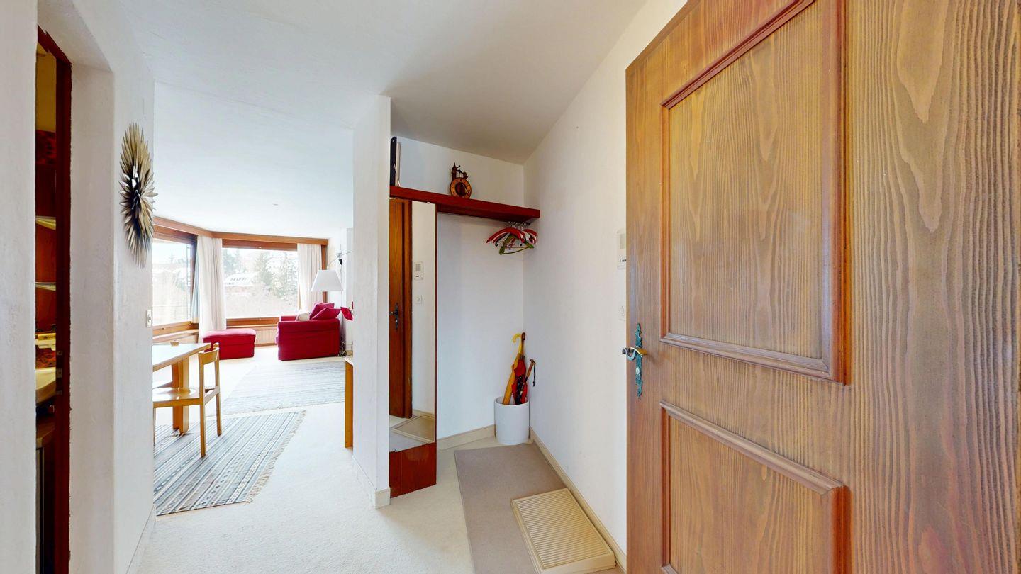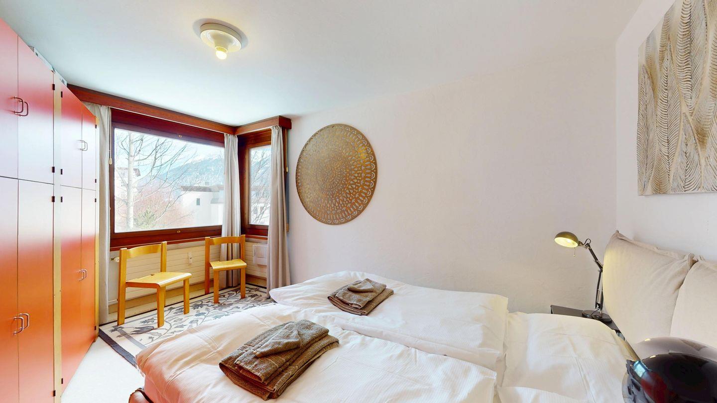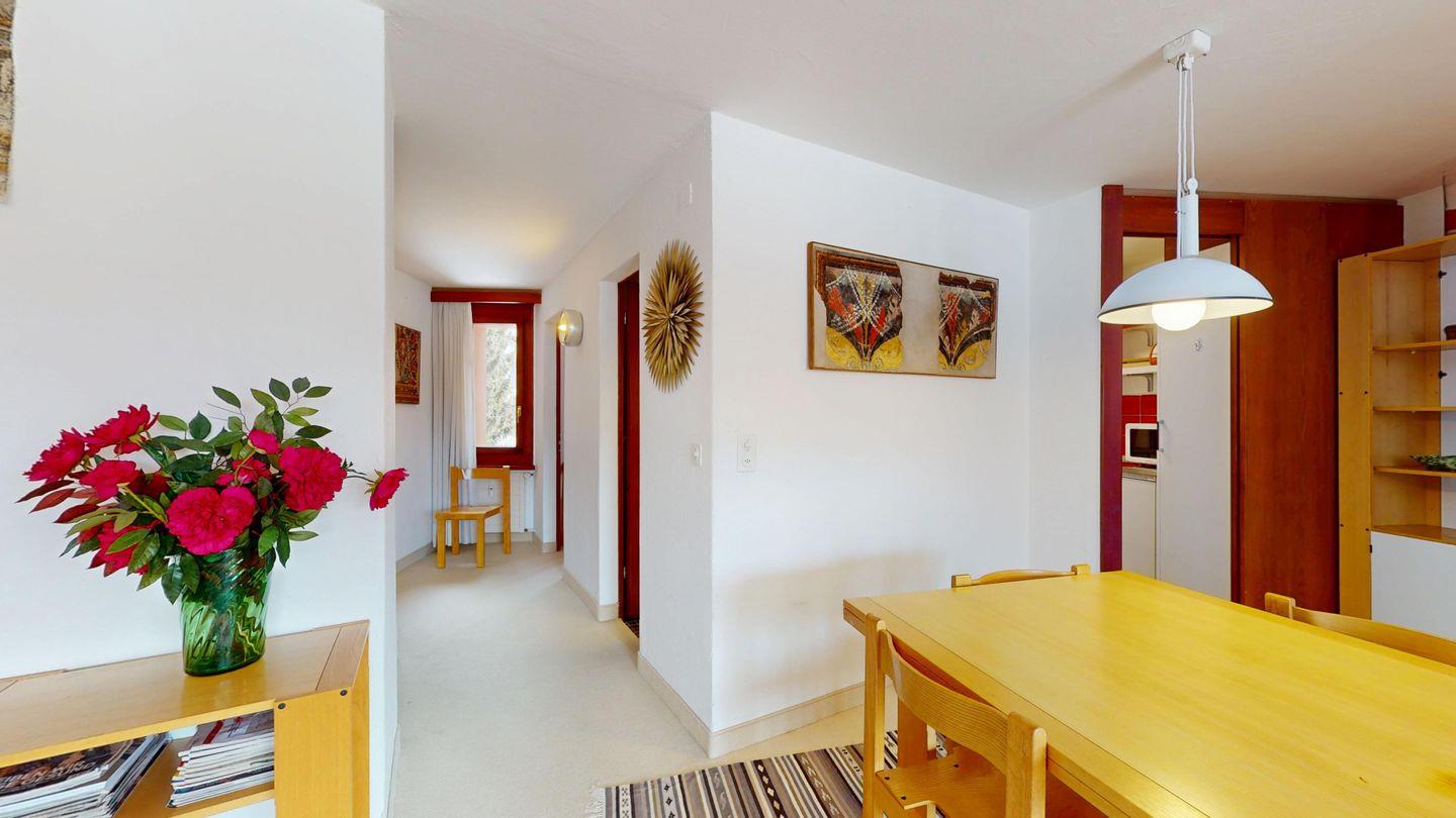 2 ½ Zimmerwohnung mit ca. 60 m2 im 2. Stock mit Aufzug. Eingang mit Garderobe, Wohn- / Essbereich, Bettsofa, Ausgang zu einem kleinen Balkon mit Blick auf die Berge. Fernsehen und Internet. Kleine separate Küche mit Backofen, Kühlschrank, Kaffeemaschine und Geschirrspüler. Schlafzimmer mit Doppelbett. Badezimmer mit Badewanne, Waschbecken und Bidet. Ein Aussenparkplatz. Waschküche und Skiraum. Haustiere nicht erlaubt.