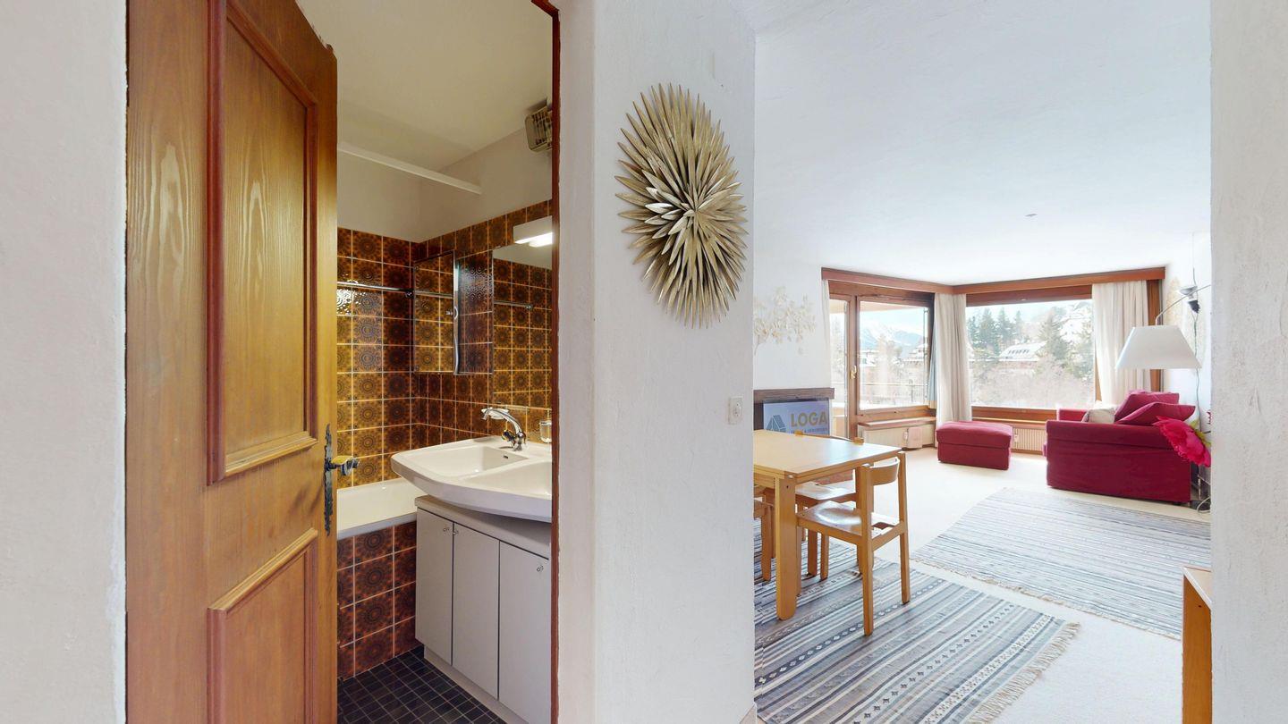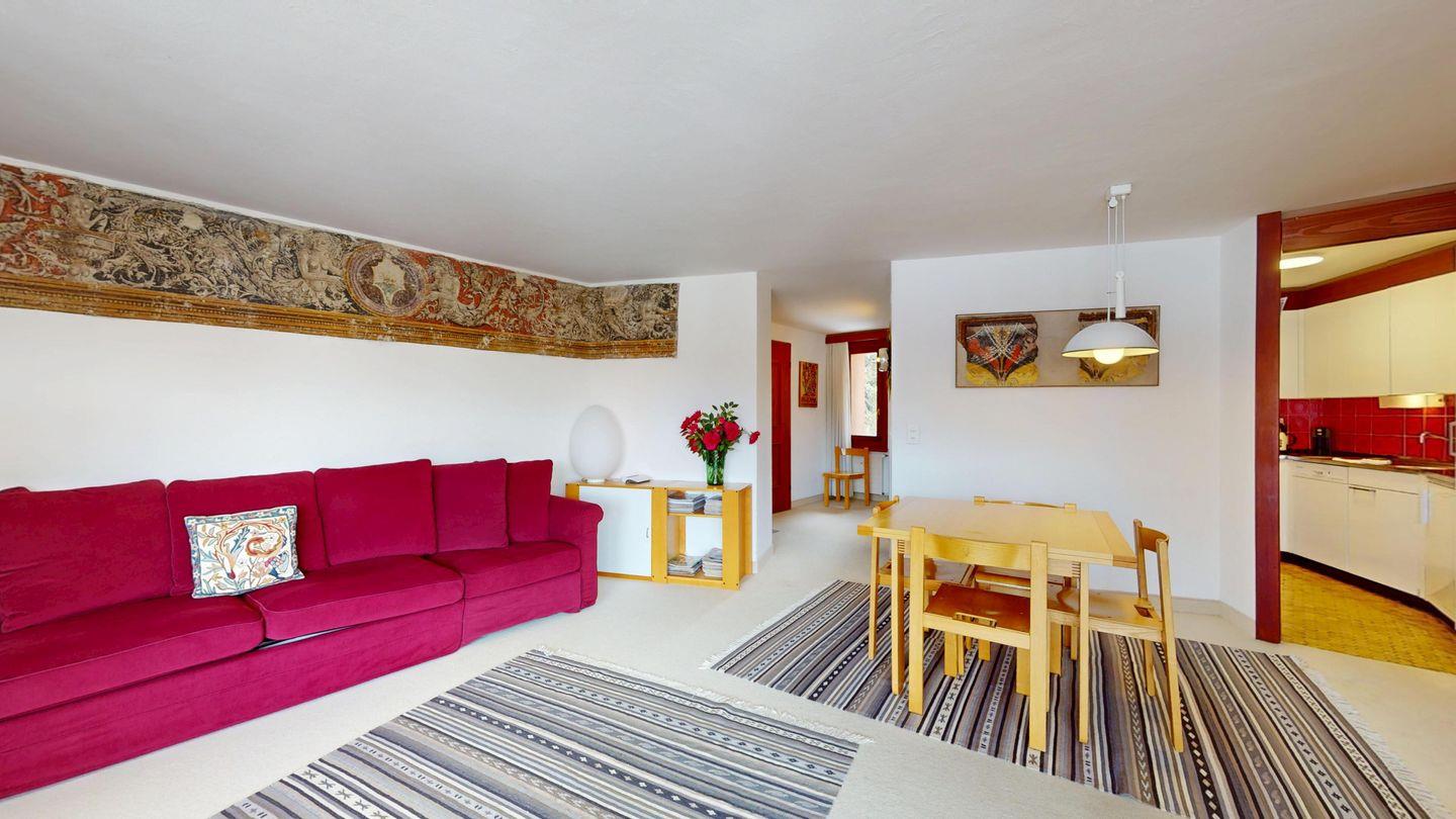 2 ½ Zimmerwohnung mit ca. 60 m2 im 2. Stock mit Aufzug. Eingang mit Garderobe, Wohn- / Essbereich, Bettsofa, Ausgang zu einem kleinen Balkon mit Blick auf die Berge. Fernsehen und Internet. Kleine separate Küche mit Backofen, Kühlschrank, Kaffeemaschine und Geschirrspüler. Schlafzimmer mit Doppelbett Badezimmer mit Badewanne, Waschbecken und Bidet. Ein Aussenparkplatz. Waschküche und Skiraum. Haustiere nicht erlaubt.