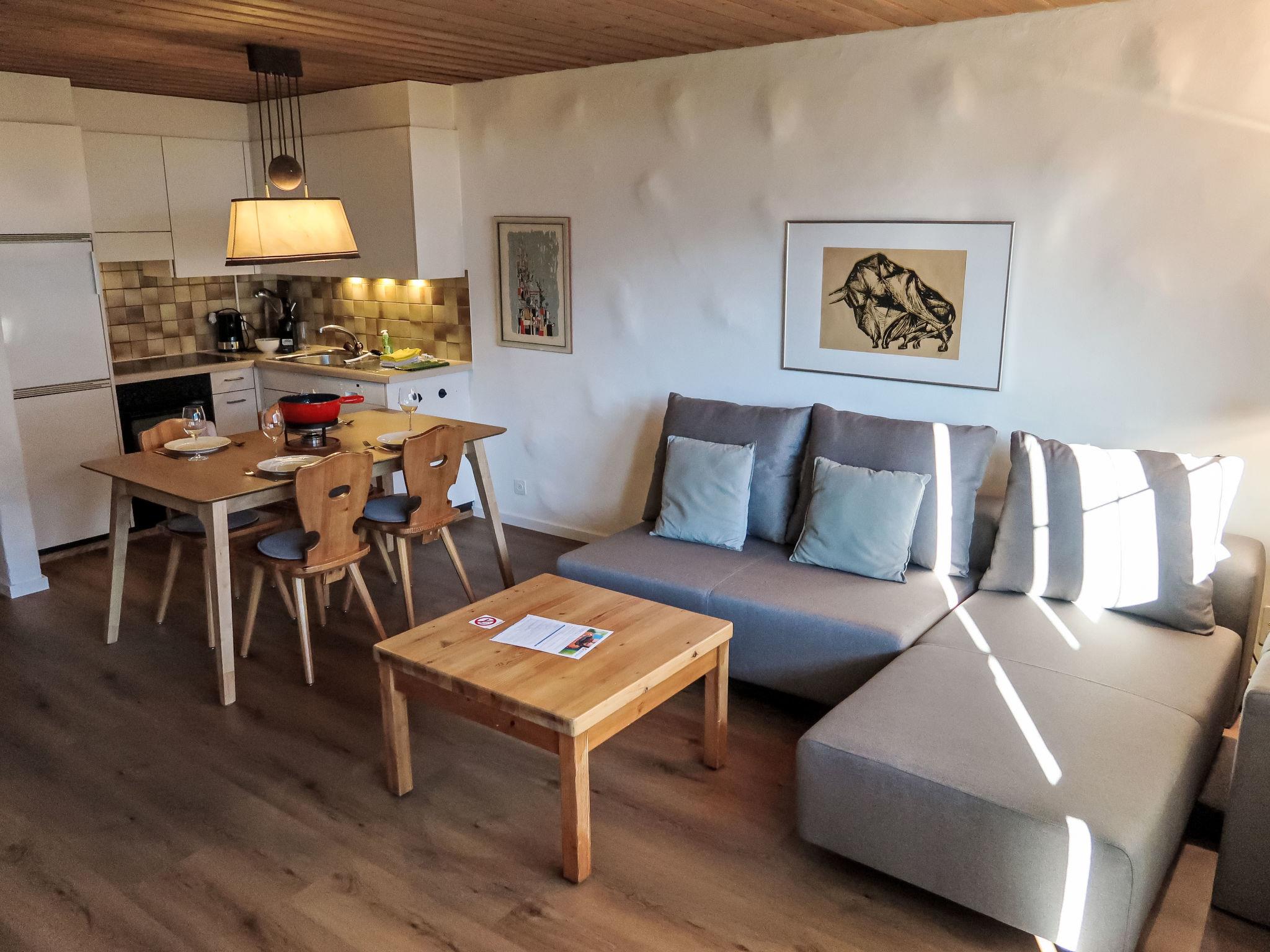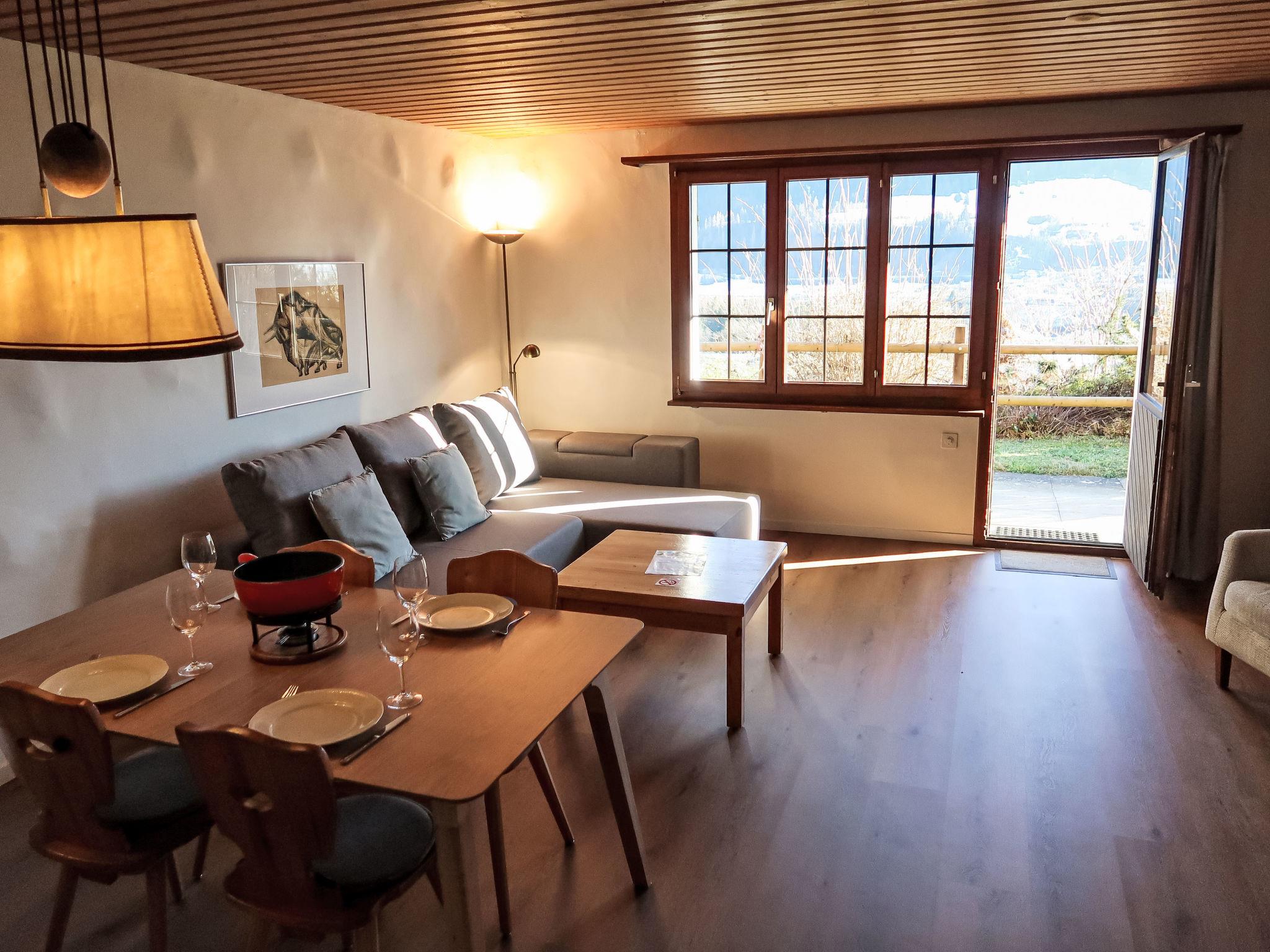 "Wohnung Nr.2", 2-room apartment 62 m2, on the ground floor. Renovated in 2024, comfortable and cosy furnishings: living/dining room with 1 double sofabed and satellite TV (flat screen). Exit to the patio. 1 room with 3 beds. Open kitchen (oven, dishwasher, 4 ceramic glass hob hotplates, toaster, kettle, electric coffee machine, Capsules for coffee machine (Nespresso) extra, raclette grill, fondue Set (cheese)). Shower/WC. Patio. Terrace furniture, box-room. Beautiful view of the mountains, the valley and the countryside. Facilities: washing machine, children's high chair, baby cot, hair dryer. Internet (WiFi, free). Parking at the house. Please note: non-smokers only. Maximum 1 pet/ dog allowed.