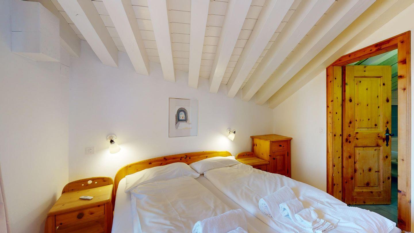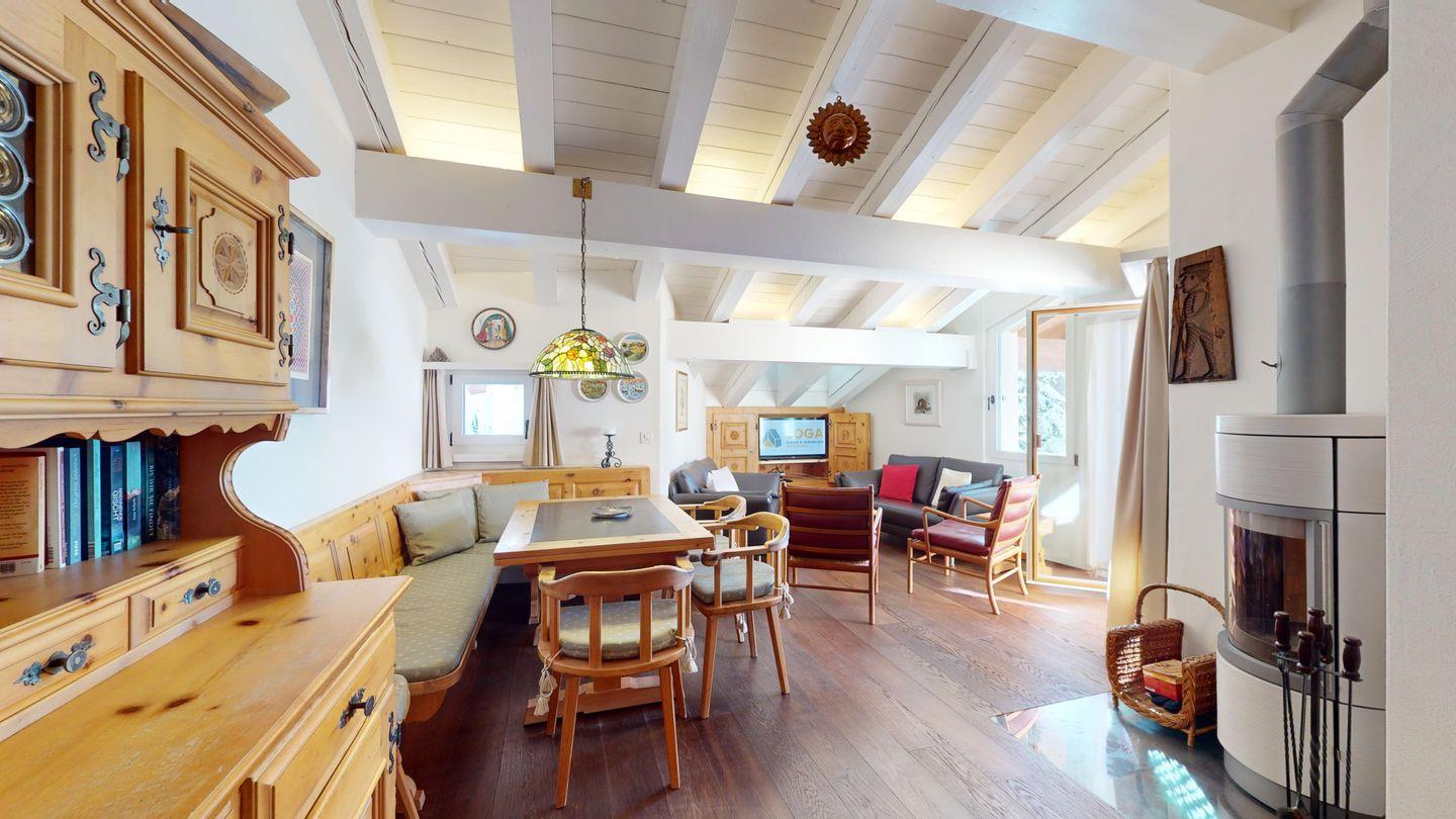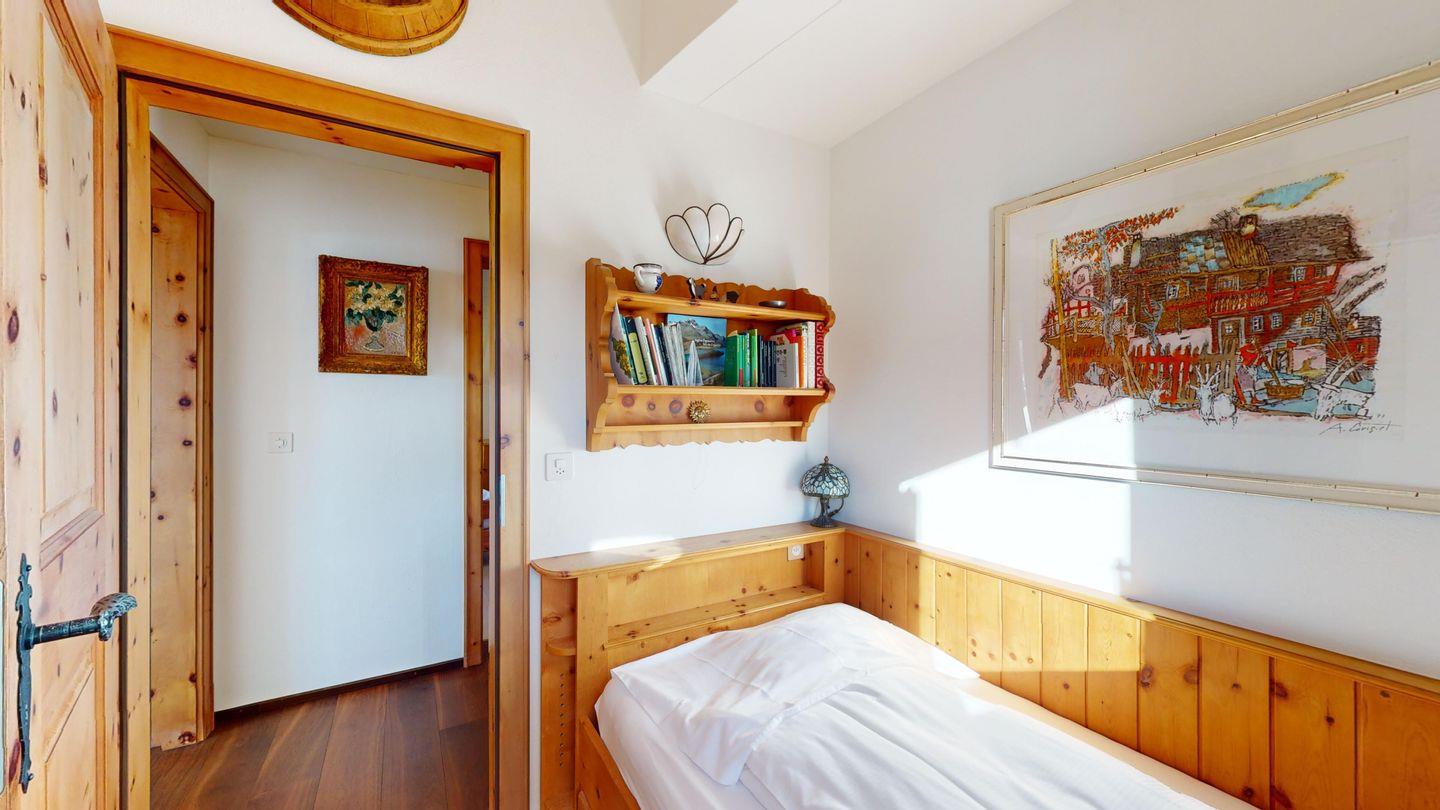 Schöne und charmante 4-Zimmerwohnung im Dachgeschoss. Sehr ruhige Lage. Eingang mit Garderobe. Wohn-/Esszimmer mit Balkon (südwest) und Kaminofen. Radio/CD und TV/Sat. Abgeschlossene Küche mit Fenster und Backofen sowie Geschirrspüler. CHICCO D'ORO Kaffeemaschine. Dusche/WC/Lavabo. 1 Doppelzimmer mit Balkon, Bad/WC/Lavabo. 1 Zimmer mit Etagenbett (2 Schlafmöglichkeiten), Ausgang zum Balkon. 1 Zimmer mit einem Einzelbett. Parkettboden in der ganzen Wohnung. 1 Garagenplatz. Haustiere sind nicht erlaubt.