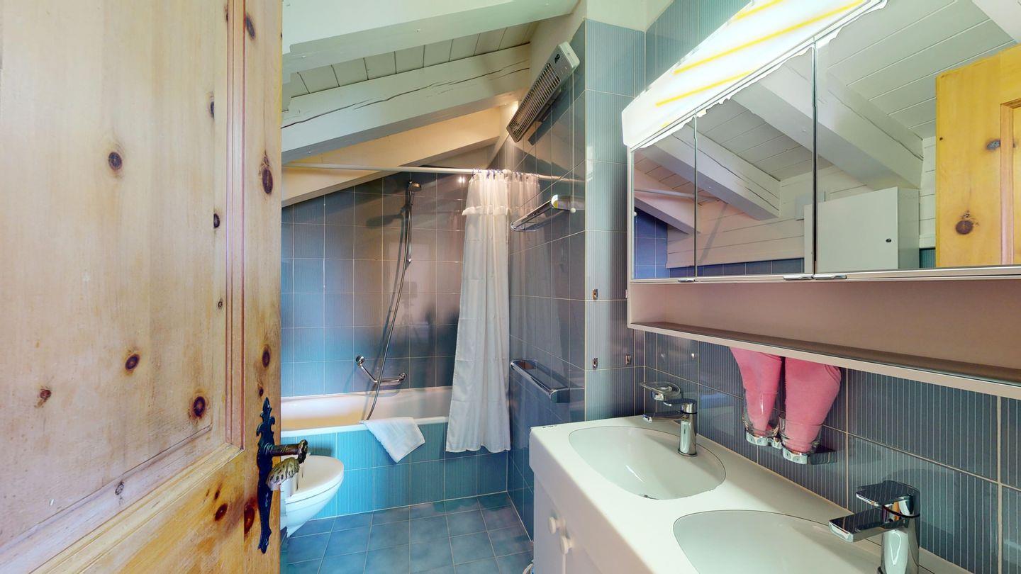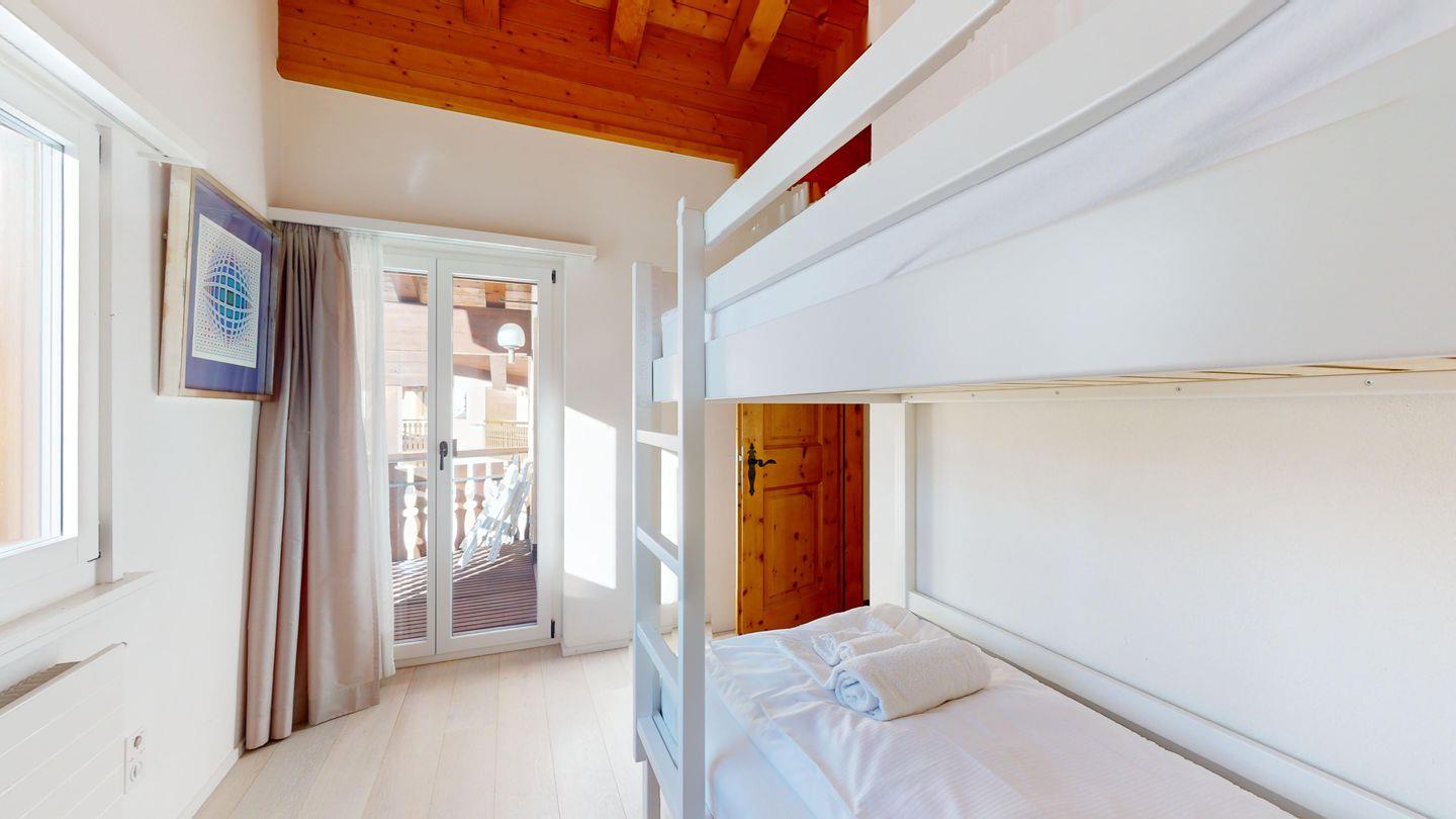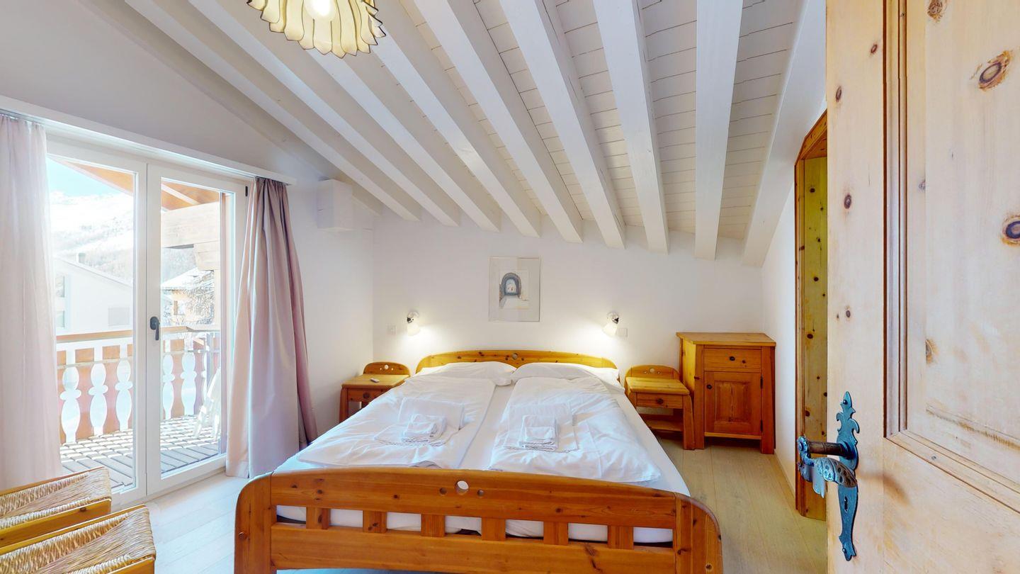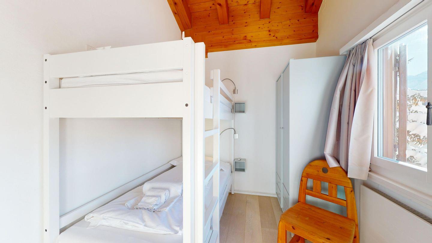 Schöne und charmante 4-Zimmerwohnung im Dachgeschoss. Sehr ruhige Lage. Eingang mit Garderobe. Wohn-/Esszimmer mit Balkon (südwest) und Kaminofen. Radio/CD und TV/Sat. Abgeschlossene Küche mit Fenster und Backofen sowie Geschirrspüler. CHICCO D'ORO Kaffeemaschine. Dusche/WC/Lavabo. 1 Doppelzimmer mit Balkon, Bad/WC/Lavabo. 1 Zimmer mit Etagenbett (2 Schlafmöglichkeiten), Ausgang zum Balkon. 1 Zimmer mit einem Einzelbett. Parkettboden in der ganzen Wohnung. 1 Garagenplatz. Haustiere sind nicht erlaubt.