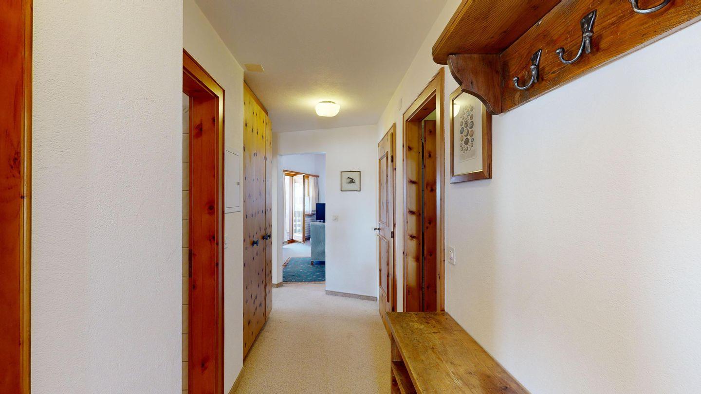 Der Eingangsbereich führt direkt zu den beiden Schlafzimmern und den zwei Badezimmern. Das grosse Schlafzimmer ist mit einem Doppelbett und einem Arvenschrank ausgestattet, während das zweite Schlafzimmer über zwei Einzelbetten und einen kleineren Kleiderschrank verfügt. Die beiden Badezimmer sind funktional eingerichtet, eines mit Badewanne und Duschmöglichkeit, das andere mit einer Dusche.