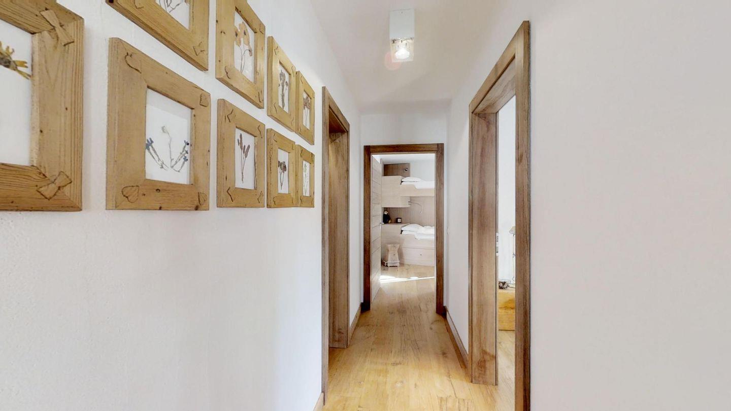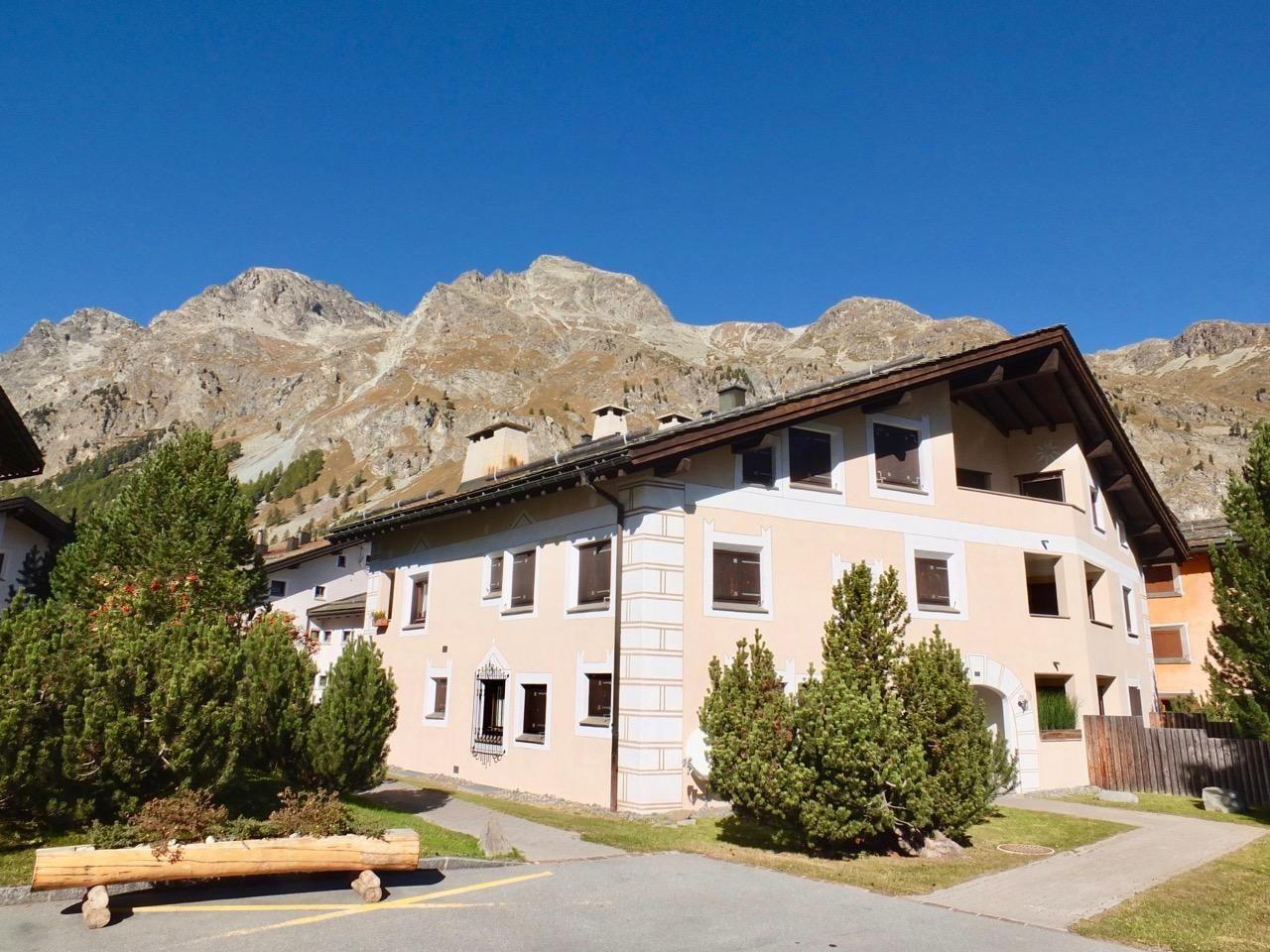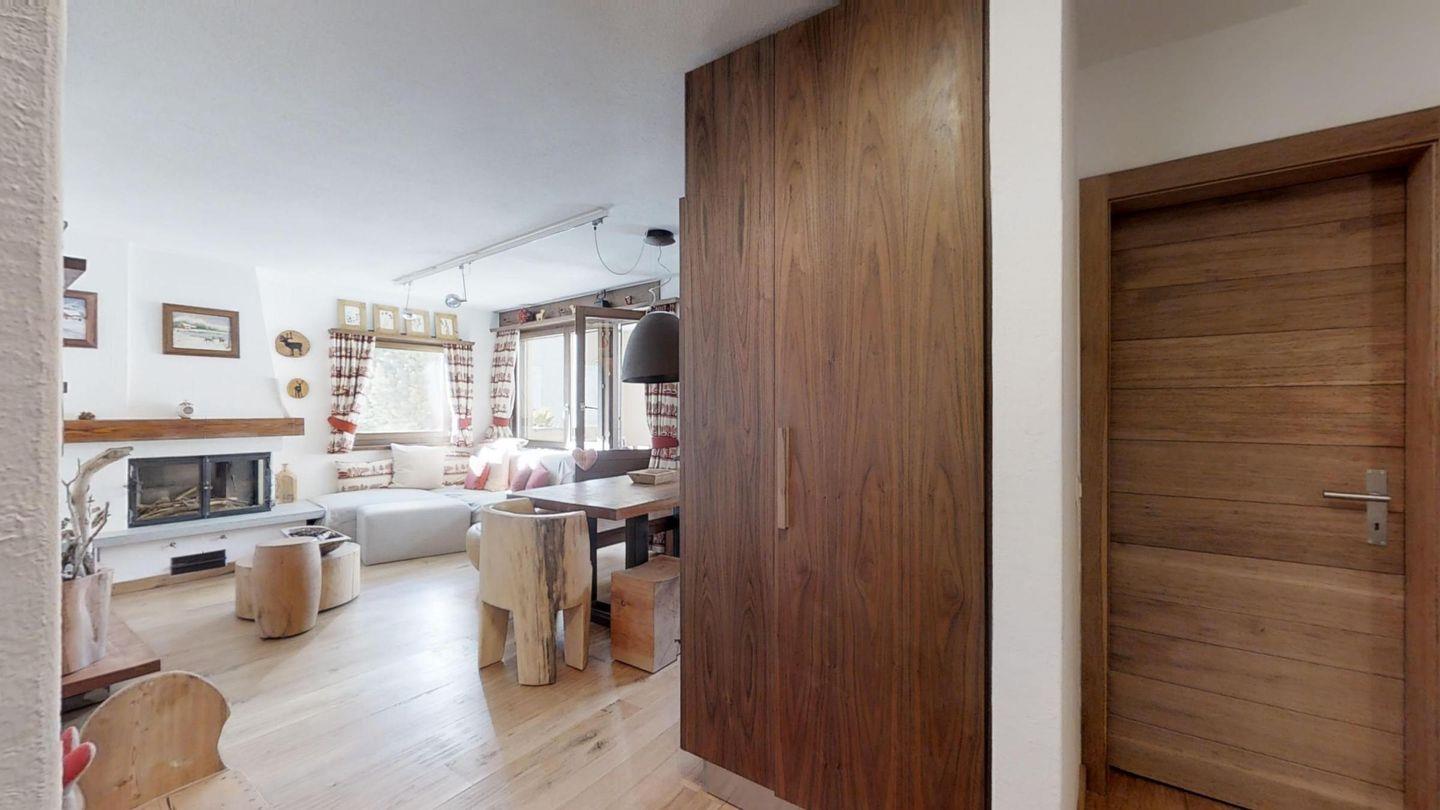 Geschmackvolle renovierte 3-Zimmerwohnung im 1. Stock, ca. 85 m2, an sehr ruhiger Lage. Ganze Wohnung mit Holzboden. Entrée mit Garderobe. Offene Küche mit Backofen, Chicco d'Oro Kaffeemaschine und Geschirrspülmaschine. Wohn-/ Esszimmer mit Cheminée und Balkon, TV/Sat sowie DVD/VHS. Dusche/WC/Lavabo. 1 Doppelschlafzimmer. 1 Schlafzimmer mit 2 Etagenbetten für 4 Personen. Bad/WC/Lavabo/Bidet. Garagenplatz Nr. 121. Ski- und Veloraum, Waschmaschine und Trockner zur gemeinsamen Nutzung. Haustiere erlaubt.