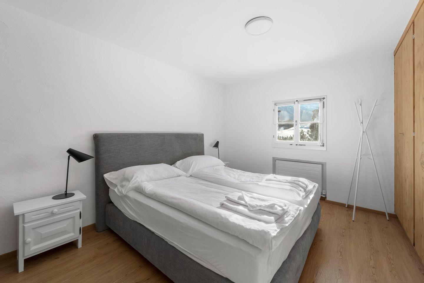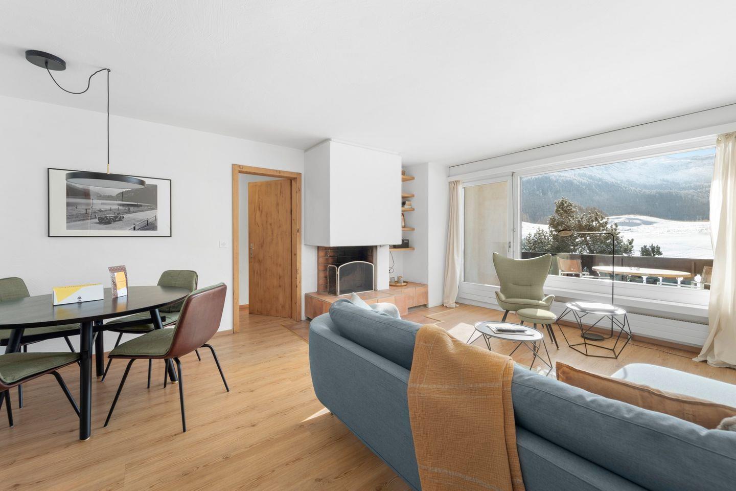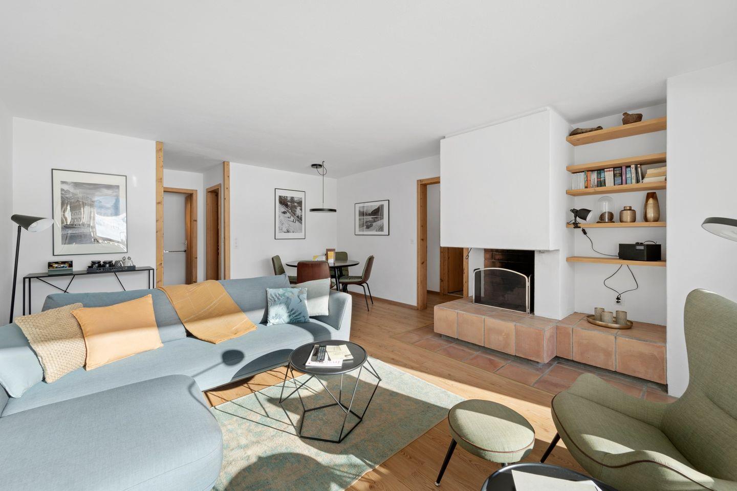 Helle 3-Zimmerwohnung im 1. Stock an ruhiger, sonniger Süd-Ost Lage, ca. 70 m2. Wohn-/ Esszimmer mit Kamin und Balkon (Gartenmöbel vorhanden). TV, WLAN. Separate Küche mit Backofen. 2 Doppelzimmer. Badezimmer mit Dusche/WC/Lavabo und Fenster. Separates WC/Lavabo. Sauna im Haus (gegen Bezahlung). Gemütliche und komfortable Einrichtung. Garagenplatz. Waschküche zur Mitbenützung. Haustiere sind erlaubt.