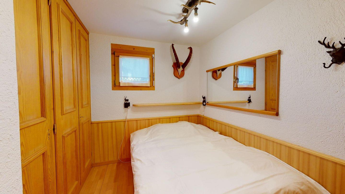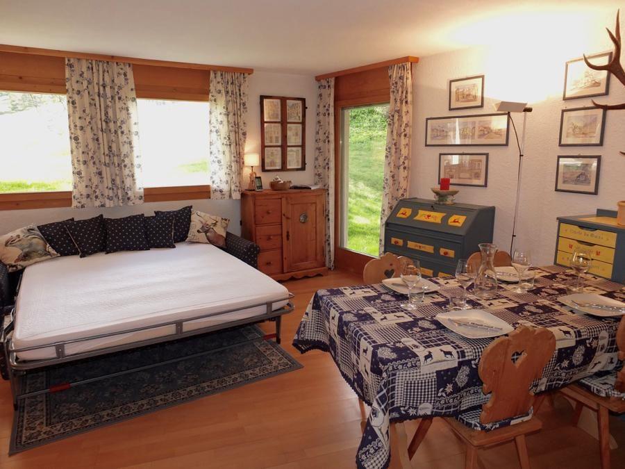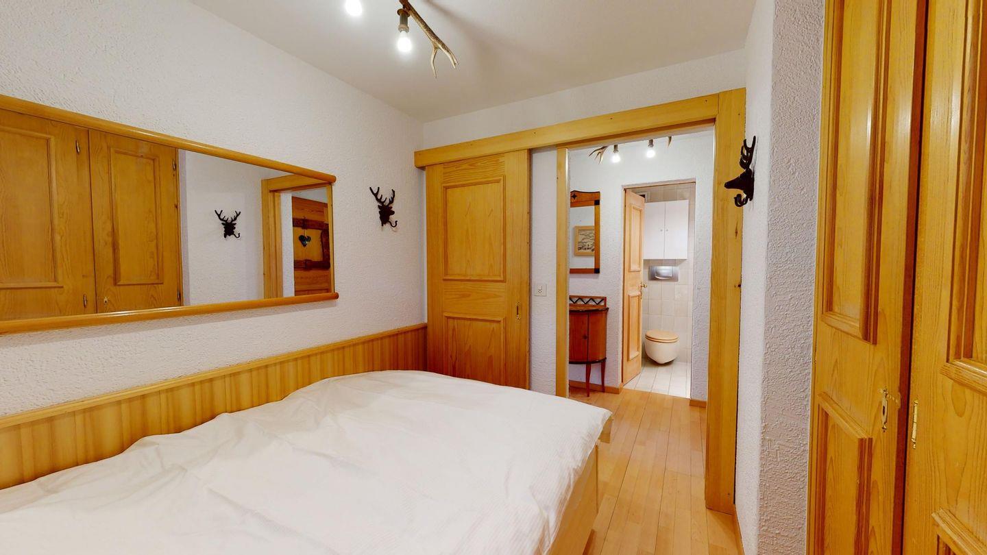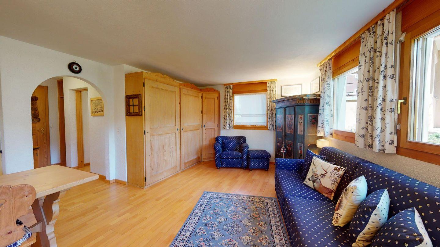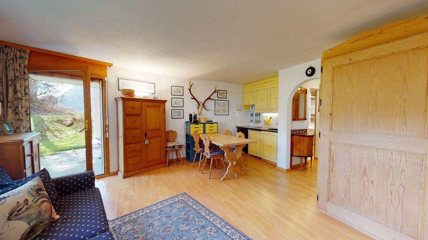 2-Zimmerwohnung im Erdgeschoss, ca. 40 m2. Entree mit Garderobe. Dusche/WC/Lavabo. Zimmer mit französischem Bett. Wohn-/Esszimmer mit Sofabett, Satelliten-Fernseher und direktem Ausgang auf den Sitzplatz. Offene Küche mit Backofen. Laminatboden. Gemütliche Einrichtung. 1 Garagenplatz. Haustiere sind nicht erlaubt.