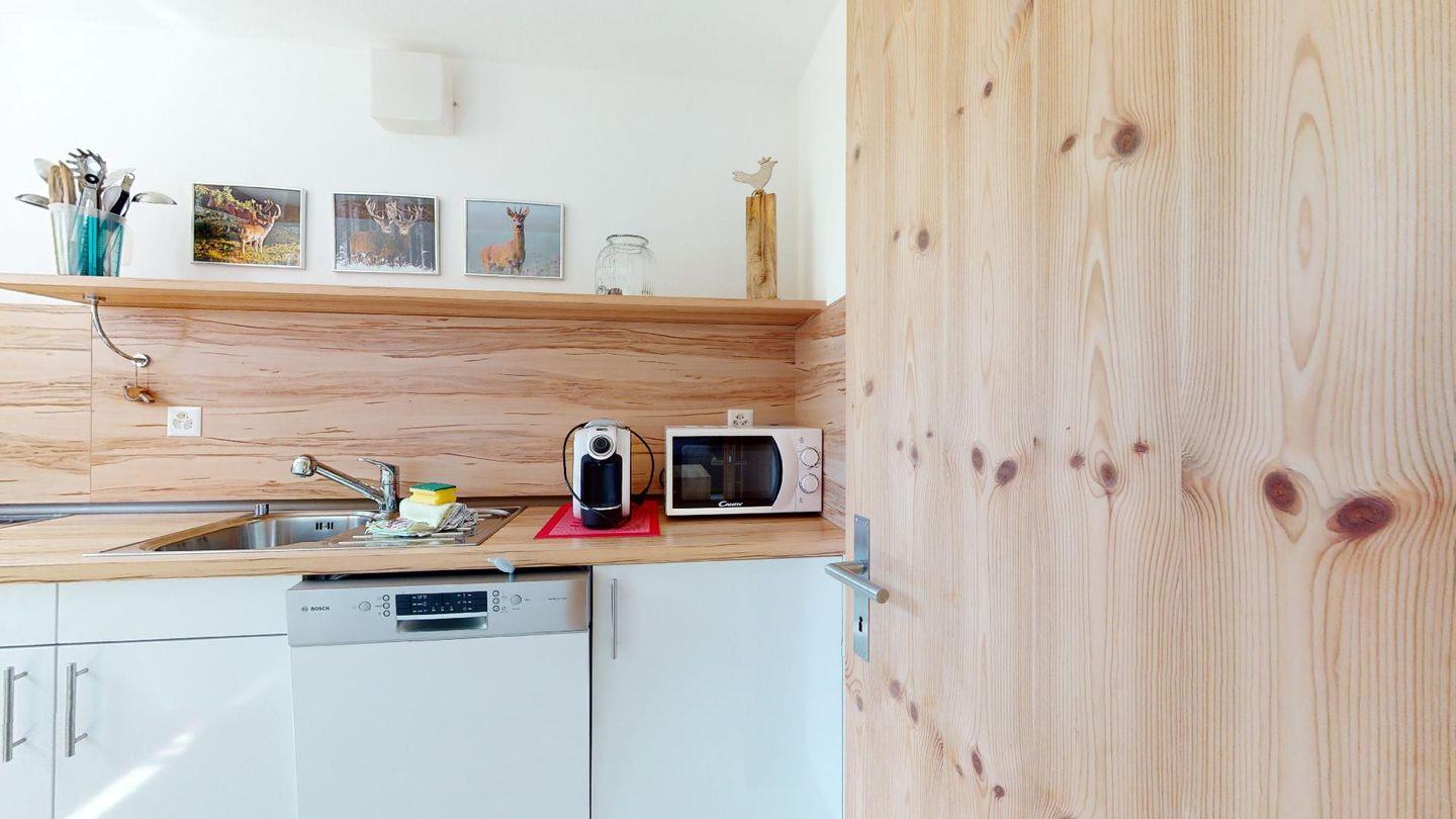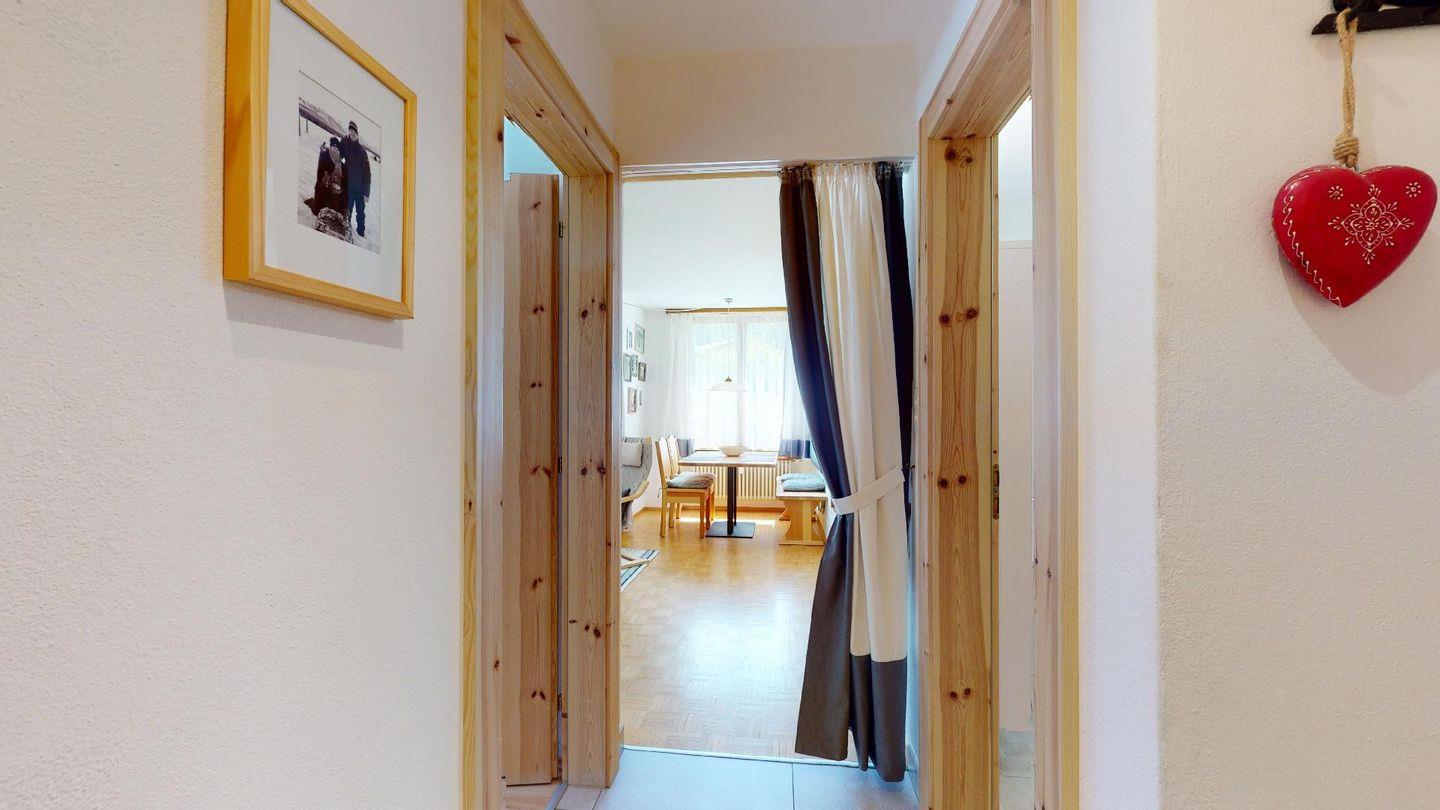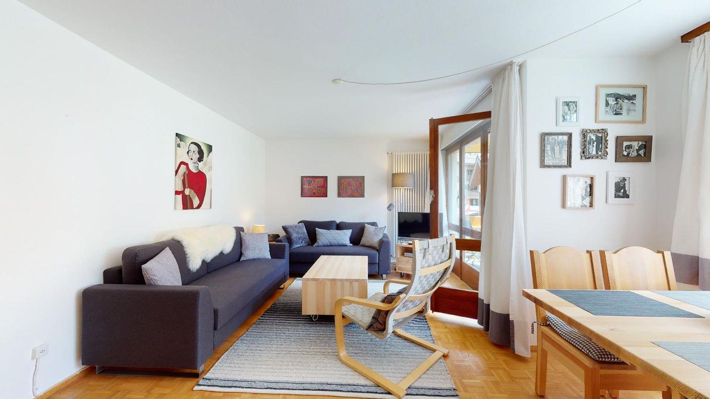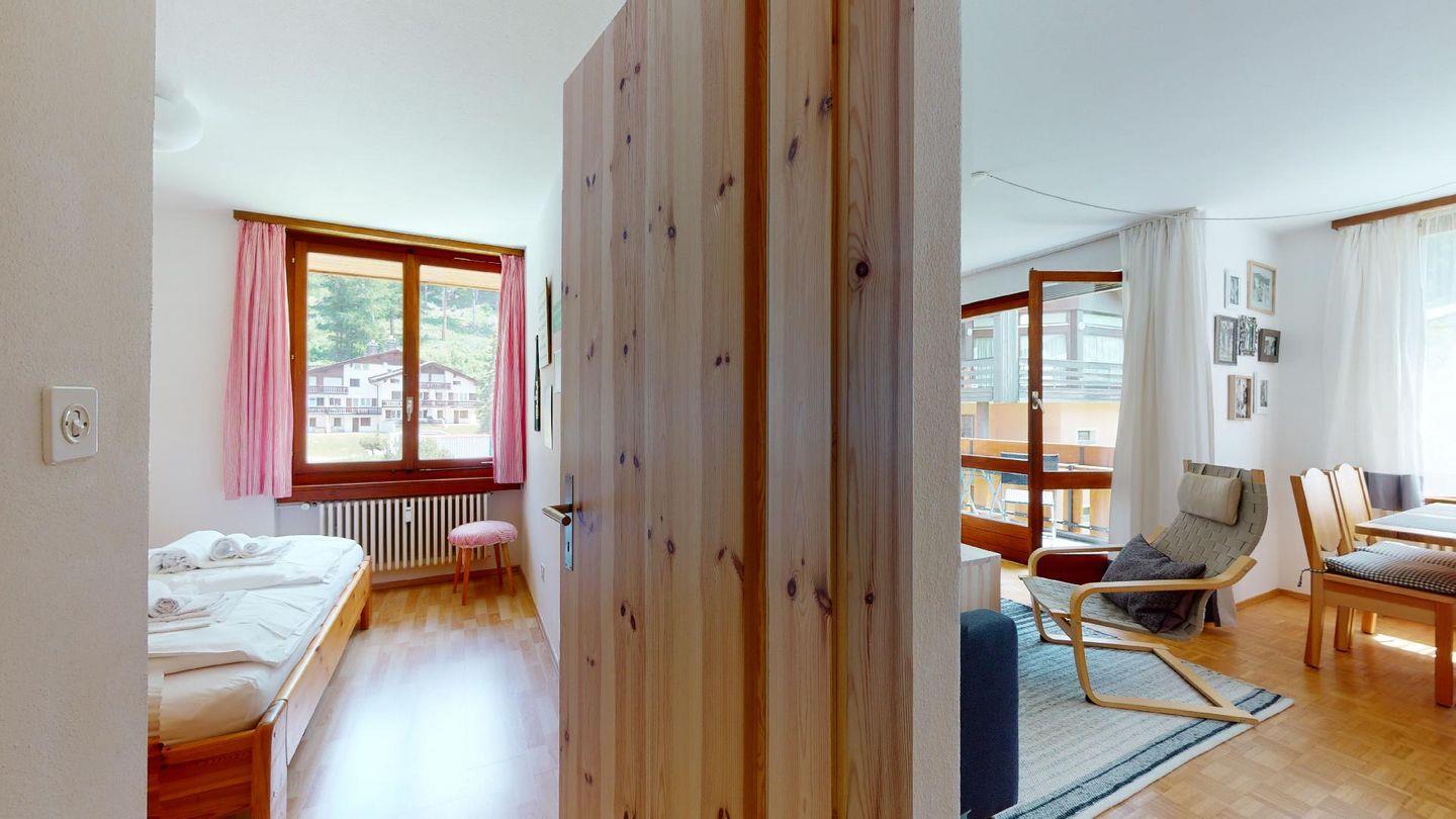 Helle 2-Zimmerwohnung mit ca. 45m im 1. Stock (2. Halbgeschoss), in ruhiger Lage in Surlej nahe der Corvatschbahn. Entrée mit kleiner Garderobe, Schuhschrank und Sitzgelegenheit. Geräumiges Wohnzimmer mit TV und DVD-Player mit einer Auswahl an DVDs, kleine Nische für den Esstisch an dem 4 Personen Platz haben, 1 Sessel sowie 2 Schlafsofas mit je einer Schlafmöglichkeit. Direkter Ausgang vom Wohnzimmer auf den Balkon mit Sicht Richtung Corvatsch. Neue Küche mit Backofen, Geschirrspülmaschine, Mikrowelle und Wasserkocher. CHICCO D'ORO Kaffeemaschine. Schlafzimmer (Parkettboden) mit Doppelbett (2 Matratzen, 90x190), geräumiger Wandschrank, Fenster mit Blick Richtung Wald. Bad mit Badewanne / WC / Lavabo. Waschmaschine und Skiraum zum Abstellen zur Mitbenutzung. Kein Veloraum. Aussenparkplatz. Nichtraucherwohnung. Haustiere sind nicht erlaubt.
