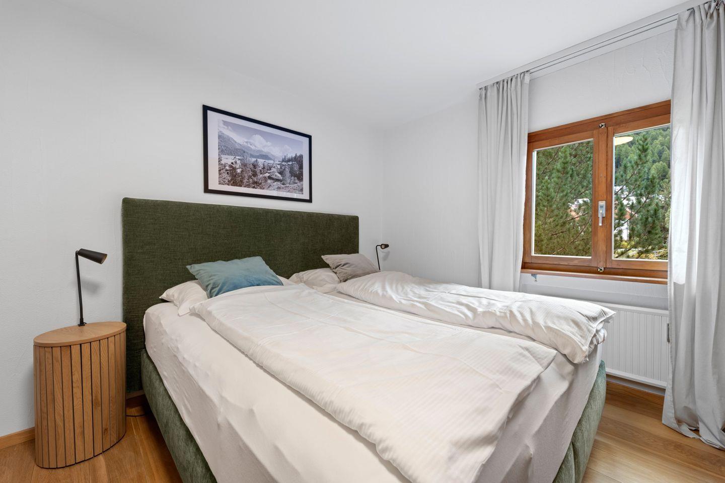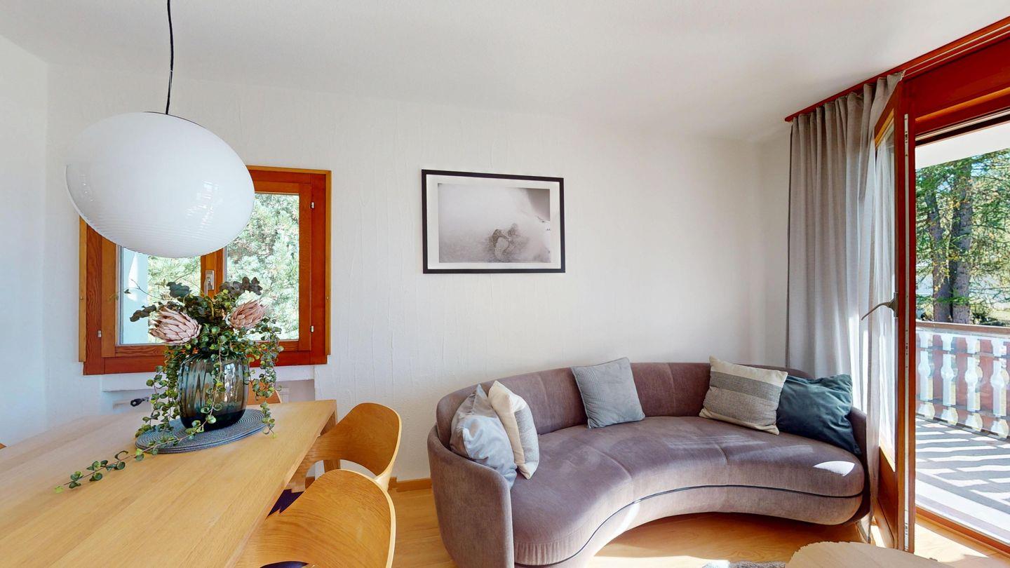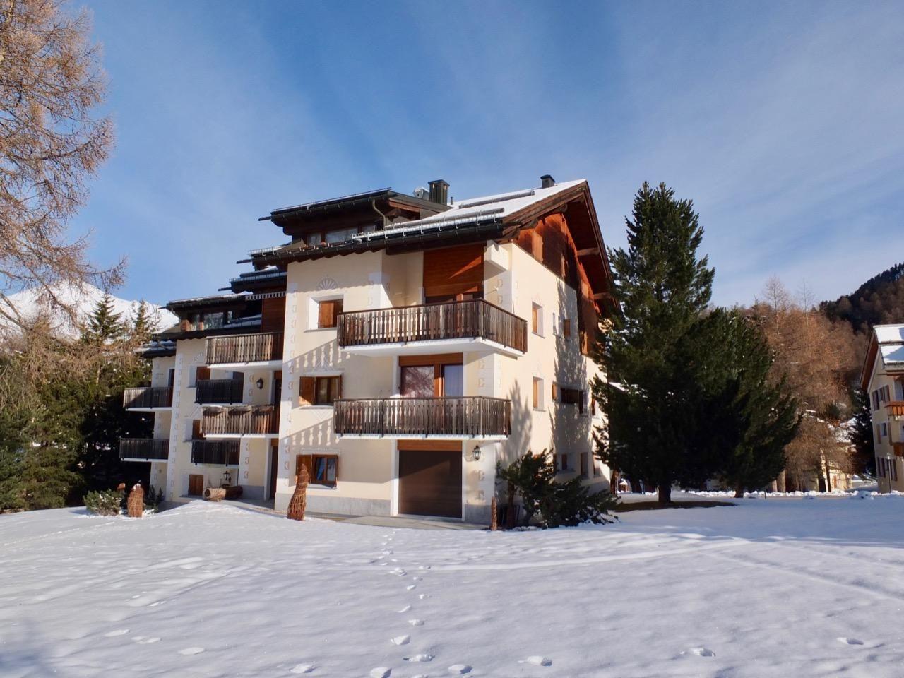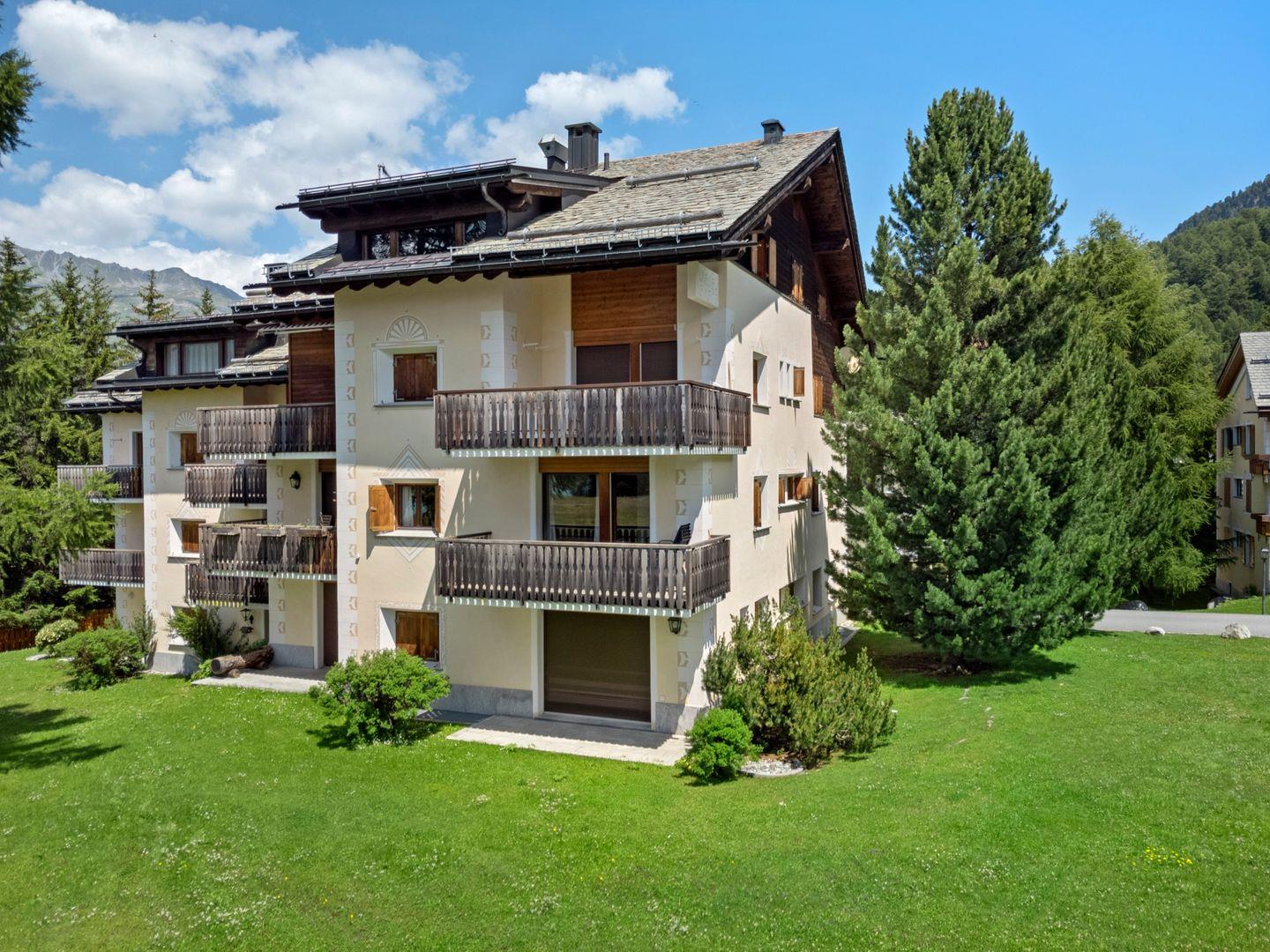 4½ - Zimmerwohnung im 1. Obergeschoss, Eingang mit kleiner Garderobe, Wohn-/Esszimmer mit Ausgang auf den Balkon von welcher Sie die einmalige Sicht auf den Silvaplanersee und die Engadiner Bergwelt geniessen können, Doppelschlafzimmer mit Einbauschrank und Dusche/WC/Lavabo, geschlossene Küche mit Fenster, Badewanne/WC/Lavabo, Zimmer mit Kajütenbett und Einbauschrank, Doppelschlafzimmer mit Einbauschrank, 2 Garagenplätze.