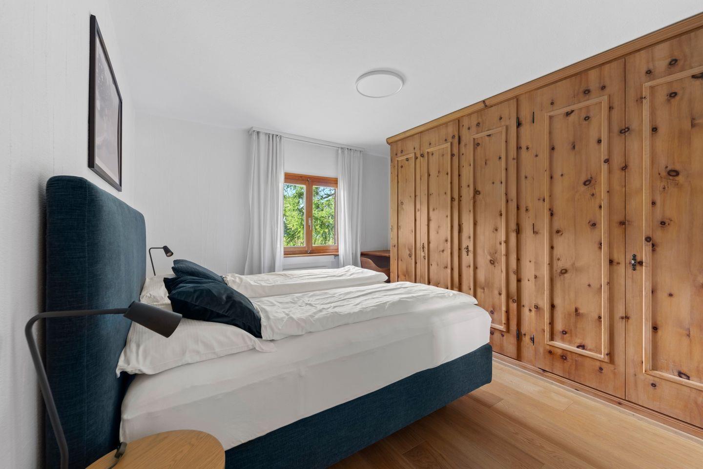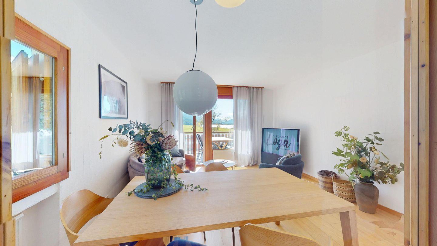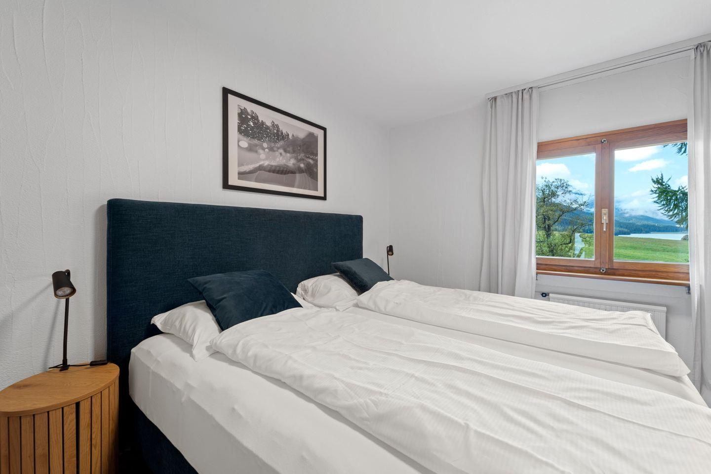 4½ - Zimmerwohnung im 1. Obergeschoss, Eingang mit kleiner Garderobe, Wohn-/Esszimmer mit Ausgang auf den Balkon von welcher Sie die einmalige Sicht auf den Silvaplanersee und die Engadiner Bergwelt geniessen können, Doppelschlafzimmer mit Einbauschrank und Dusche/WC/Lavabo, geschlossene Küche mit Fenster, Badewanne/WC/Lavabo, Zimmer mit Kajütenbett und Einbauschrank, Doppelschlafzimmer mit Einbauschrank, 2 Garagenplätze.