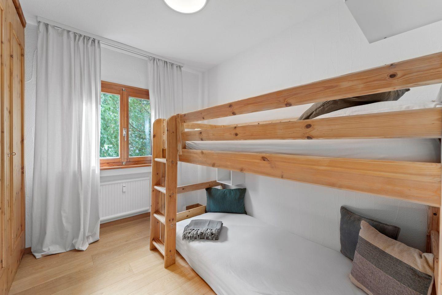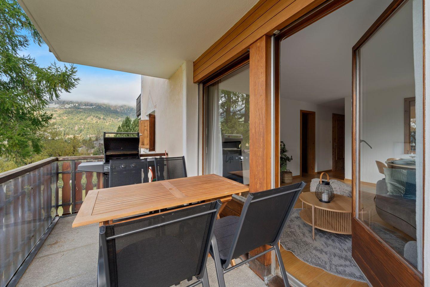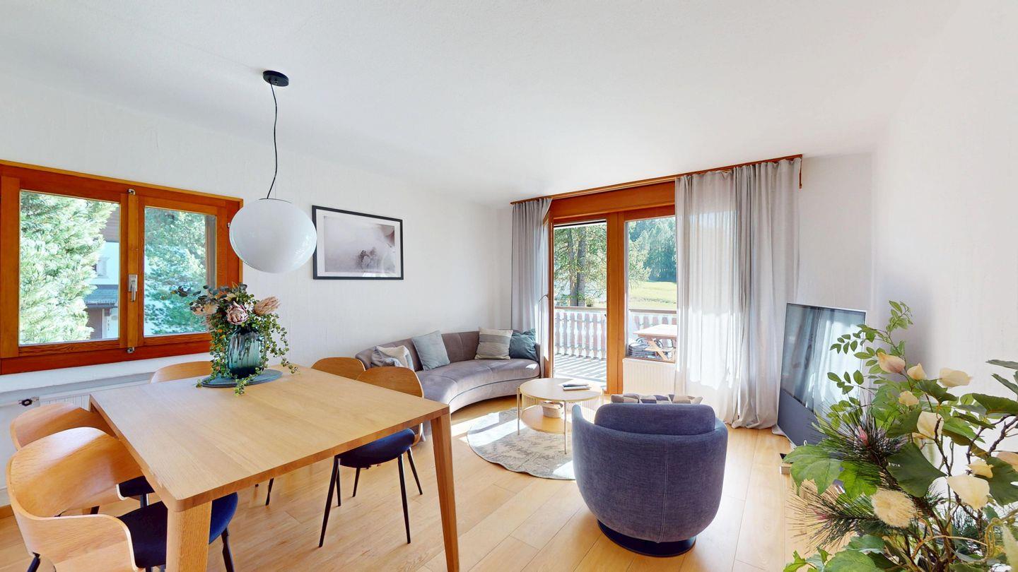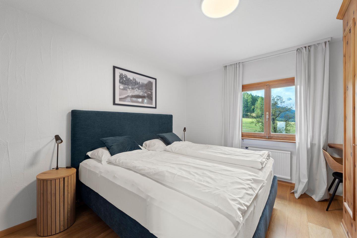 4½ - Zimmerwohnung im 1. Obergeschoss, Eingang mit kleiner Garderobe, Wohn-/Esszimmer mit Ausgang auf den Balkon von welcher Sie die einmalige Sicht auf den Silvaplanersee und die Engadiner Bergwelt geniessen können, Doppelschlafzimmer mit Einbauschrank und Dusche/WC/Lavabo, geschlossene Küche mit Fenster, Badewanne/WC/Lavabo, Zimmer mit Kajütenbett und Einbauschrank, Doppelschlafzimmer mit Einbauschrank, 2 Garagenplätze.