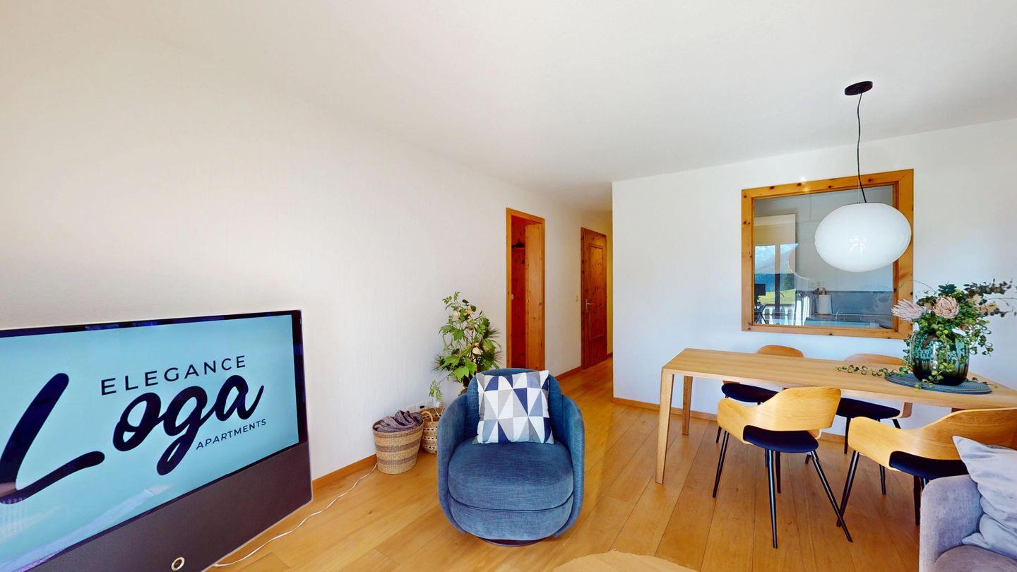 4 ½ - Zimmerwohnung im 1. Obergeschoss, Eingang mit kleiner Garderobe, Wohn-/Esszimmer mit Ausgang auf den Balkon von welcher Sie die einmalige Sicht auf den Silvaplanersee und die Engadiner Bergwelt geniessen können, Doppelschlafzimmer mit Einbauschrank und Dusche/WC/Lavabo, geschlossene Küche mit Fenster, Badewanne/WC/Lavabo, Zimmer mit Kajütenbett und Einbauschrank, Doppelschlafzimmer mit Einbauschrank, 2 Garagenplätze.