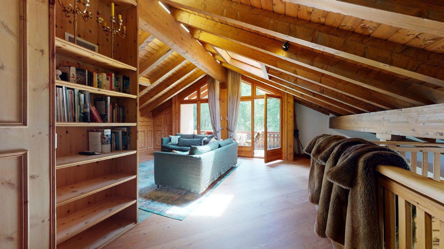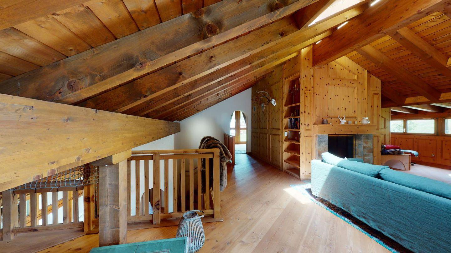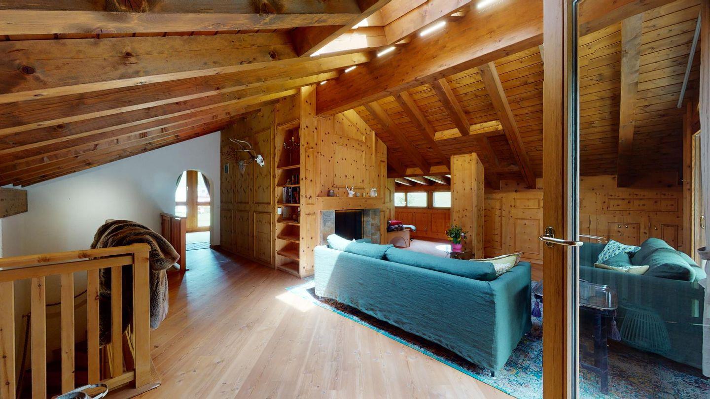 Über eine Treppe hoch zur Galerie gelangt man in den oberen Bereich des Apartments. Dort befindet sich der grosszügige, offene Wohnbereich im Galerie-Stil, mit gemütlicher Sofa-Ecke und offenem Kamin.