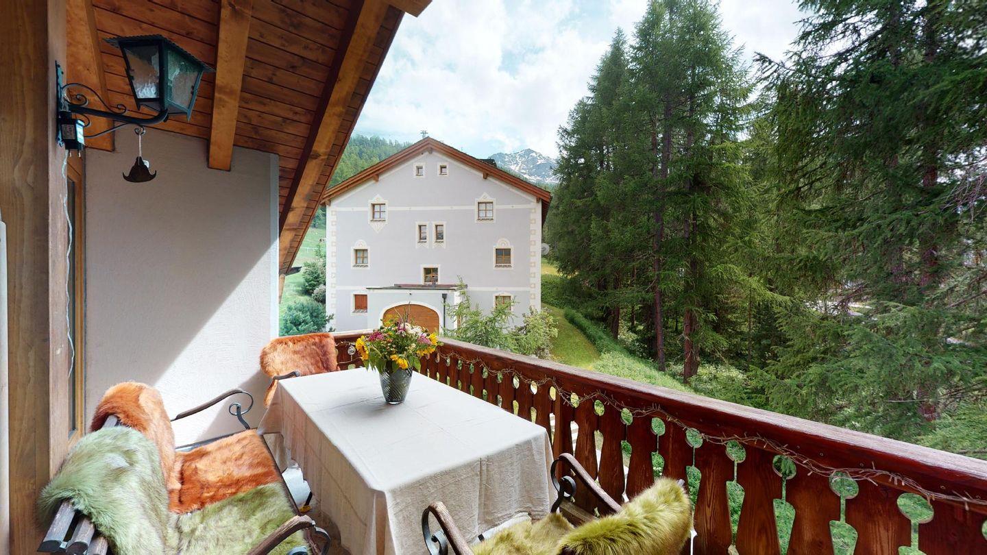 Vom Wohnbereich aus hat man direkten Zugang zum Balkon, von wo aus man das Bachrauschen sowie einen herrlichen Blick auf den Gipfel des Corvatsch geniesst.