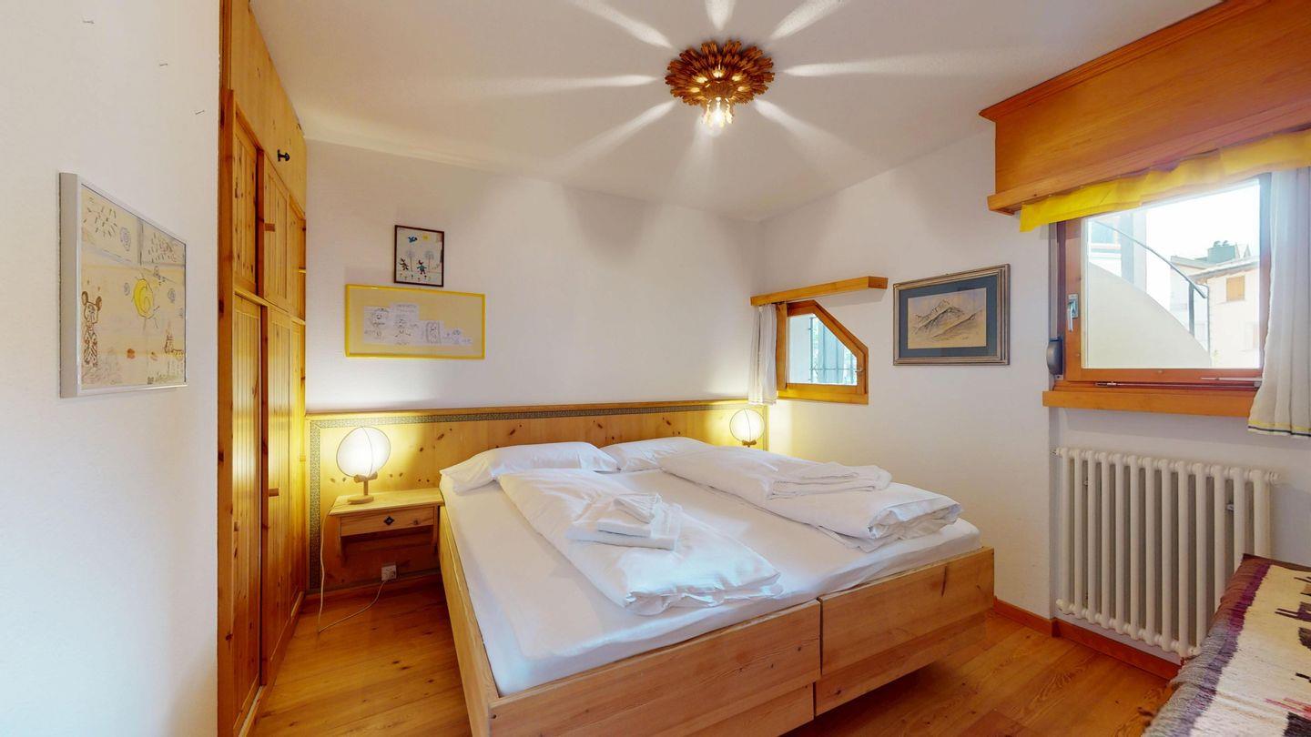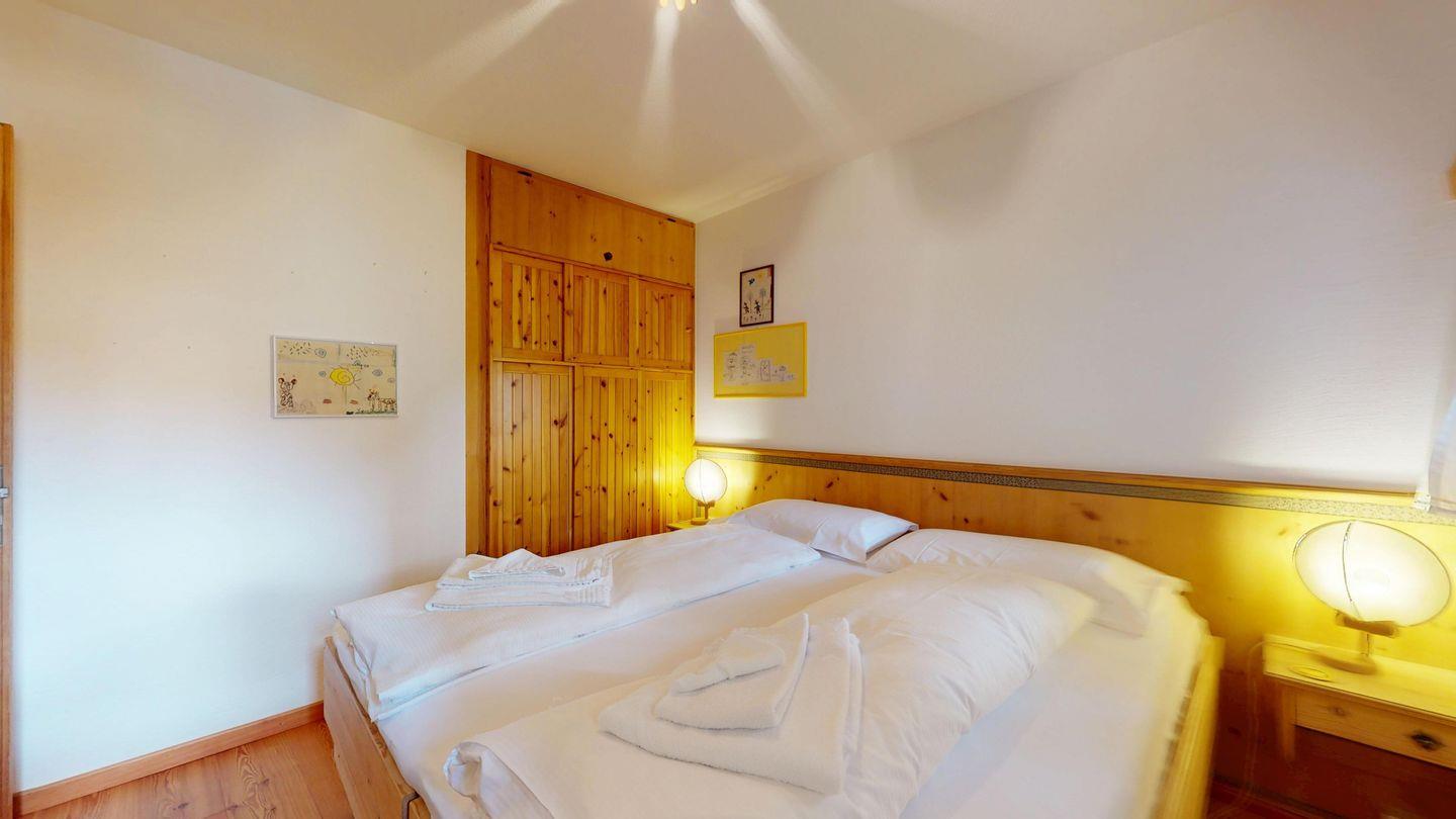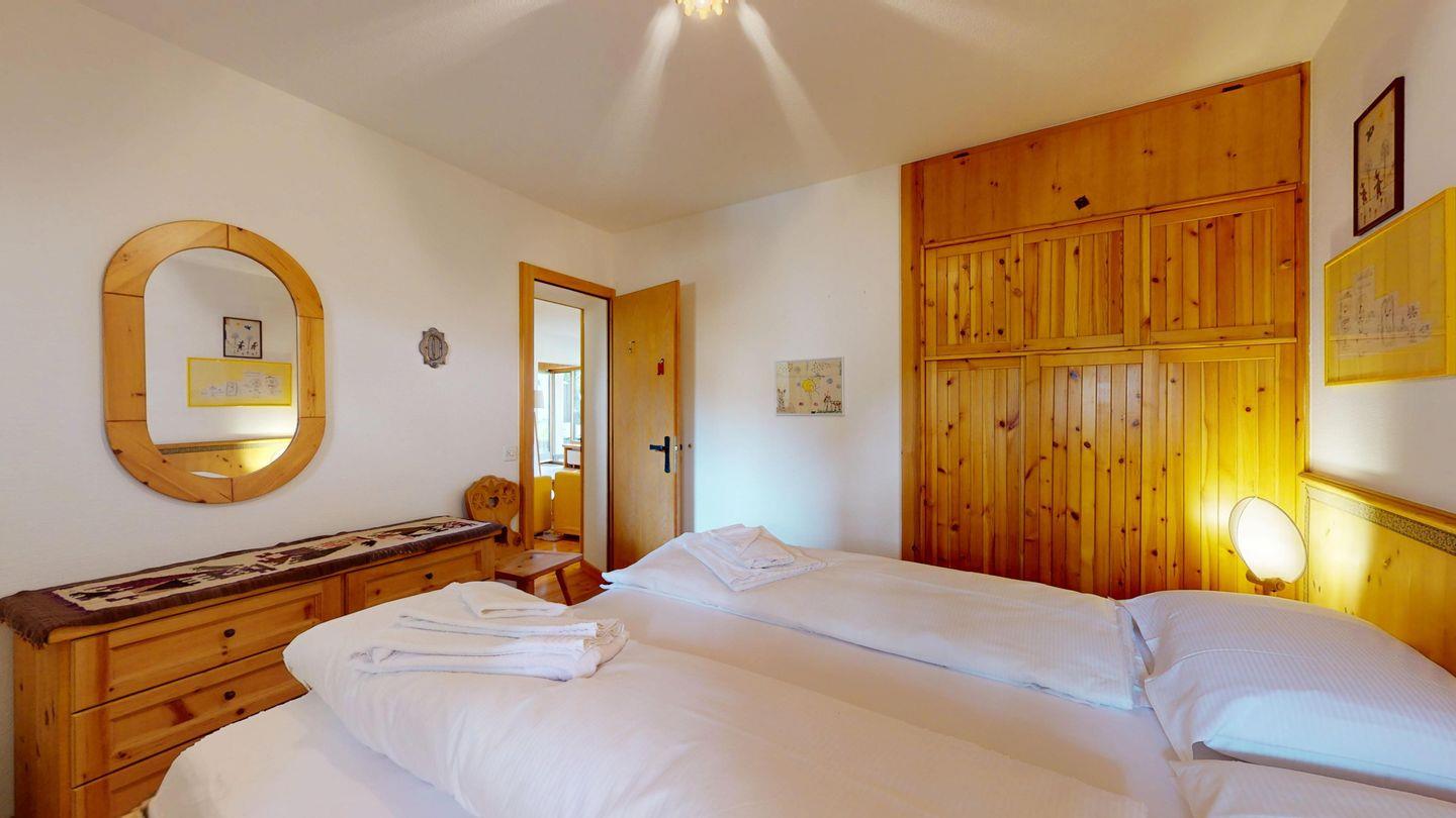 2-Zimmer-Wohnung im Erdgeschoss, ca. 85 m2, Vorraum mit Garderobe, Bad mit Badewanne/Waschbecken und WC. Schlafzimmer mit Doppelbett (zwei Einzelmatratzen). Abgeschlossene Küche mit kleinem Backofen und Geschirrspüler. Chicco d'oro Kaffeemaschine. Grosses Wohn-/Esszimmer mit zwei einzelnen Schrankbetten, die Tür zwischen Wohn- und Esszimmer kann geschlossen werden, um zwei getrennte Räume zu schaffen. Das zweite Bad mit Dusche befindet sich in diesem Teil der Wohnung. Balkon/Garten mit Blick auf die Berge, Balkonmöbel sind vorhanden. Rustikale und gemütliche Einrichtung. Gemeinsame Waschküche. 2 Stellplätze in der Garage. Die Garageneinfahrt ist sehr eng.