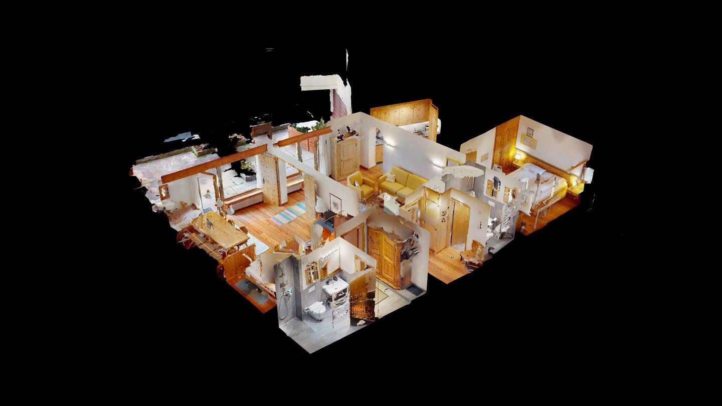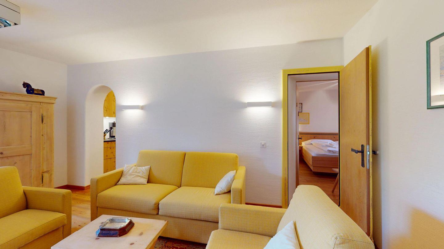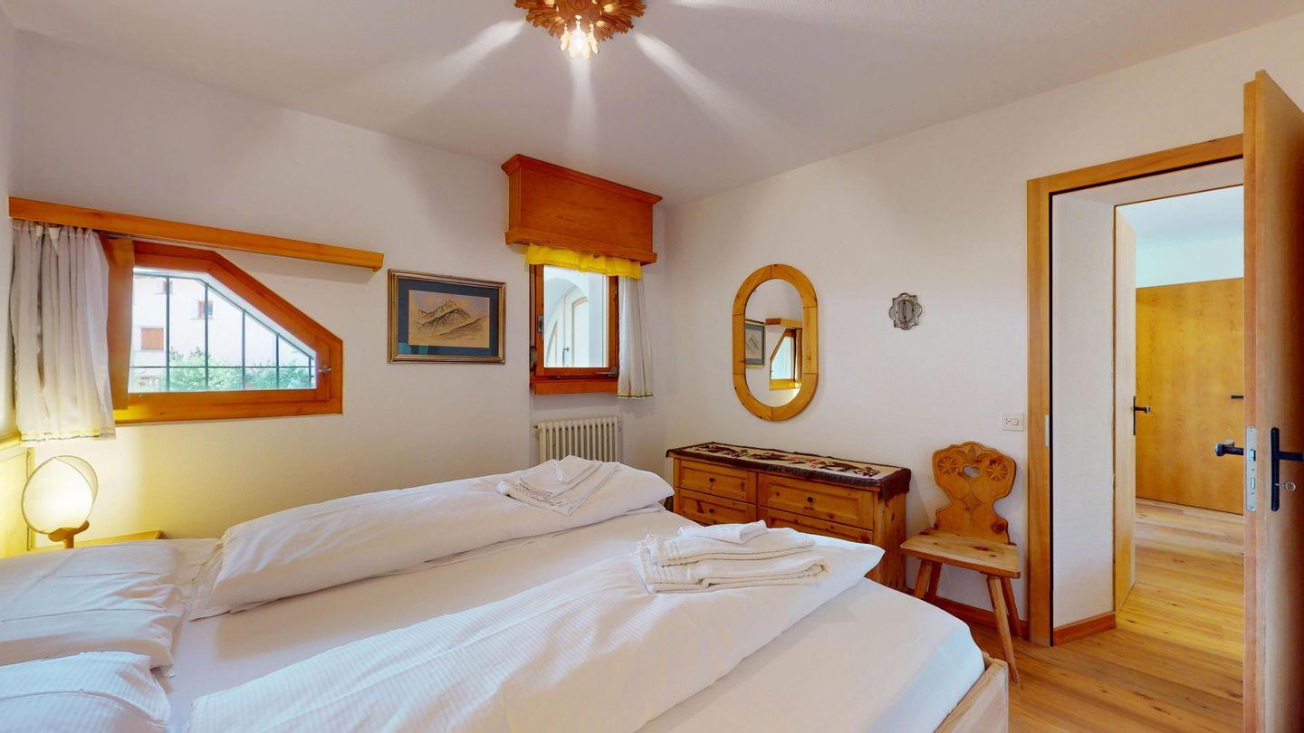 3-Zimmer-Wohnung im Erdgeschoss, Vorraum mit Garderobe, Bad mit Badewanne/Waschbecken und WC. Schlafzimmer mit Doppelbett (zwei Einzelmatratzen). Abgeschlossene Küche mit kleinem Backofen und Geschirrspüler. Chicco d'oro Kaffeemaschine. Grosses Wohn-/Esszimmer mit zwei einzelnen Schrankbetten, die Tür zwischen Wohn- und Esszimmer kann geschlossen werden, um zwei getrennte Räume zu schaffen. Das zweite Bad mit Dusche befindet sich in diesem Teil der Wohnung. Balkon/Garten mit Blick auf die Berge, Balkonmöbel sind vorhanden. Rustikale und gemütliche Einrichtung. Gemeinsame Waschküche. 2 Stellplätze in der Garage. Die Garageneinfahrt ist sehr eng.