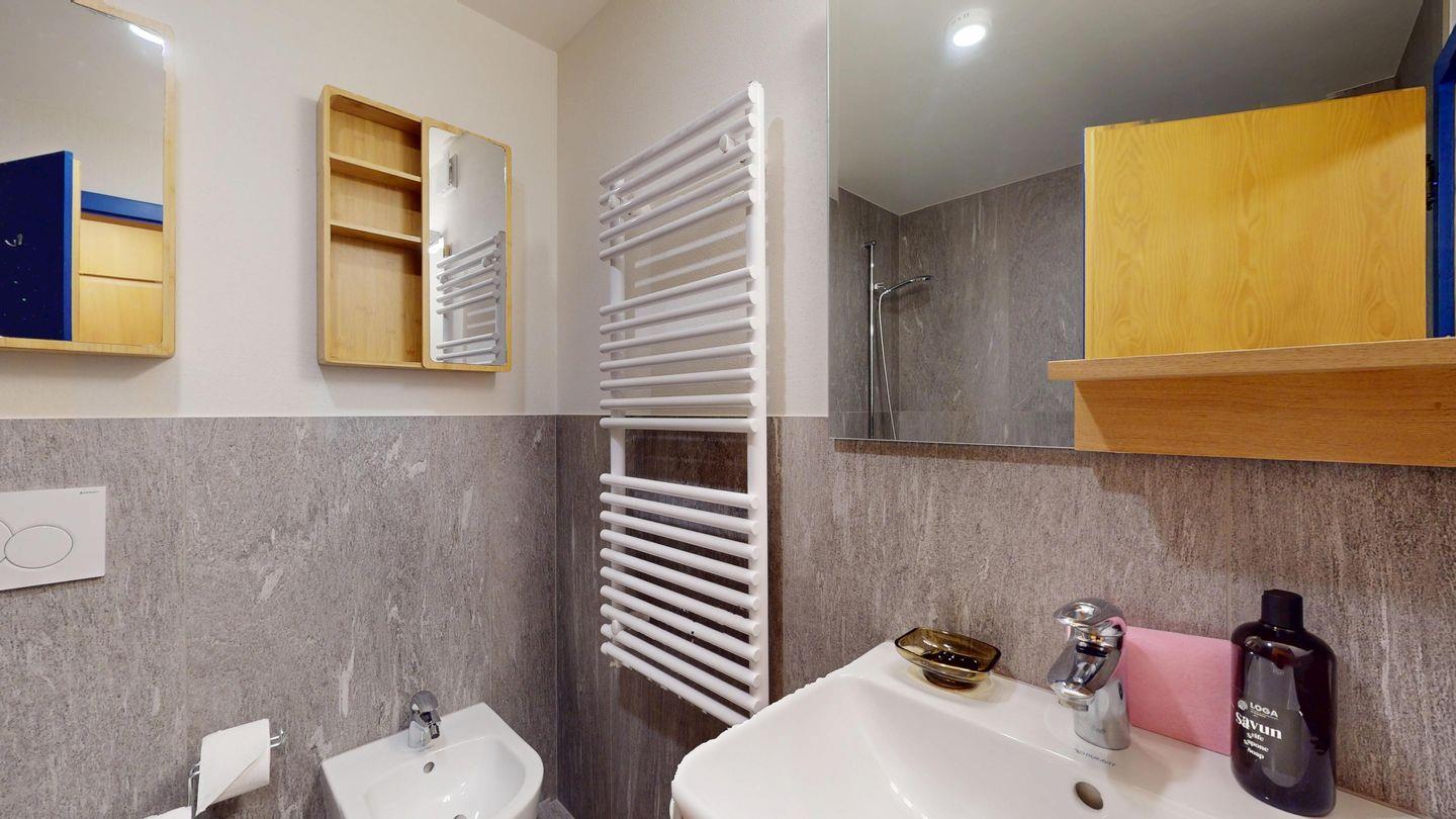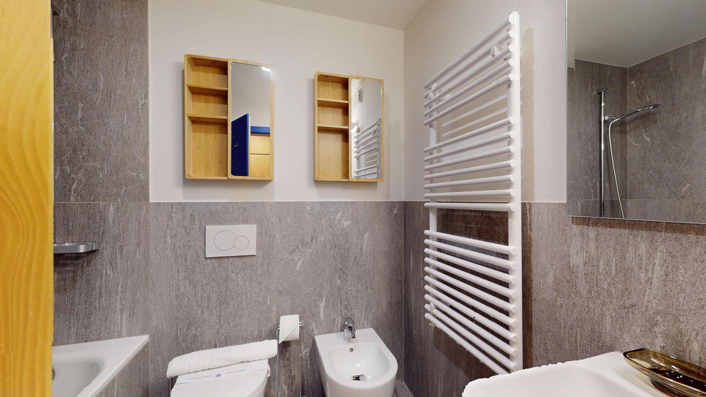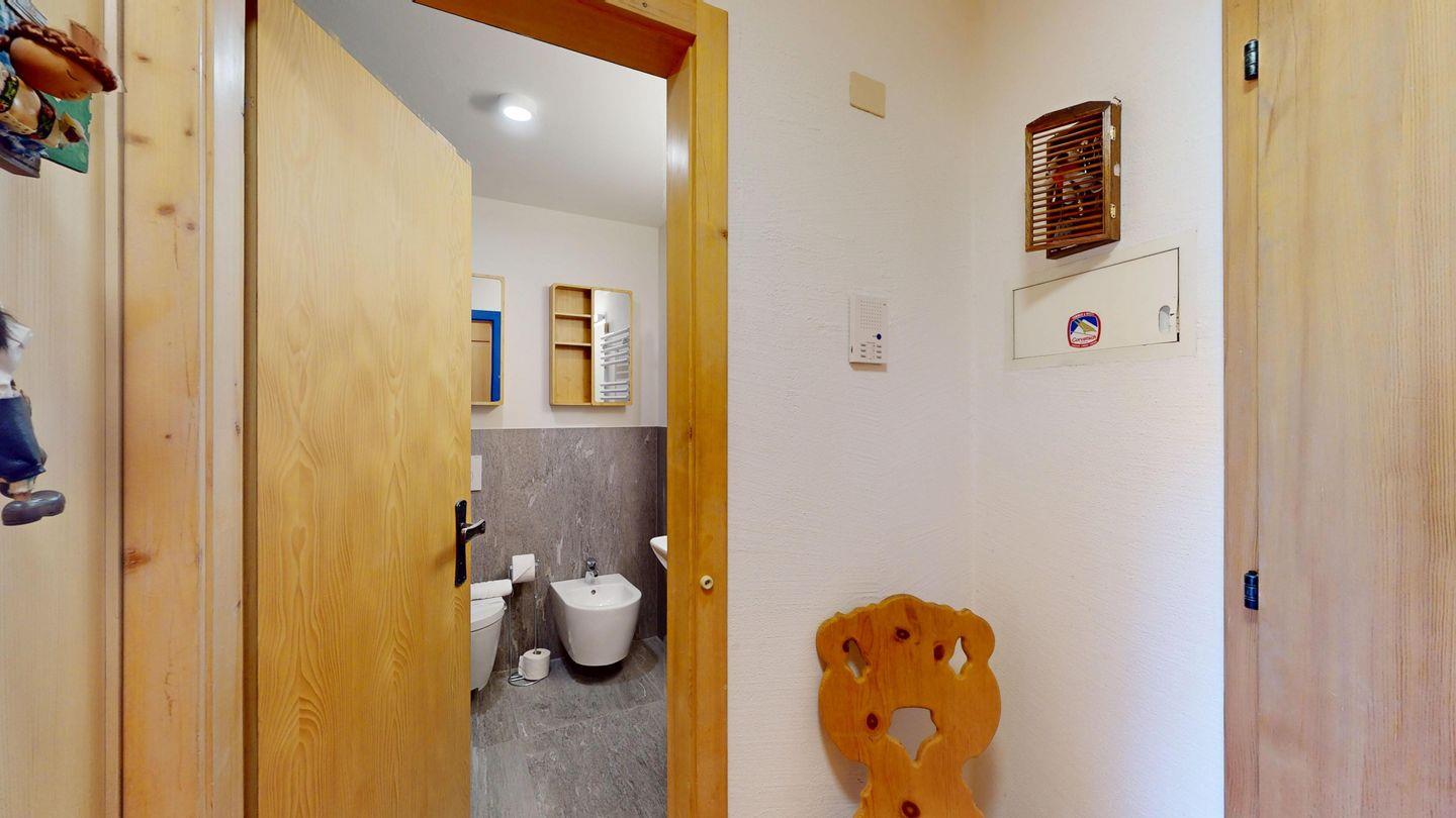 3-Zimmer-Wohnung im Erdgeschoss, Vorraum mit Garderobe, Bad mit Badewanne/Waschbecken und WC. Schlafzimmer mit Doppelbett (zwei Einzelmatratzen). Abgeschlossene Küche mit kleinem Backofen und Geschirrspüler. Chicco d'oro Kaffeemaschine. Grosses Wohn-/Esszimmer mit zwei einzelnen Schrankbetten, die Tür zwischen Wohn- und Esszimmer kann geschlossen werden, um zwei getrennte Räume zu schaffen. Das zweite Bad mit Dusche befindet sich in diesem Teil der Wohnung. Balkon/Garten mit Blick auf die Berge, Balkonmöbel sind vorhanden. Rustikale und gemütliche Einrichtung. Gemeinsame Waschküche. 2 Stellplätze in der Garage. Die Garageneinfahrt ist sehr eng.