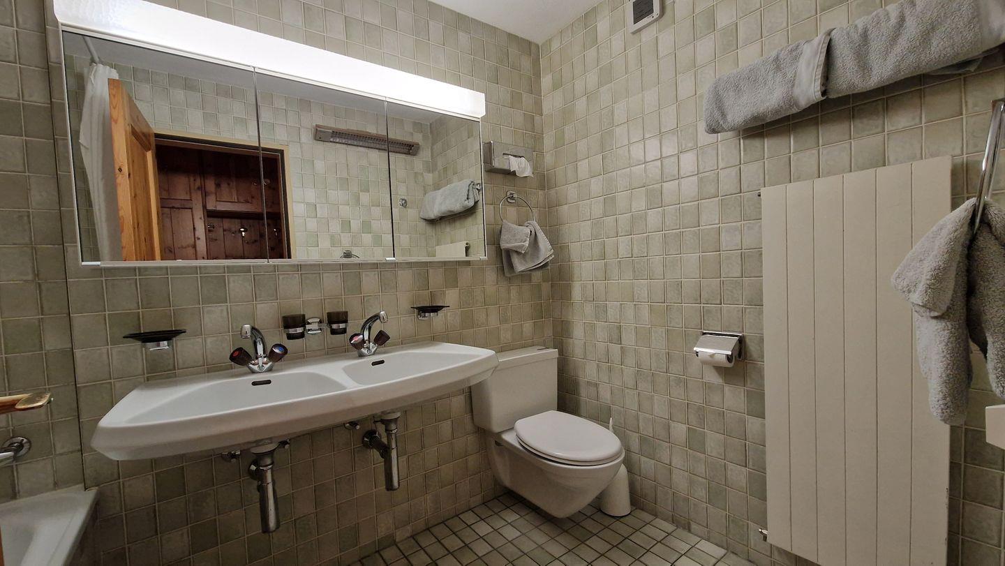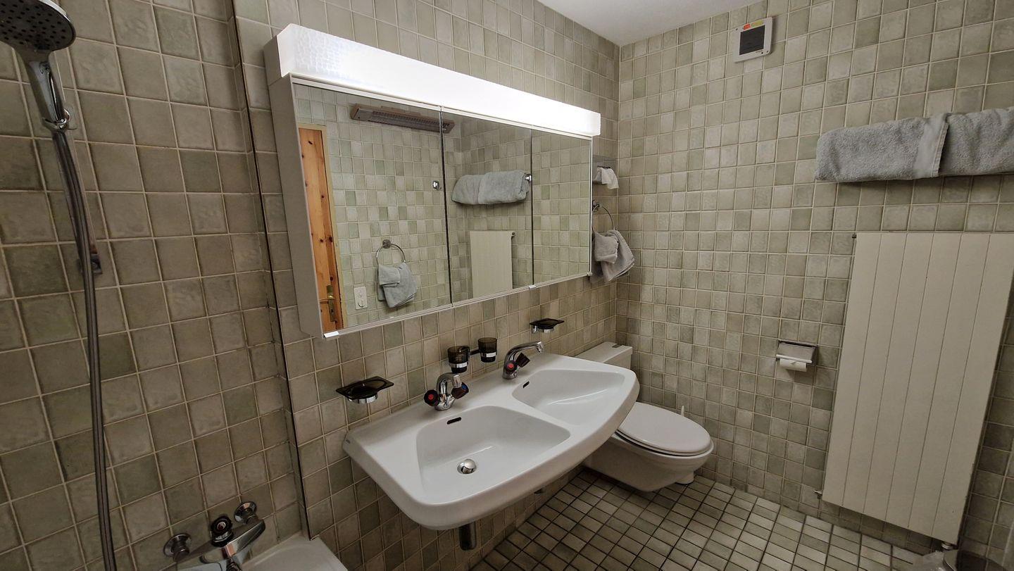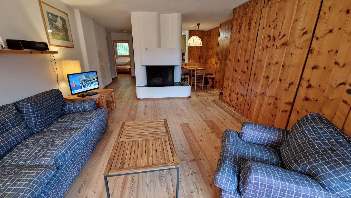 2 1/2-Zimmerwohnung im Haus Chamuotsch, Parterre, 75 m2. Die nach Süden ausgerichtete Terrasse mit direktem Zugang zu Spielplatz und Grillstelle offenbart eine wunderbare Berg- und Seesicht. Die Wohnung bietet ein offenes Wohn-/Esszimmer mit zwei Schrankbetten (90x200), Cheminée und Fernseher, ein Schlafzimmer mit Doppelbett, ein Bad/WC mit Doppellavabo und eine offene Küche mit Backofen, Geschirrspüler, Nespresso-Kaffeemaschine, Toaster und Wasserkocher. Nichtraucherwohnung.