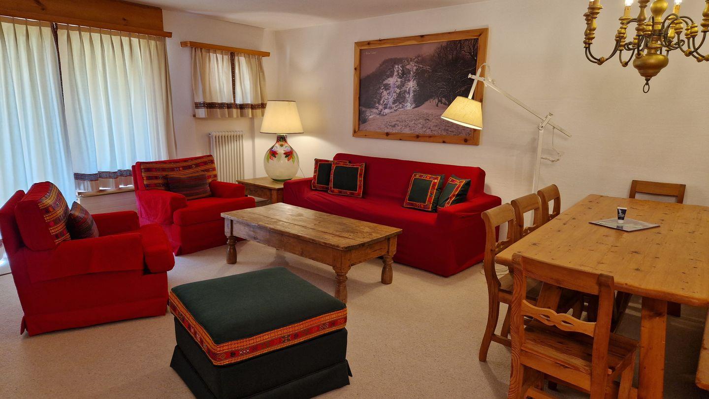 3 1/2-Zimmerwohnung im Haus Chamuotsch, Parterre, 95 m2. Die nach Süden ausgerichtete Terrasse mit direktem Zugang zum Spielplatz und Grillstelle offenbart eine wunderbare Berg- und Seesicht. Die Wohnung bietet ein geräumiges, offenes Wohn-/Esszimmer mit Fernseher, ein Arvenholz-Schlafzimmer mit Doppelbett, ein 4er Schlafzimmer mit zwei Kajüten-Betten, ein Bad/WC und ein separates WC; eine Küche mit Backkofen, Geschirrspüler, Nespresso-Kaffeemaschine und Wasserkocher.