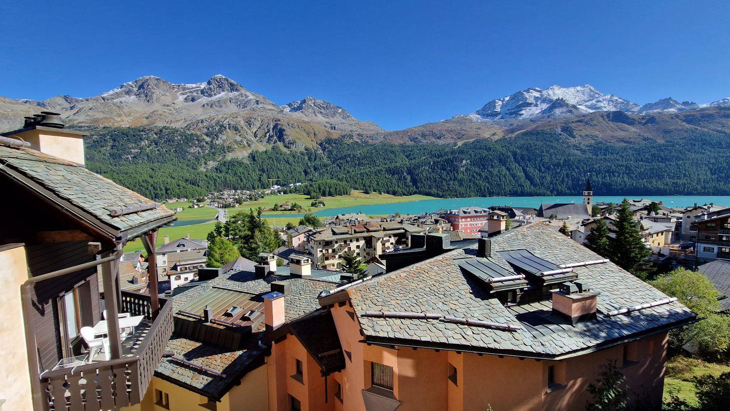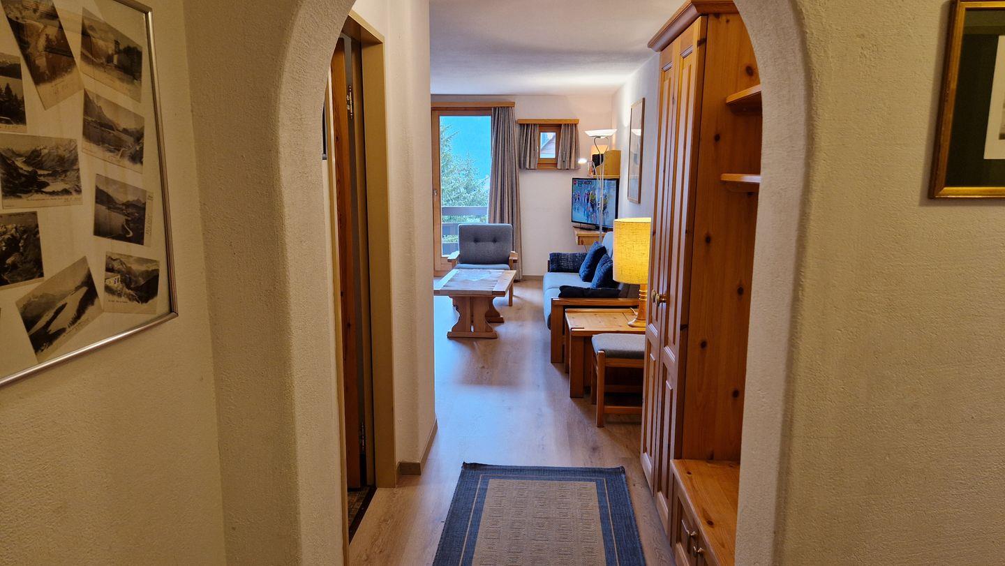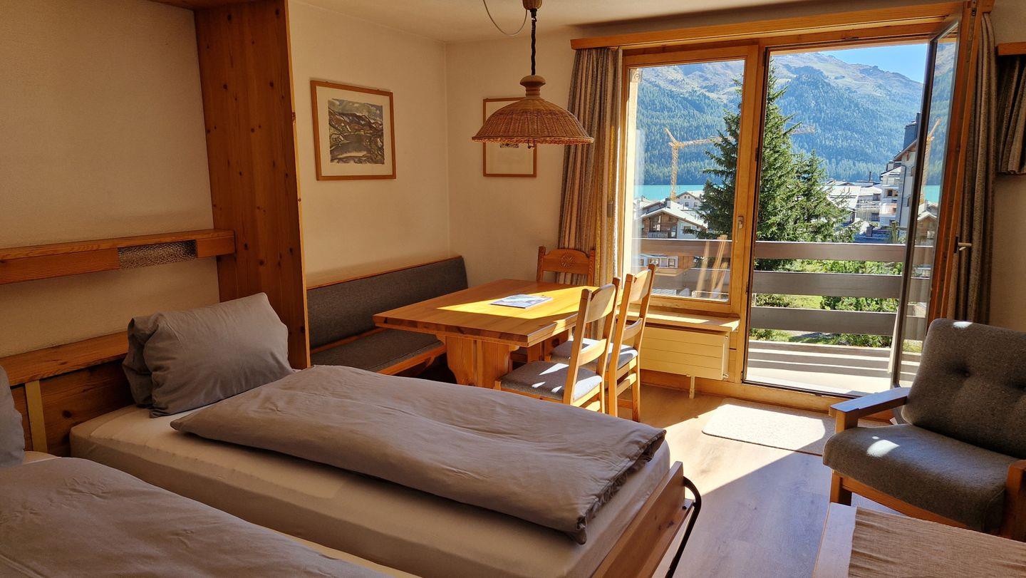 3 1/2-Zimmerwohnung, im Haus Chamuotsch, 1. Stock, 92 m2. Der sonnige Südbalkon bietet eine prächtige Berg- und Seesicht. Die Wohnung verfügt über ein Wohn-/Esszimmer mit zwei Schrankbetten (90x200), Cheminée und Fernseher, ein Schlafzimmer mit Doppelbett, ein 3er-Schlafzimmer mit Kajüten-Bett und einem Einzelbett, ein Bad/WC, eine Küche mit Backofen, Geschirrspüler, Nespresso-Kaffeemaschine und Wasserkocher. Nichtraucherwohnung.