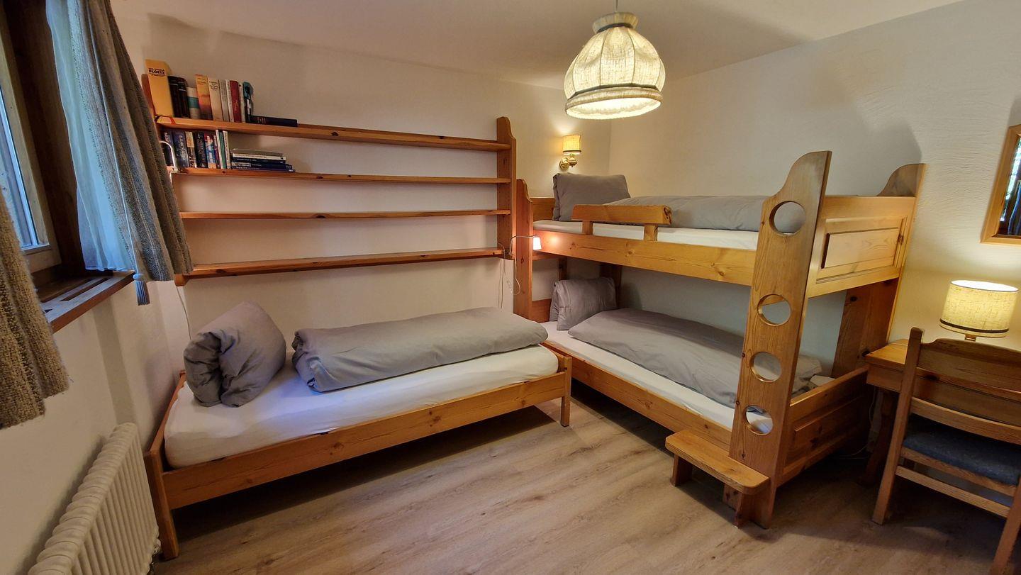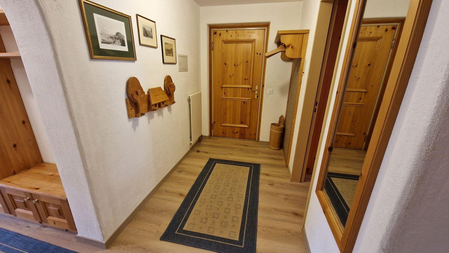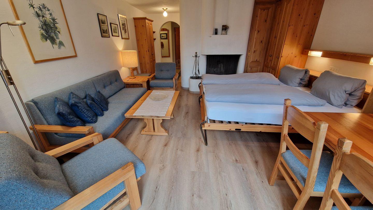 3 1/2-Zimmerwohnung, im Haus Chamuotsch, 1. Stock, 92 m2. Der sonnige Südbalkon bietet eine prächtige Berg- und Seesicht. Die Wohnung verfügt über ein Wohn-/Esszimmer mit zwei Schrankbetten (90x200), Cheminée und Fernseher, ein Schlafzimmer mit Doppelbett, ein 3er-Schlafzimmer mit Kajüten-Bett und einem Einzelbett, ein Bad/WC, eine Küche mit Backofen, Geschirrspüler, Nespresso-Kaffeemaschine und Wasserkocher. Nichtraucherwohnung.