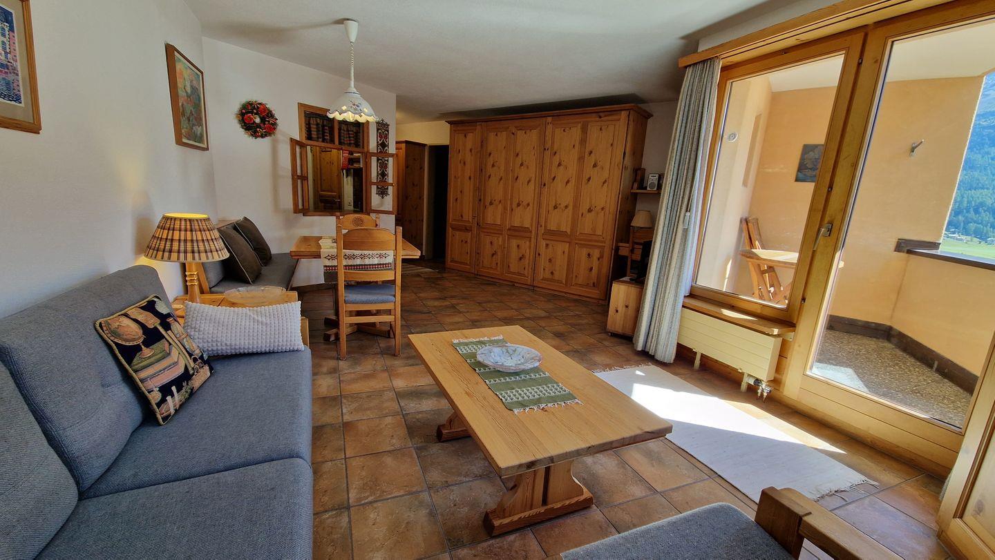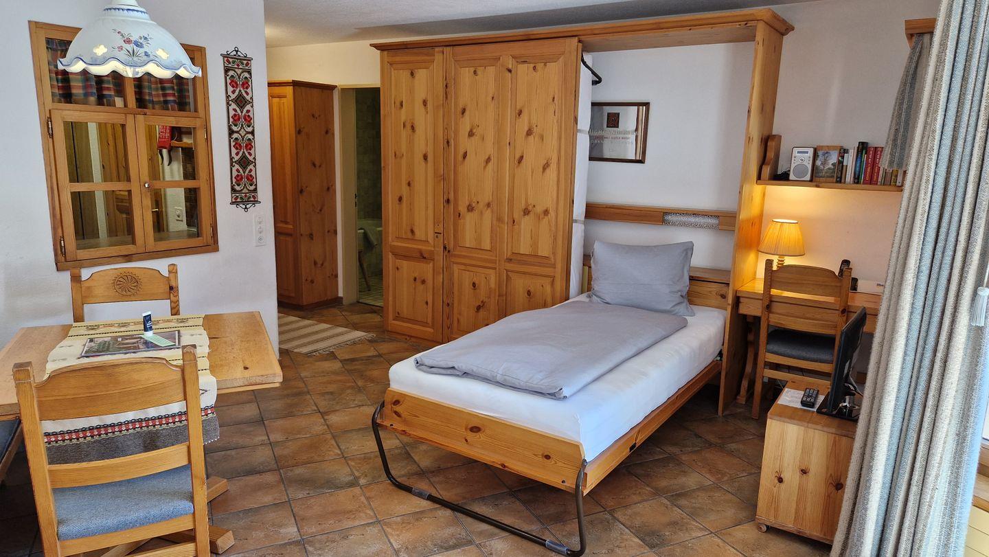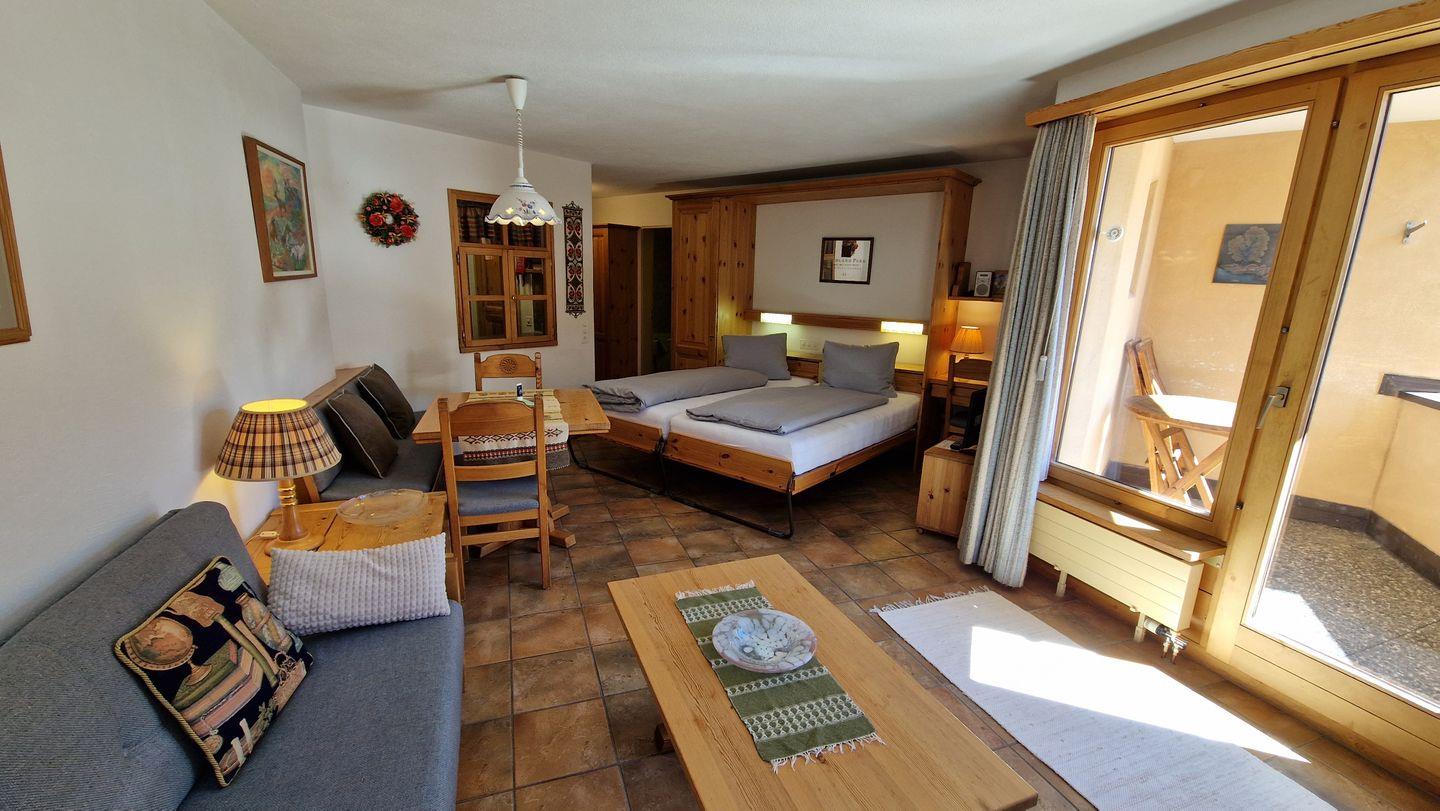 1 1/2-Zimmerwohnung im Haus Rizza, 2. Stock, 45 m2. Das ruhige Studio bietet ein helles, gemütliches Wohn-/Esszimmer mit zwei Schrankbetten (95 x 200) und ein Bad/WC. Die kleine Küche hat eine Durchreiche und ist mit Backofen, Geschirrspüler, Nesspresso-Kapselmaschine und Wasserkocher ausgerüstet. Der nach Süden ausgerichtete Balkon ist windgeschützt und offenbart eine schöne Bergsicht.