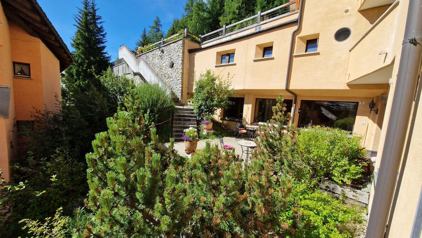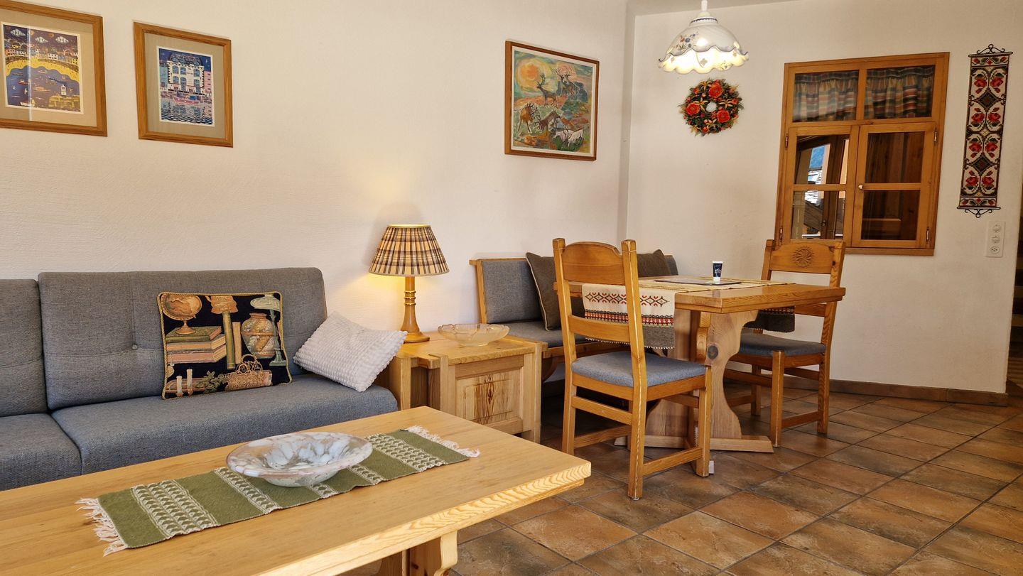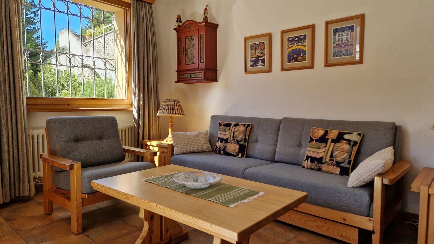 1 1/2-Zimmerwohnung im Haus Rizza, 2. Stock, 45 m2. Das ruhige Studio bietet ein helles, gemütliches Wohn-/Esszimmer mit zwei Schrankbetten (95 x 200) und ein Bad/WC. Die kleine Küche hat eine Durchreiche und ist mit Backofen, Geschirrspüler, Nesspresso-Kapselmaschine und Wasserkocher ausgerüstet. Der nach Süden ausgerichtete Balkon ist windgeschützt und offenbart eine schöne Bergsicht.