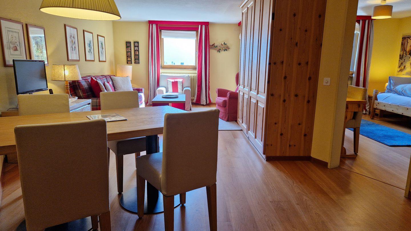 2 1/2-Zimmerwohnung im Haus Rizza, 4. Stock, 85 m2. Die Wohnung bietet ein gemütliches Wohn-/Esszimmer mit zwei Schrankbetten (95x200) und einem Fernseher, ein hübsches Schlafzimmer mit Kajüten-Bett und einem Einzelbett, ein Bad/WC mit Doppellavabo, eine Küche mit Backofen, Geschirrspüler, Nesspresso-Kapselmaschine und Wasserkocher. Der nach Süden ausgerichtete Balkon ist geschützt und offenbart eine prächtige Berg- und Seesicht. Nichtraucherwohnung.