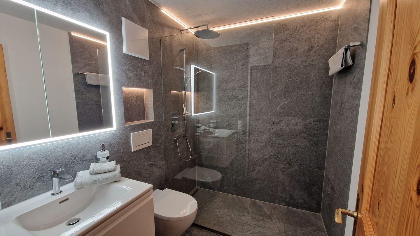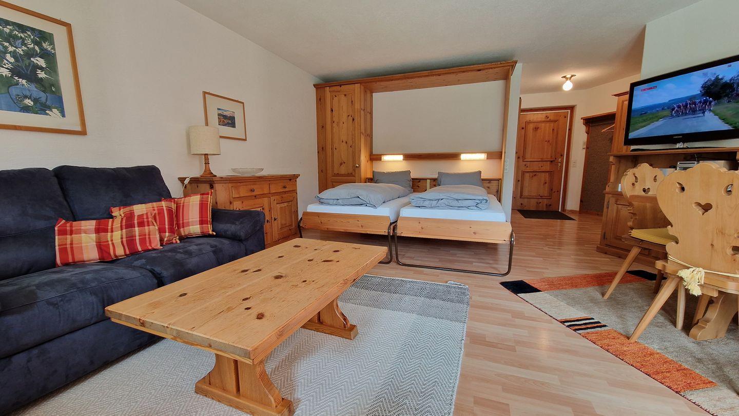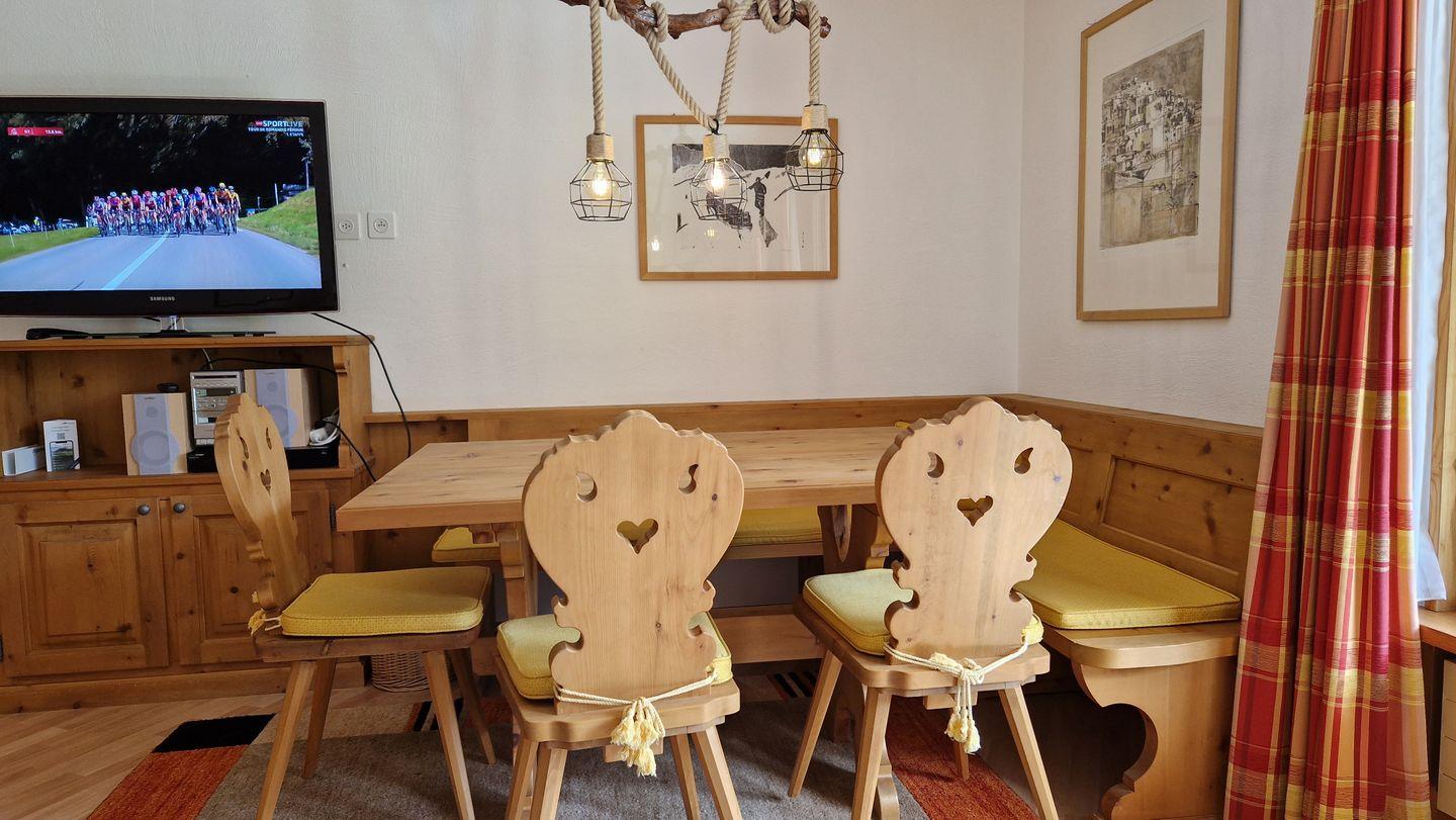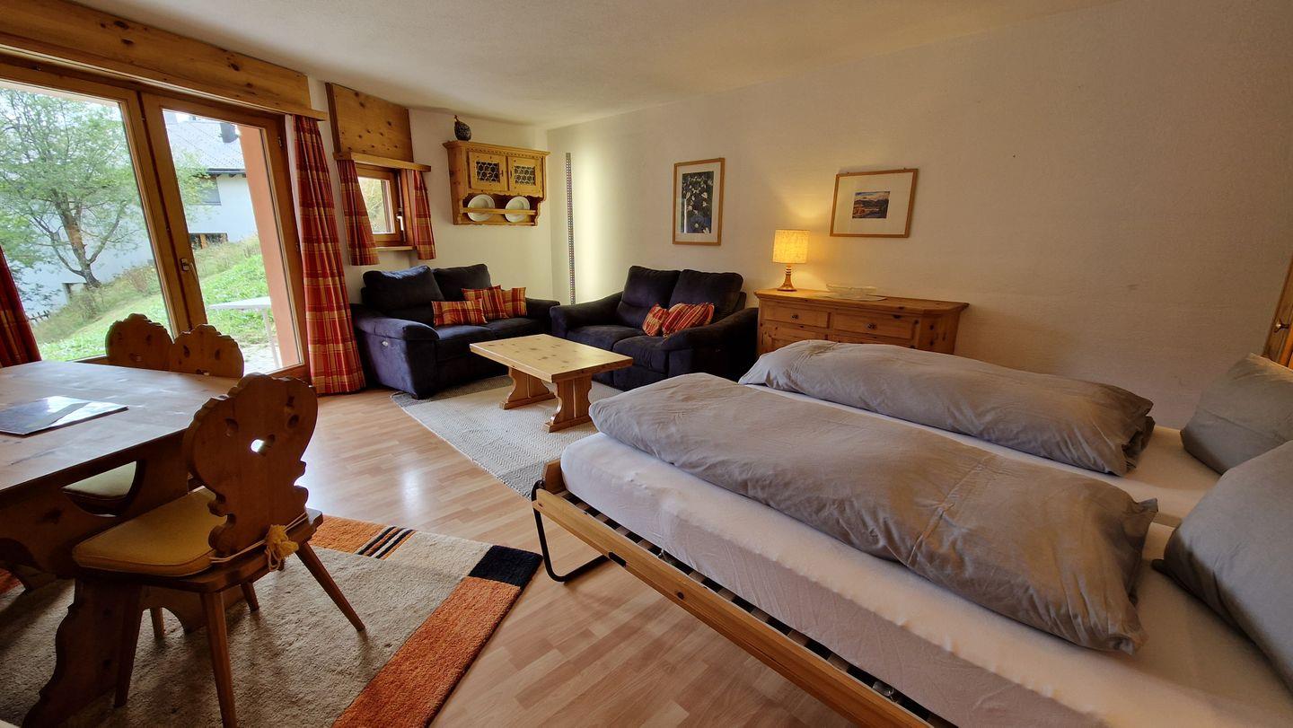 2 1/2-Zimmerwohnung im Haus Leivra, Parterre, 75 m2. Die nach Süden ausgerichtete Wohnung verfügt über ein grosszügiges Wohn-/Esszimmer mit zwei Schrankbetten (90x200) und Fernseher, ein helles Schlafzimmer mit Boxspring-Bett (180 x 200), ein neues Bad mit Dusche/WC und eine Küche mit Backofen, Geschirrspüler, Nesspresso-Kapselmaschine und Wasserkocher. Die gedeckte Terrasse ist nach Süden ausgerichtet und bietet eine schöne Aussicht in die Berge.