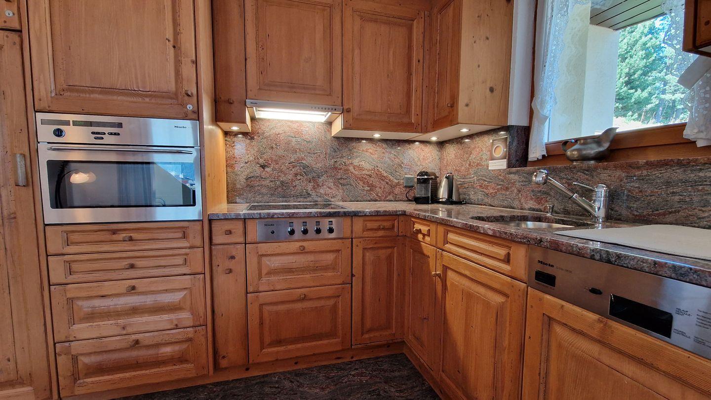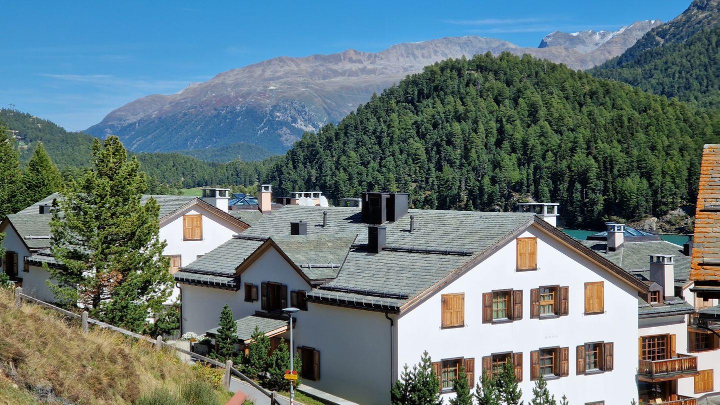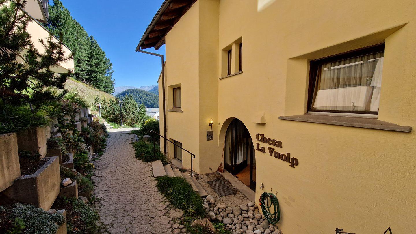 3-Zimmerwohnung im Haus la Vuolp, 2. Stock, 90 m2. Die mit Arvenmöbel ausgestattete Wohnung verfügt über ein grosszügiges helles Wohn-/Esszimmer mit offener Küche und Fernseher, eine gemütliche Essnische mit Blick auf Muotas Muragl, ein Schlafzimmer mit Doppelbett und ein kleines Schlafzimmer mit Schrankbett (140x200), ein Bad/WC und ein separates WC sowie eine Küche, welche mit Backofen, Geschirrspüler, Nesspresso-Kapselmaschine und Wasserkocher ausgerüstet ist. Der gedeckte Balkon bietet einen Ausblick auf das Corvatschgebiet.