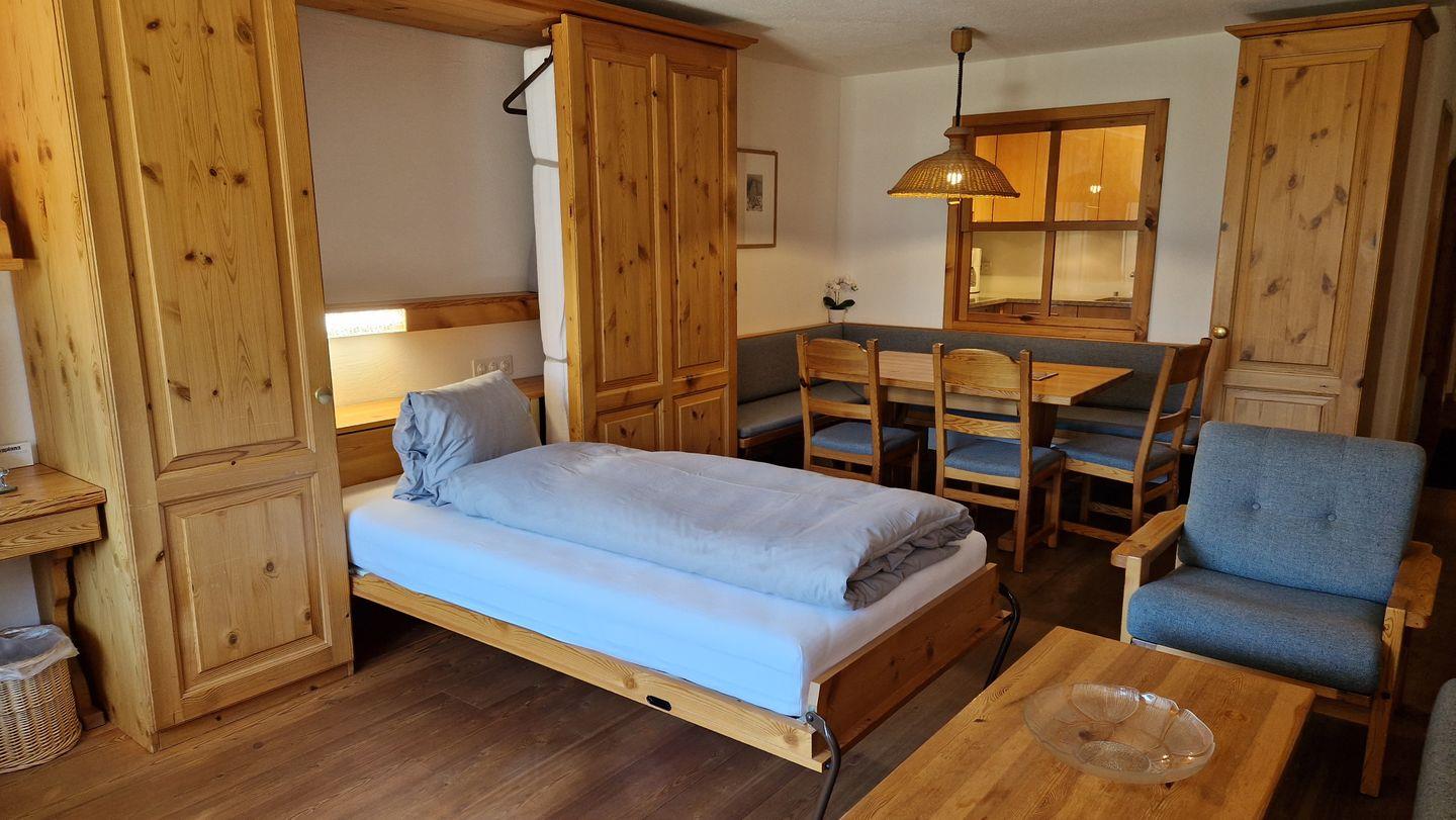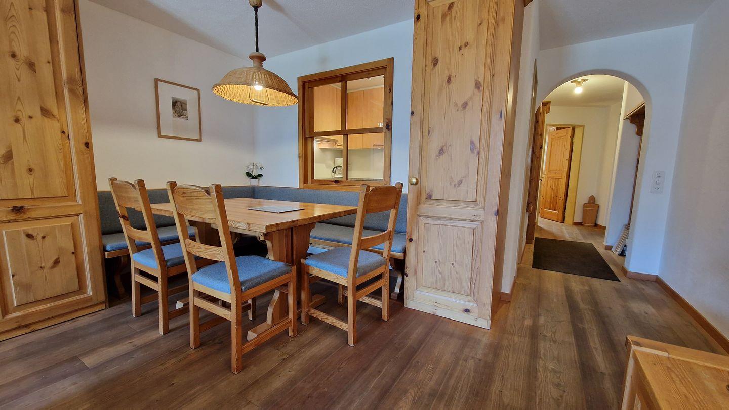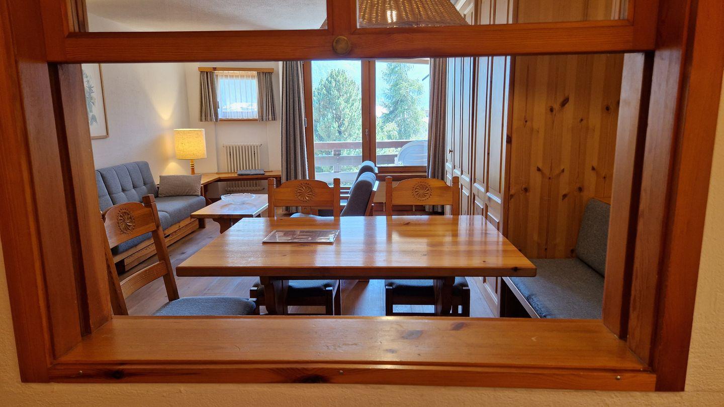 2 1/2-Zimmerwohnung im Haus la Vuolp, 2. Stock, 74 m2. Die Wohnung verfügt über ein Wohn-/Esszimmer mit zwei Schrankbetten (90x200), Fernseher und einer Leseecke, ein Schlafzimmer mit Doppelbett, ein Bad mit Regendusche und WC sowie eine Küche mit Durchreiche, Backofen, Geschirrspüler, Nesspresso-Kapselmaschine und Wasserkocher. Der gedeckte und geschützte Balkon bietet einen Ausblick in die Bergwelt.