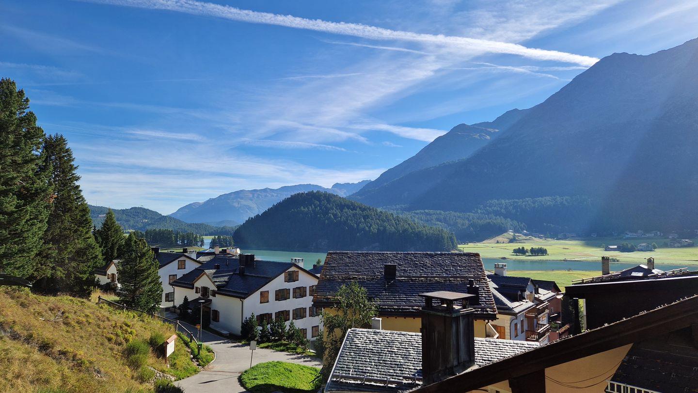 3 1/2-Zimmerwohnung, Haus la Vuolp, 3. Stock, 90 m2. Der sonnige Südbalkon bietet eine prächtige Berg- und Seesicht. Die Dachwohnung verfügt über ein gemütliches Wohn-/Esszimmer in der Dachschräge mit Fernseher, ein Schlafzimmer mit Doppelbett (160x200), ein 4er-Schlafzimmer mit zwei Kajüten-Betten, ein Bad/WC sowie ein separates WC, eine kleine Küche mit Backofen, Geschirrspüler, Nespresso-Kaffeemaschine und Toaster.