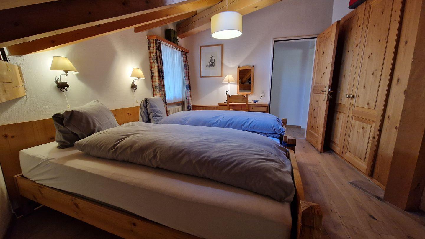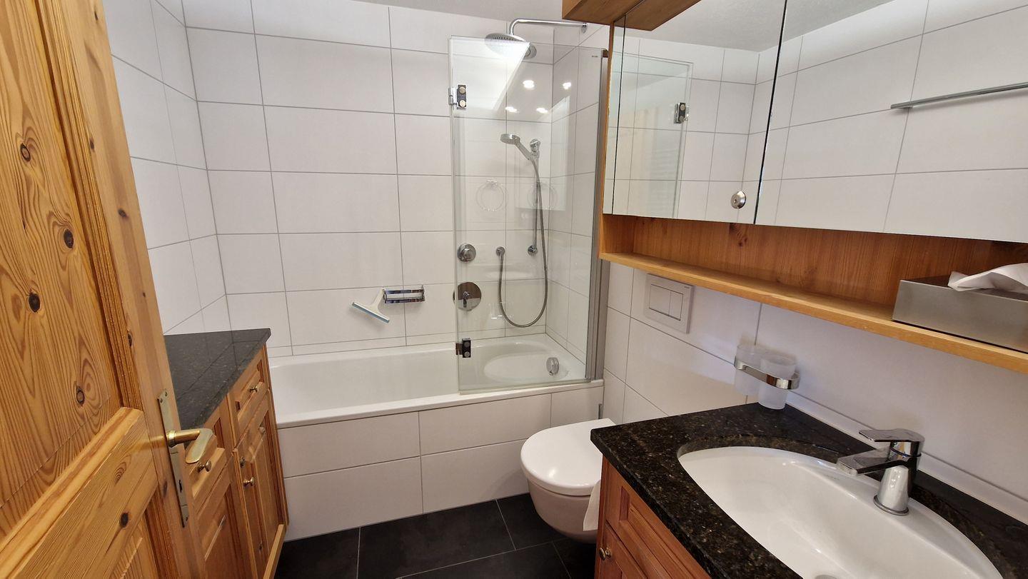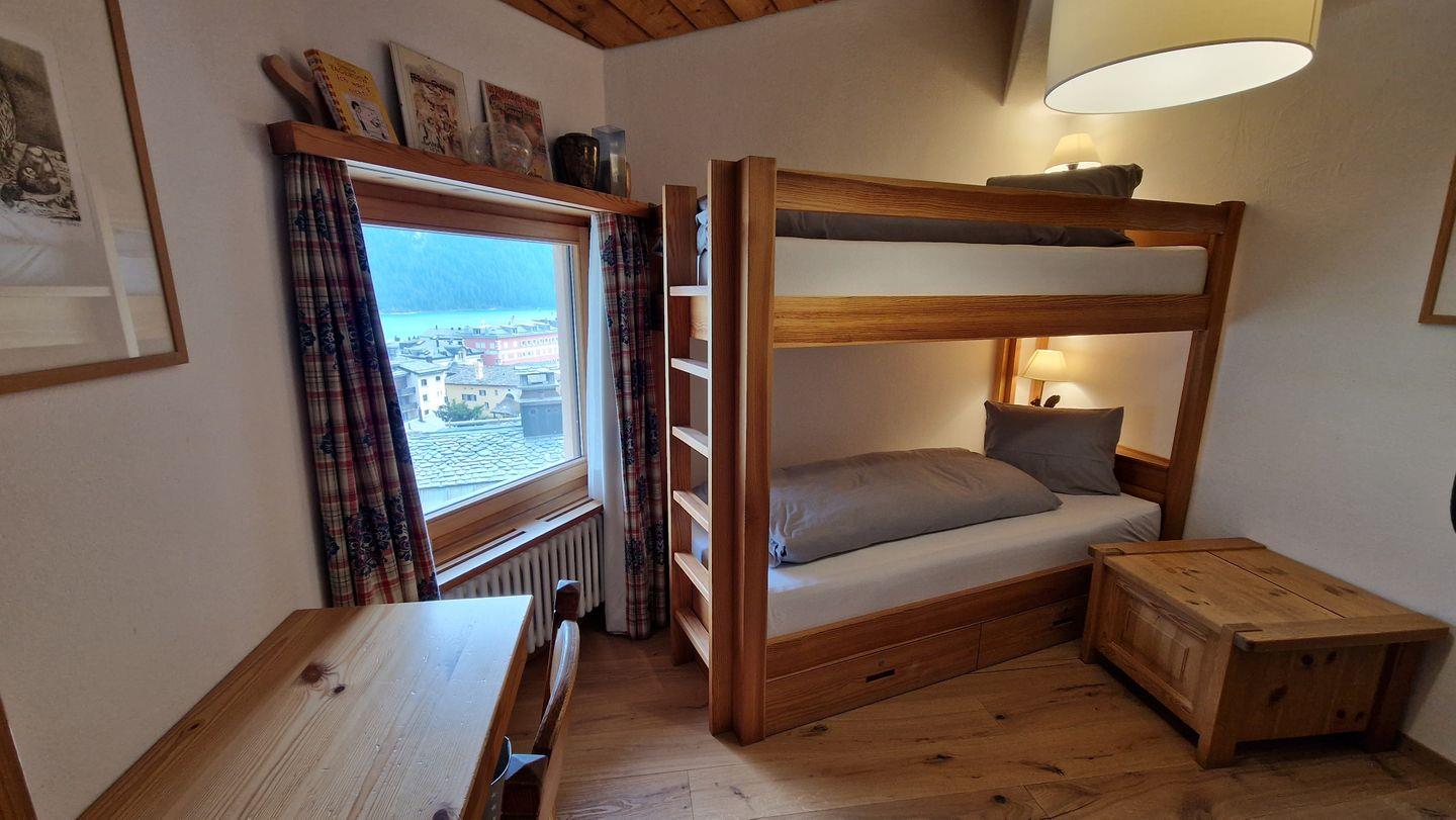 4 1/2-Zimmerwohnung im Haus Rizza, 4. Stock, 120 m2. Die Wohnung bietet ein gemütliches Wohn-/Esszimmer, ein Schlafzimmer mit Doppelbett, ein Schlafzimmer in der Dachschräge mit WC, ein Schlafzimmer mit Kajütenbett, ein Bad/WC mit Regendusche und eine offene Küche mit Backofen, Geschirrspüler, Nesspresso-Kapselmaschine, Toaster und Wasserkocher. Der nach Süden ausgerichtete Balkon offenbart eine prächtige Berg- und Seesicht. Nichtraucherwohnung.