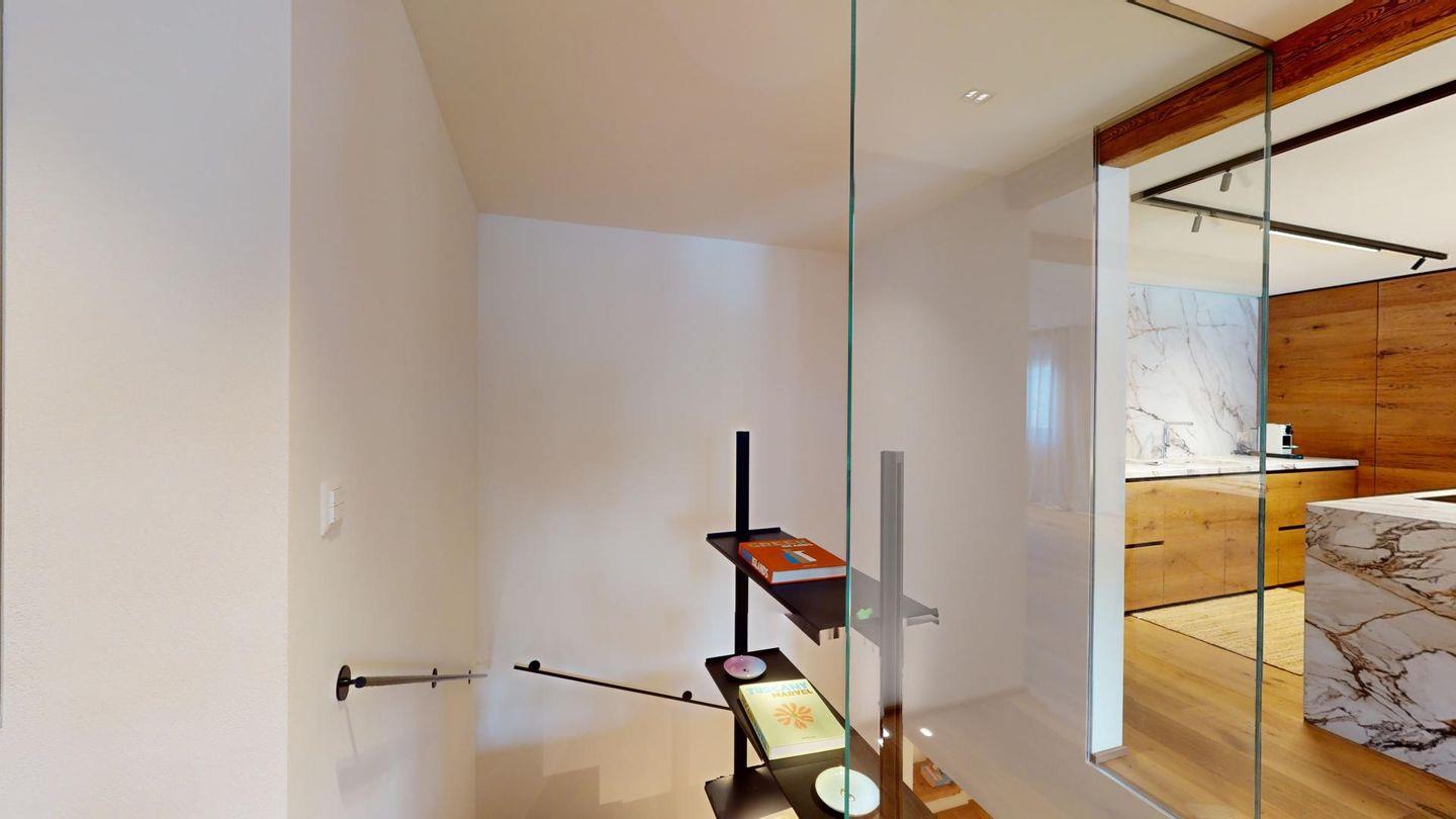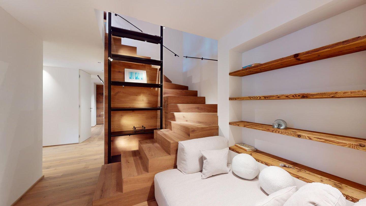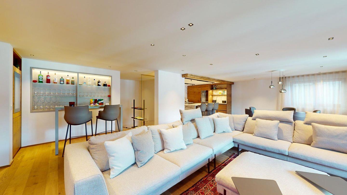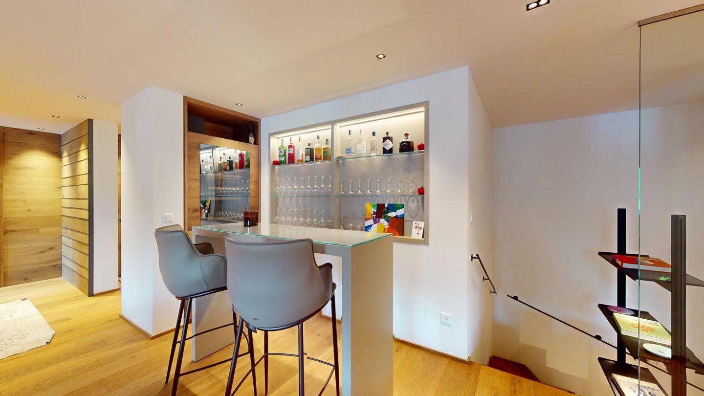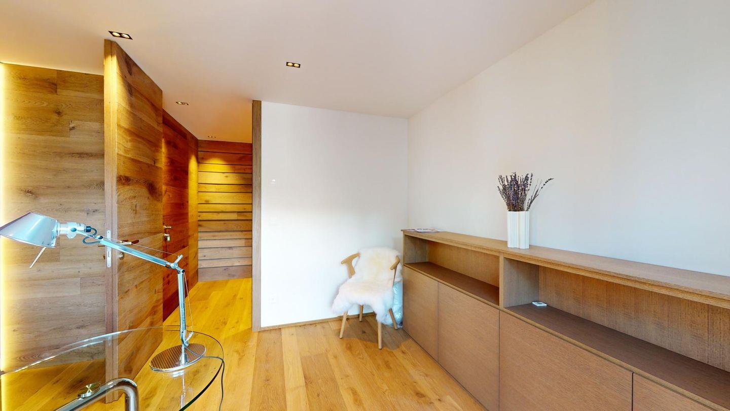 Im oberen Geschoss befindet sich der weitläufige Wohnbereich mit offener Küche, angrenzendem grossen Esstisch und grosszügiger TV-Ecke, sowie ein Barbereich. Vom Wohnzimmer aus kommt man zu einem abgeschlossenen Arbeitszimmer, einer Garderobe und einem Gäste-WC.