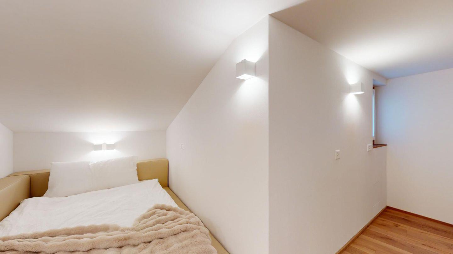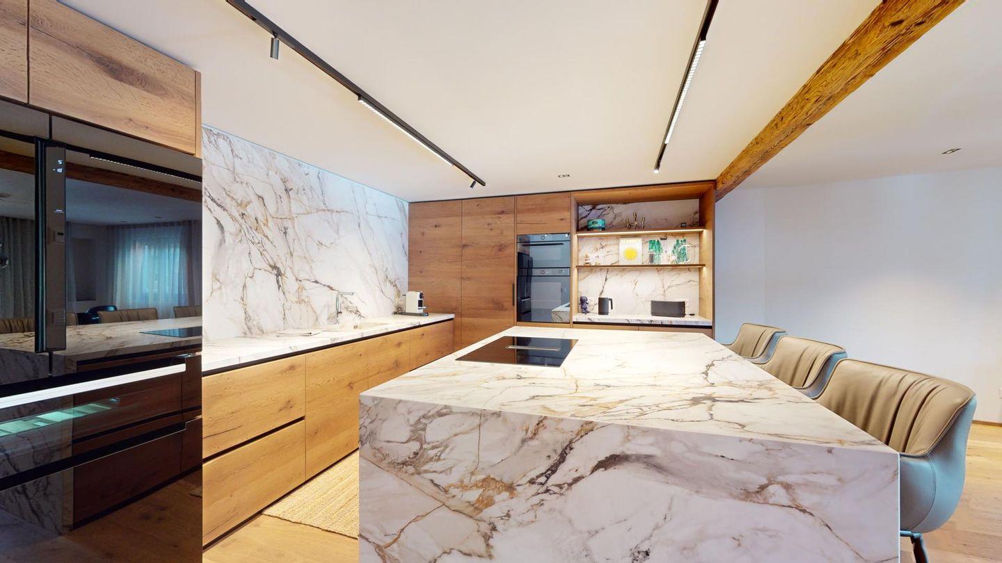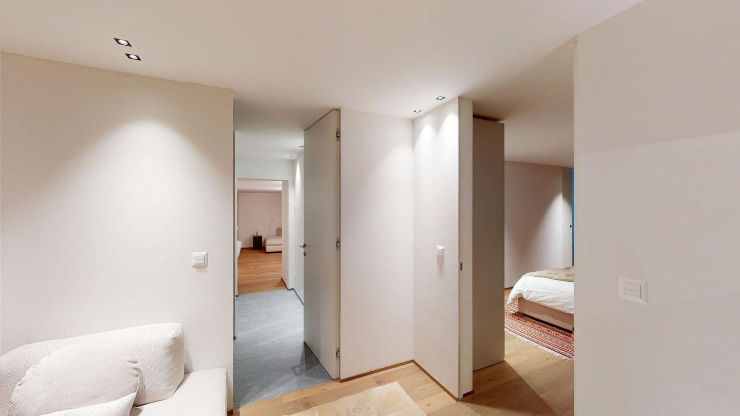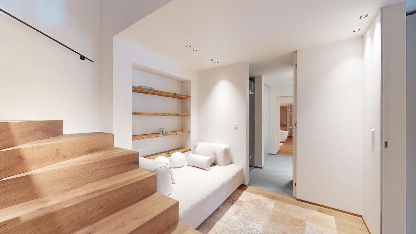 Im oberen Geschoss befindet sich der weitläufige Wohnbereich mit offener Küche, angrenzendem grossen Esstisch und grosszügiger TV-Ecke, sowie ein Barbereich. Vom Wohnzimmer aus kommt man zu einem abgeschlossenen Arbeitszimmer, einer Garderobe und einem Gäste-WC.