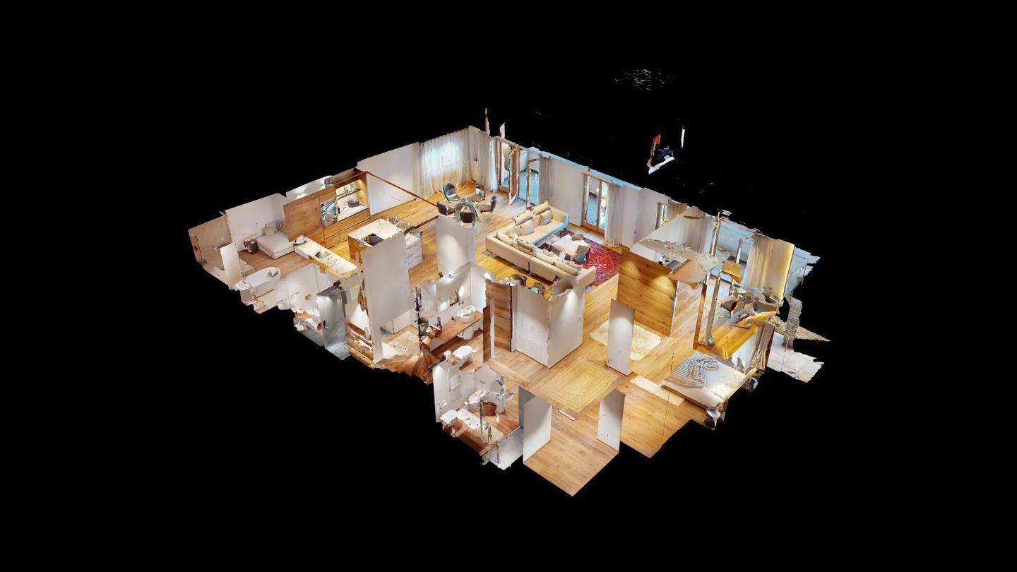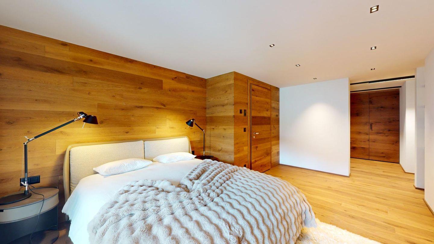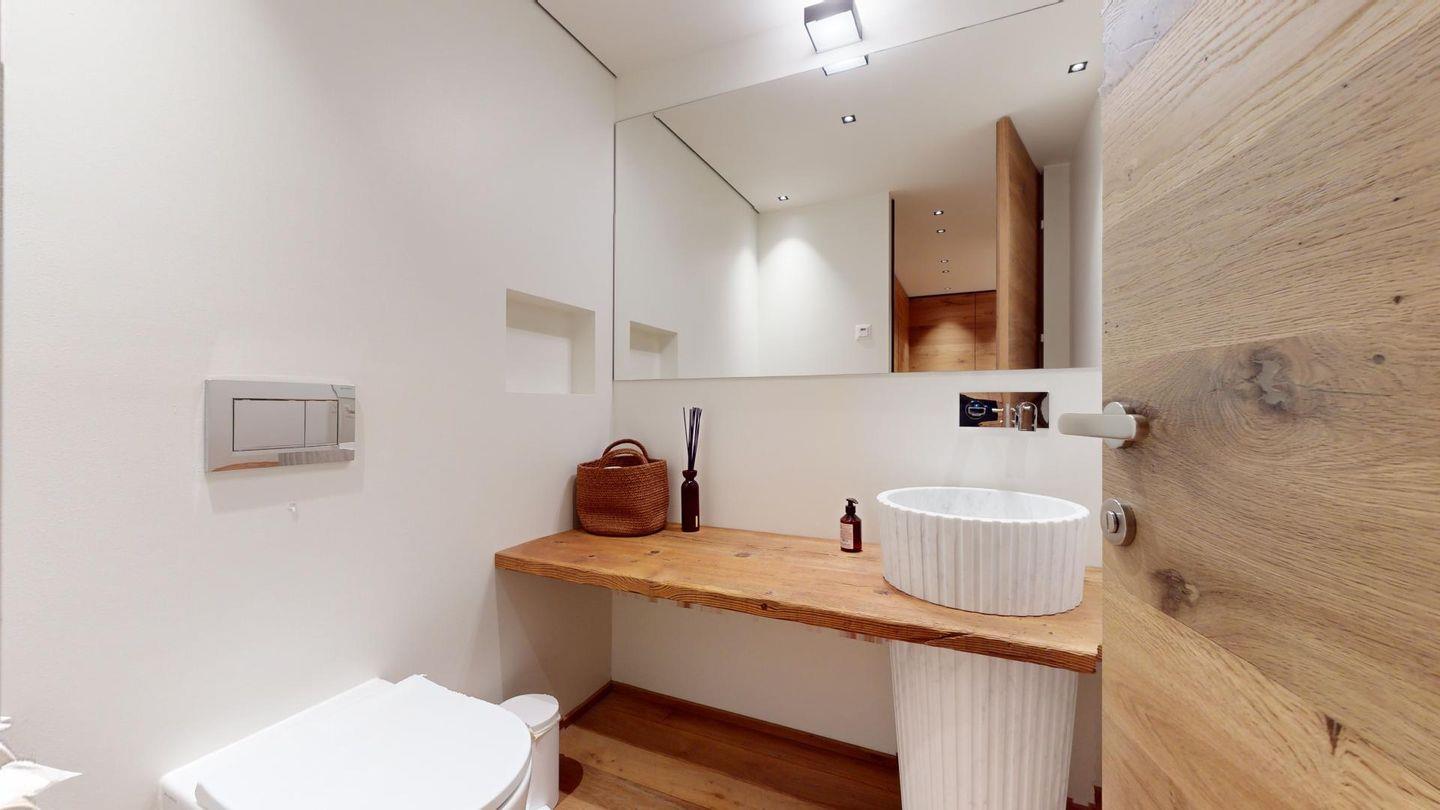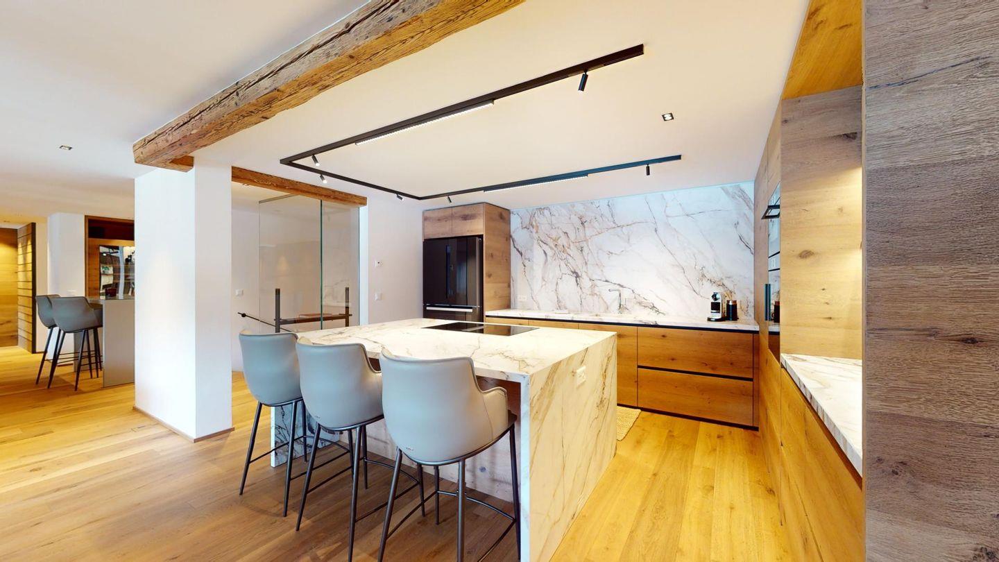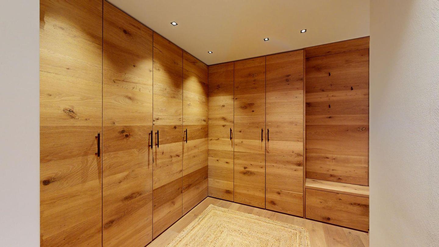 Im oberen Geschoss befindet sich der weitläufige Wohnbereich mit offener Küche, angrenzendem grossen Esstisch und grosszügiger TV-Ecke, sowie ein Barbereich. Vom Wohnzimmer aus kommt man zu einem abgeschlossenen Arbeitszimmer, einer Garderobe und einem Gäste-WC.