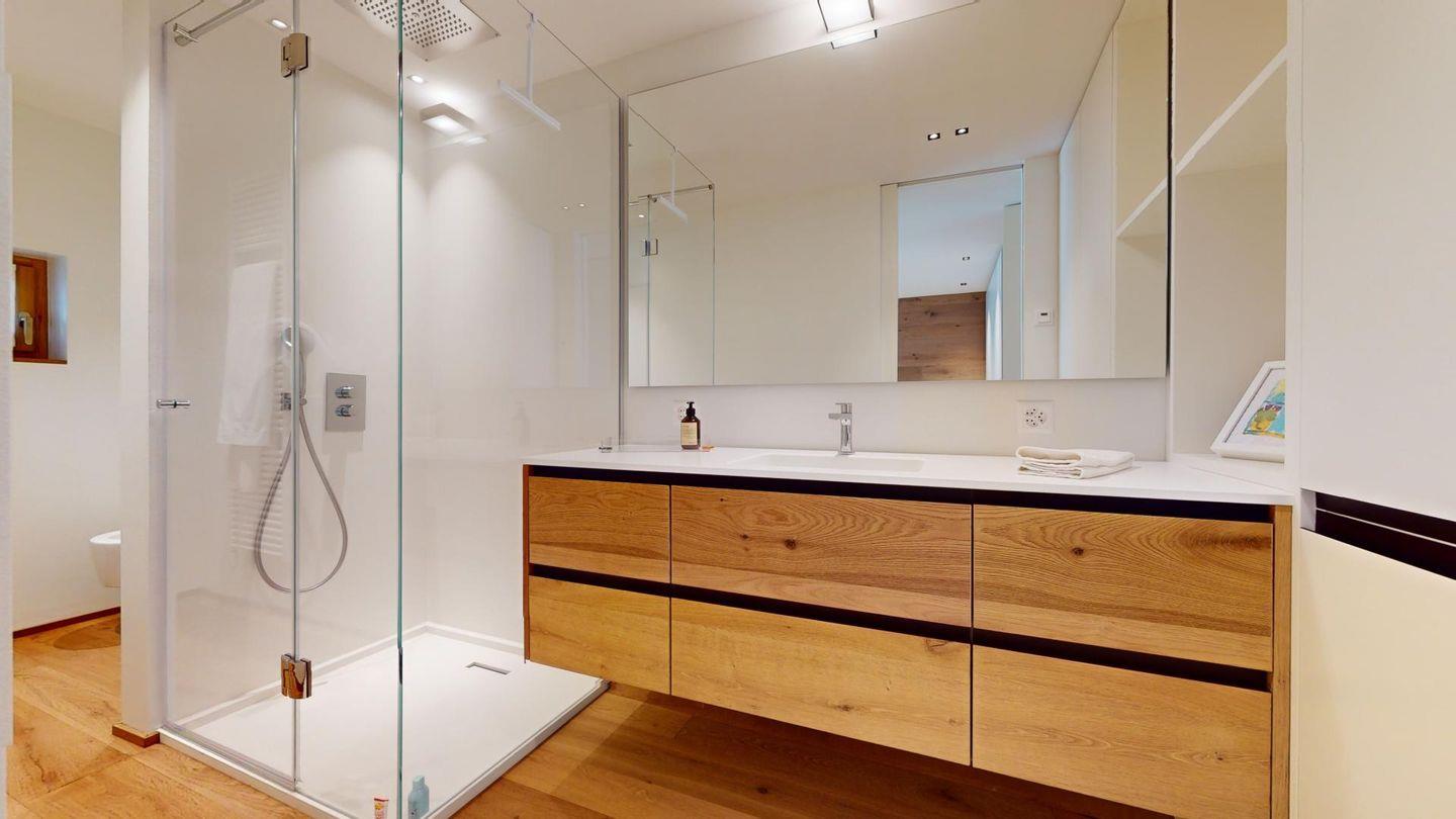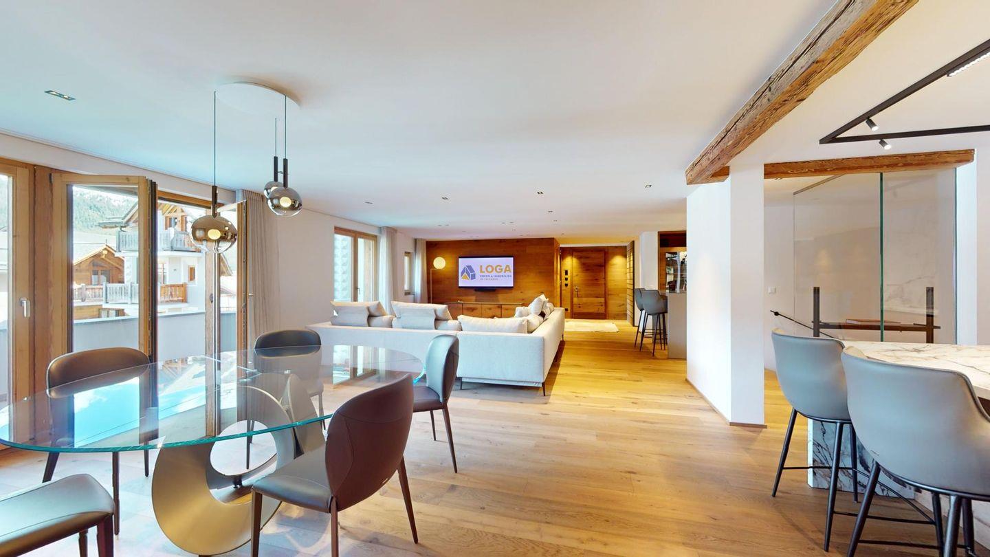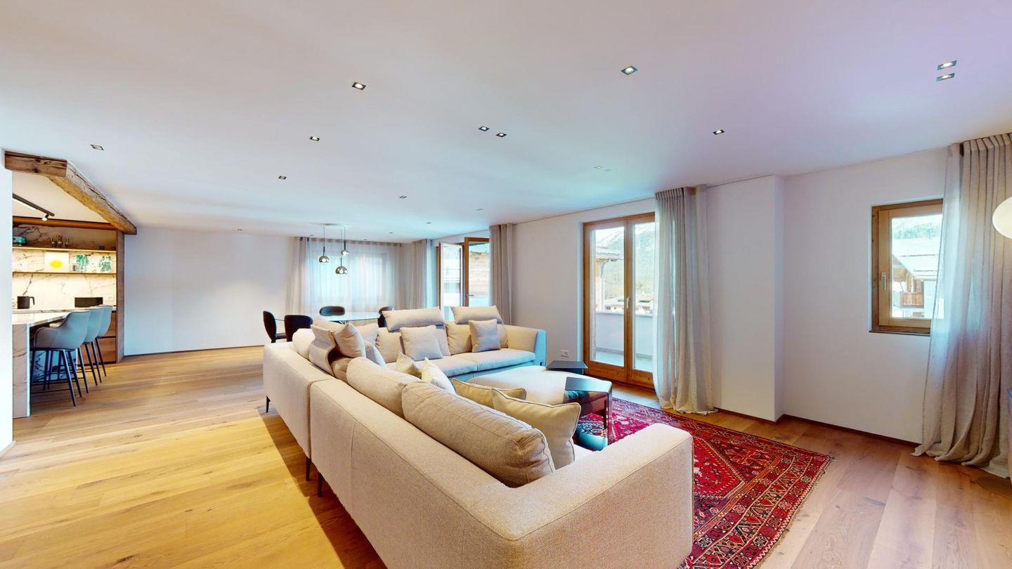 Sehr grosszügige und geschmackvoll eingerichtete 5-Zimmer-Maisonettewohnung mit grosser überdachter Terrasse im Erdgeschoss, und Balkon im 1. Obergeschoss, welche eine imposante Sicht auf die Bergwelt bieten.