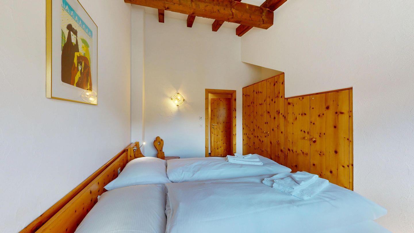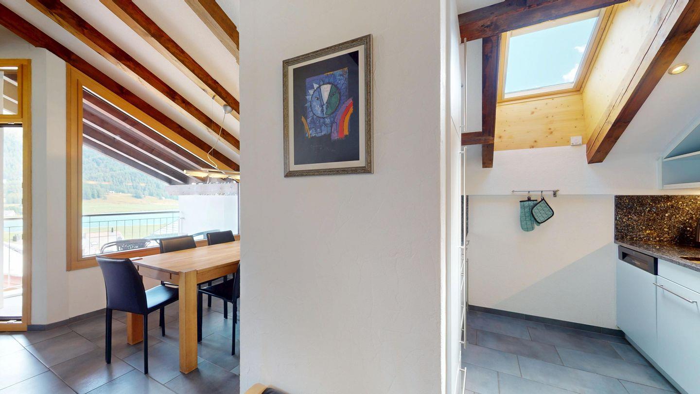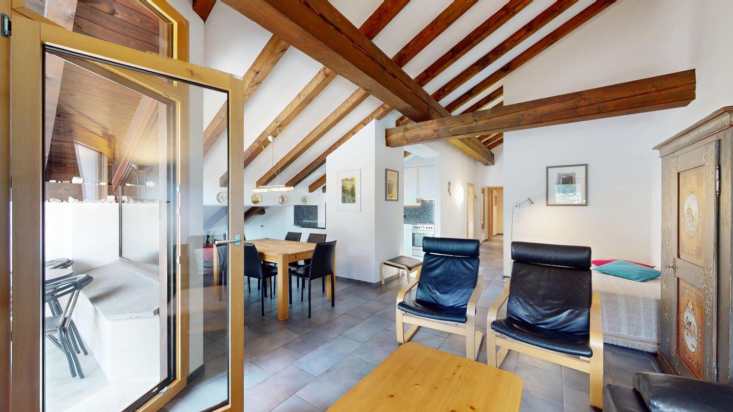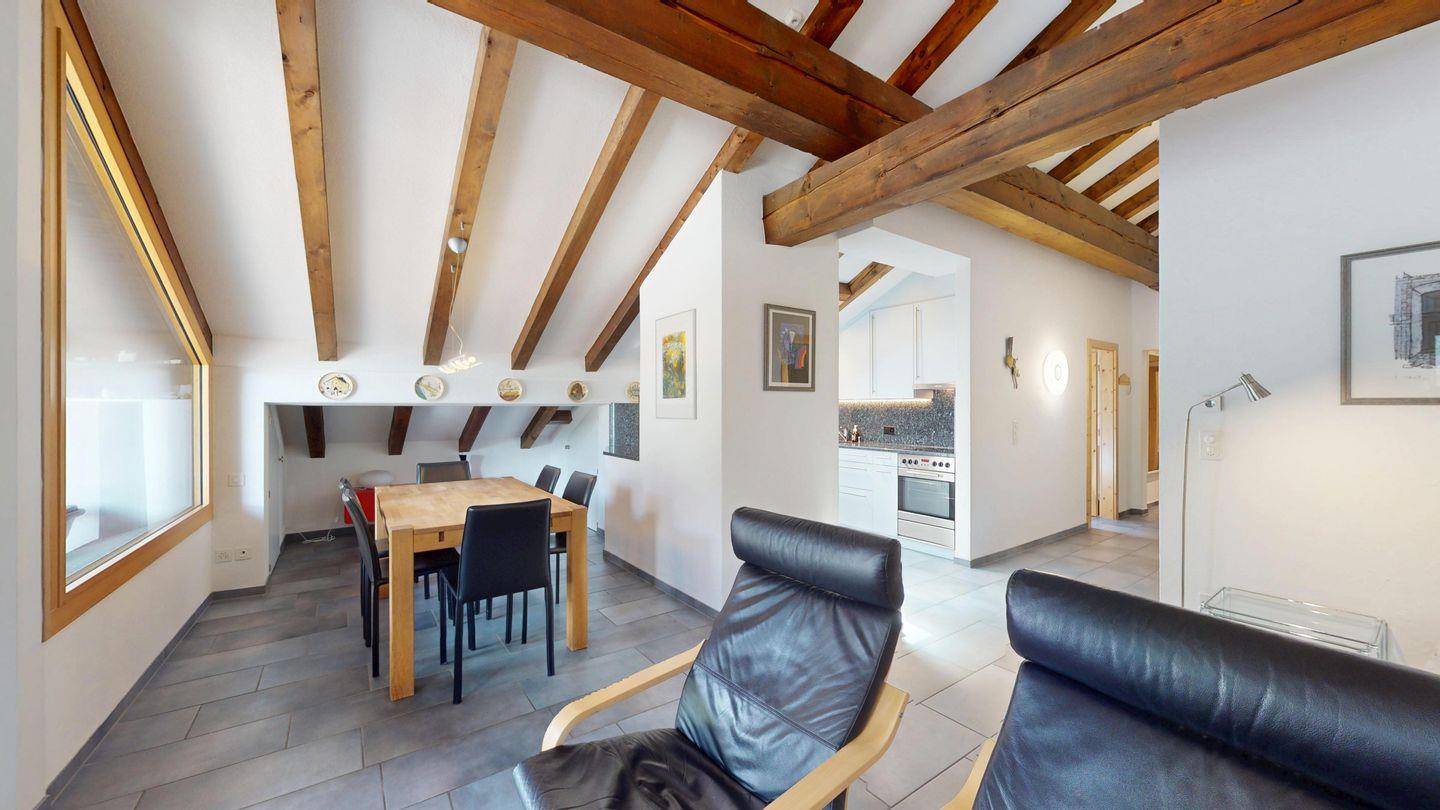 3-Zimmer-Dachwohnung, abgeschrägt, im 3. Stock, 87 m2. Wohnzimmer mit 2 Schlafmöglichkeiten und Balkon. Radio, Fernseher. Küche offen gegen das Wohnzimmer mit Backofen, Geschirrspüler und Kühlschrank mit separatem Tiefkühlfach. CHICCO D'ORO Kaffeemaschine. Ein Zweibettzimmer. Dusche/WC/Lavabo. Separater Schlafteil mit Garderobe, ein Doppelzimmer, Bad/WC/Lavabo. Der Spabereich des Hotels Albana kann zum Preis von CHF 25.00 pro Person und Tag genutzt werden, Anmeldung und Zahlung direkt im Hotel. 1 Garagenplatz und 1 Aussenparkplatz. Skiraum zur Mitbenützung. Haustiere sind nicht erlaubt.