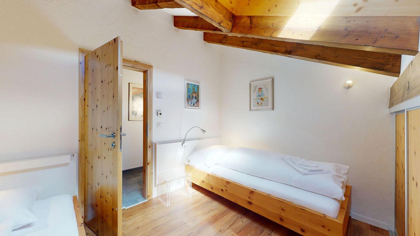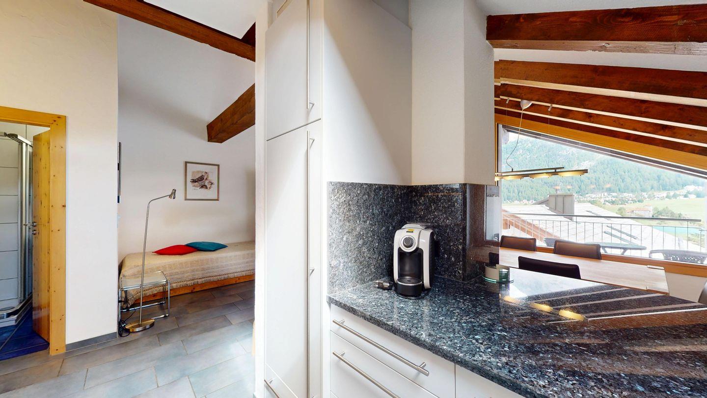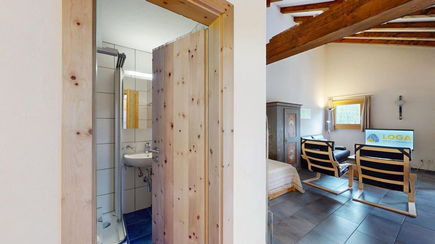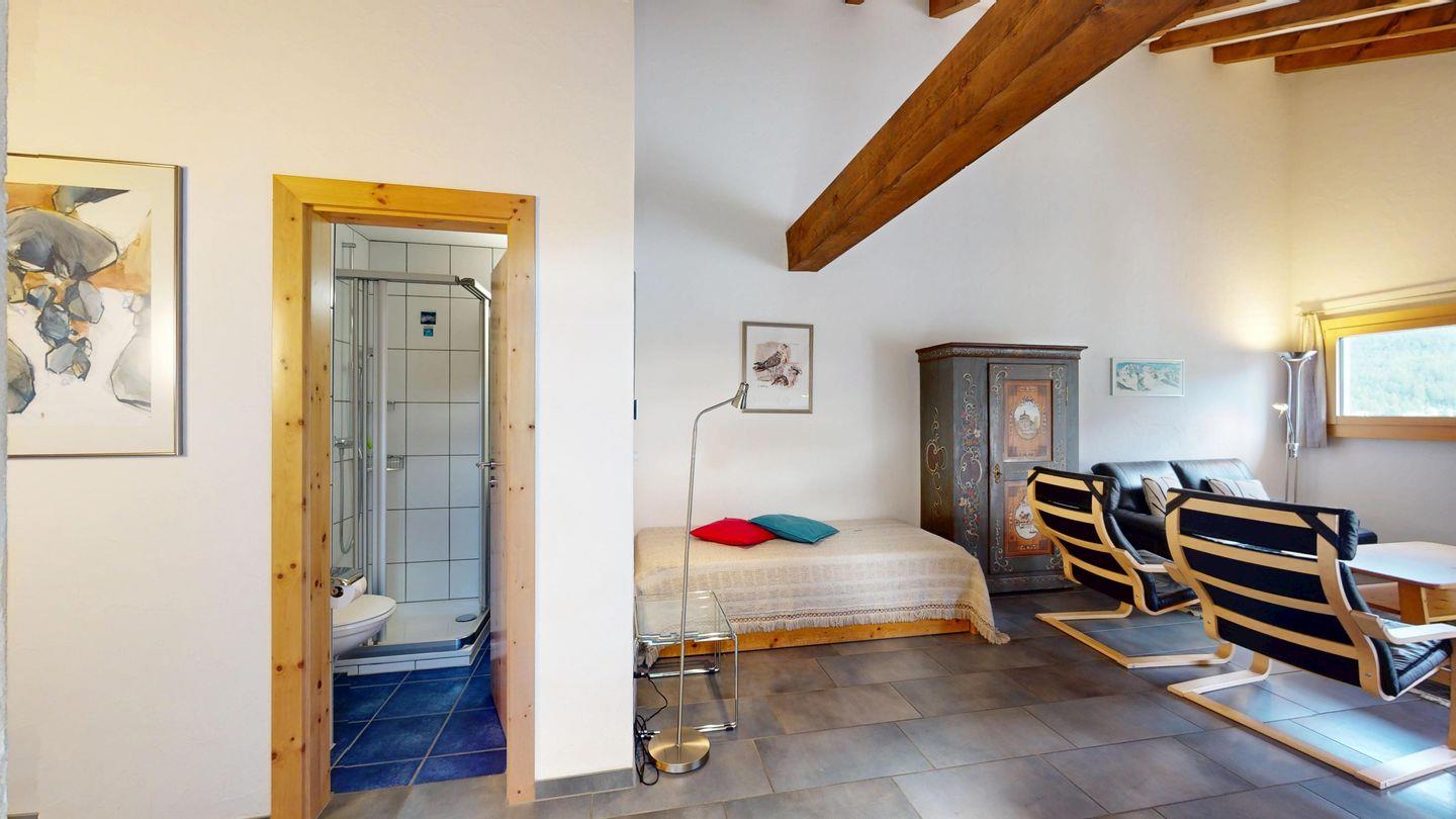 3-Zimmer-Dachwohnung, abgeschrägt, im 3. Stock, 87 m2. Wohnzimmer mit 2 Schlafmöglichkeiten und Balkon. Radio, Fernseher. Küche offen gegen das Wohnzimmer mit Backofen, Geschirrspüler und Kühlschrank mit separatem Tiefkühlfach. CHICCO D'ORO Kaffeemaschine. Ein Zweibettzimmer. Dusche/WC/Lavabo. Separater Schlafteil mit Garderobe, ein Doppelzimmer, Bad/WC/Lavabo. Der Spabereich des Hotels Albana kann zum Preis von CHF 25.00 pro Person und Tag genutzt werden, Anmeldung und Zahlung direkt im Hotel. 1 Garagenplatz und 1 Aussenparkplatz. Skiraum zur Mitbenützung. Haustiere sind nicht erlaubt.