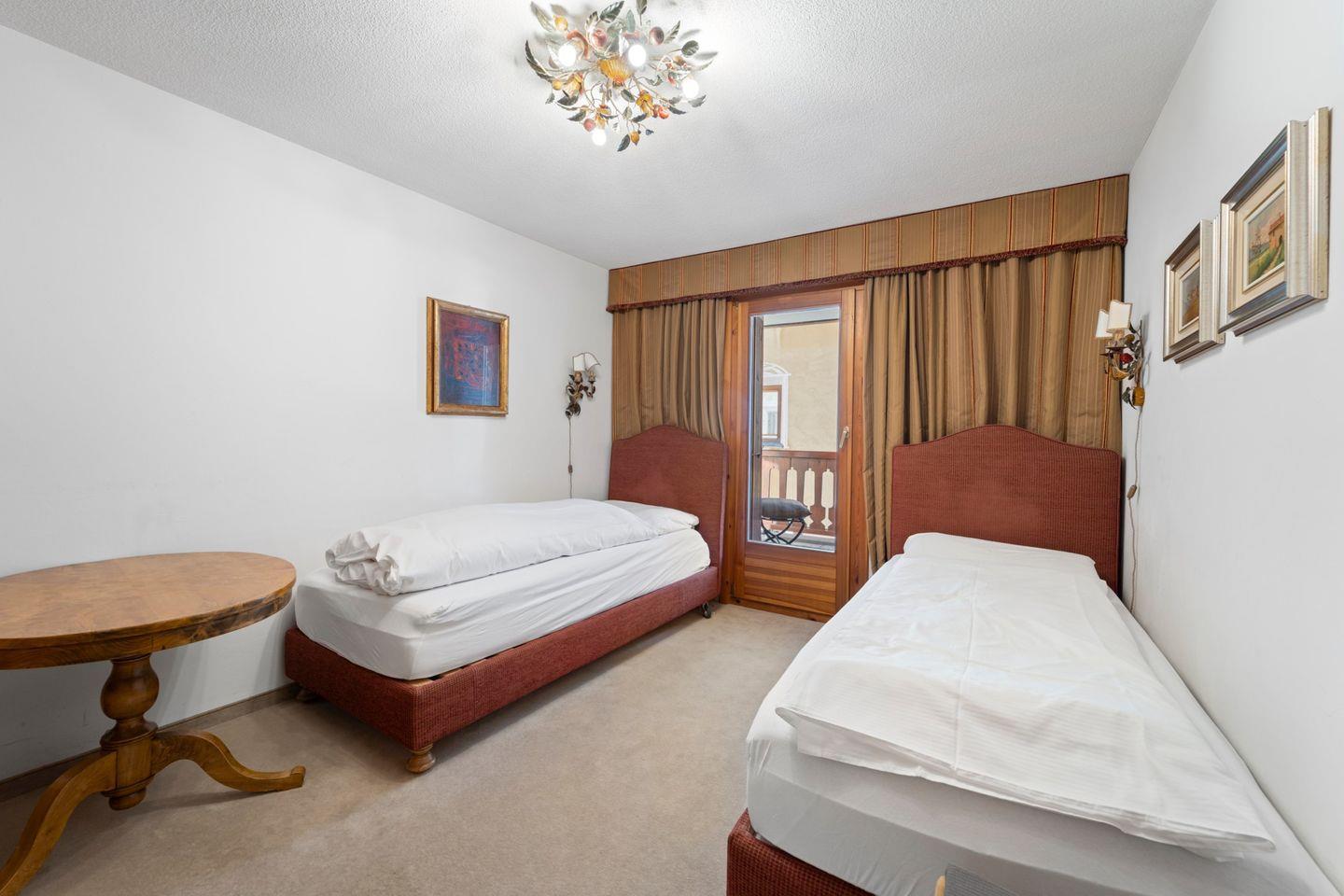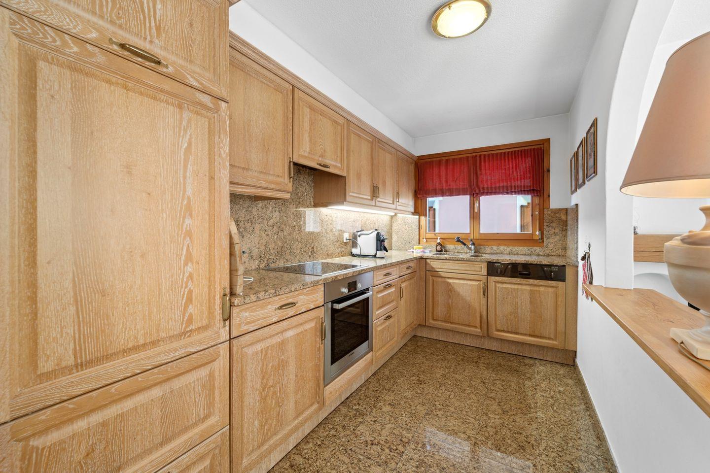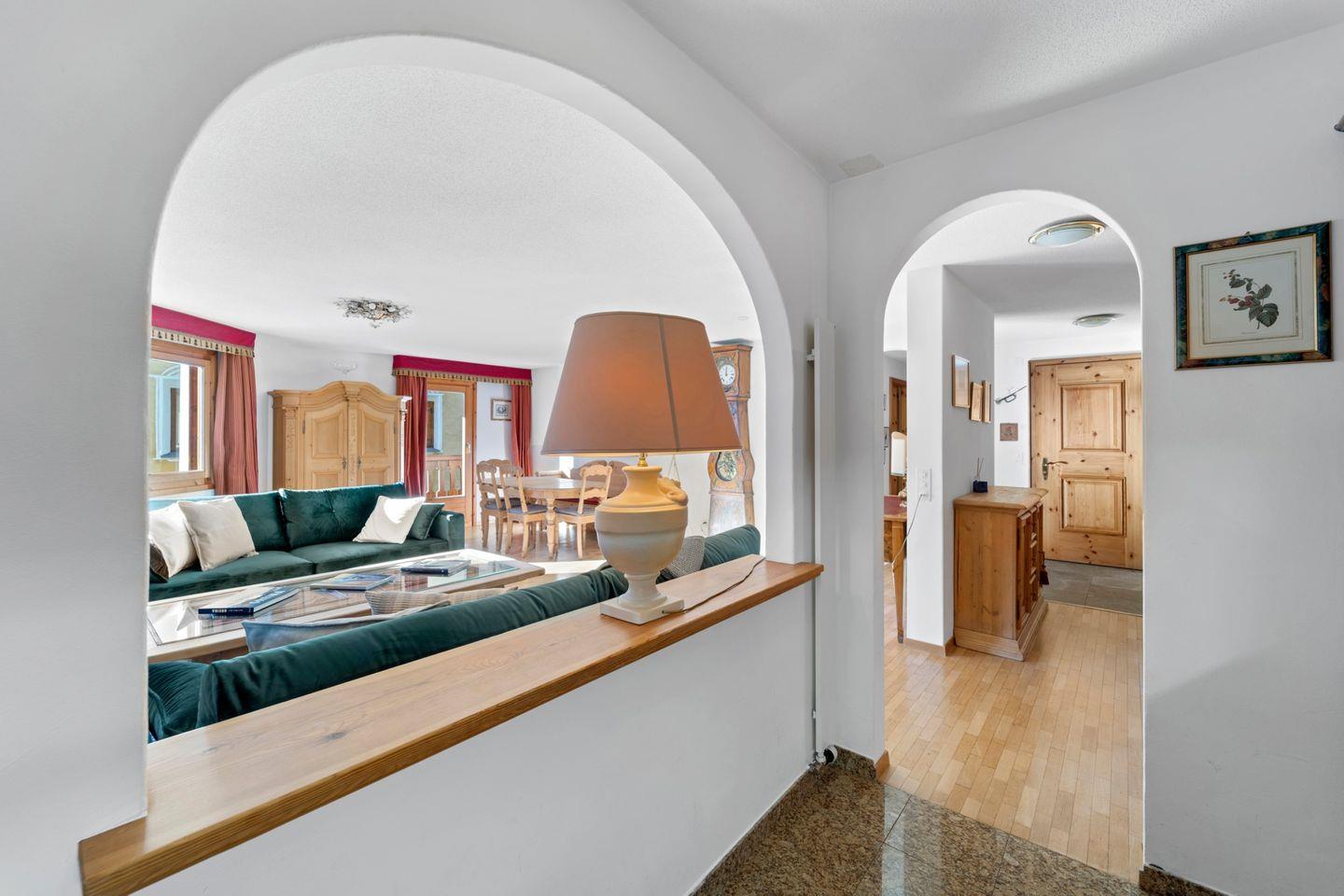 Grosszügige 3½ - ZWG, 1. Stock, ca. 110 m2, an Südlage mit Bergsicht. Wohn-/ Esszimmer mit Kamin, Balkon und TV. Küche halb offen gegen das Wohnzimmer, mit Geschirrspüler und Backofen. 1 Zimmer mit Doppelbett (zwei separate Matratzen). 1 Zimmer mit 2 Einzelbetten. Bad/WC/Bidet/Lavabo. Dusche/WC/Lavabo. Komfortable neue Einrichtung. Garagenplatz. Waschküche und Skiraum zur Mitbenützung. Nichtraucherwohnung. Haustiere sind nicht erlaubt.